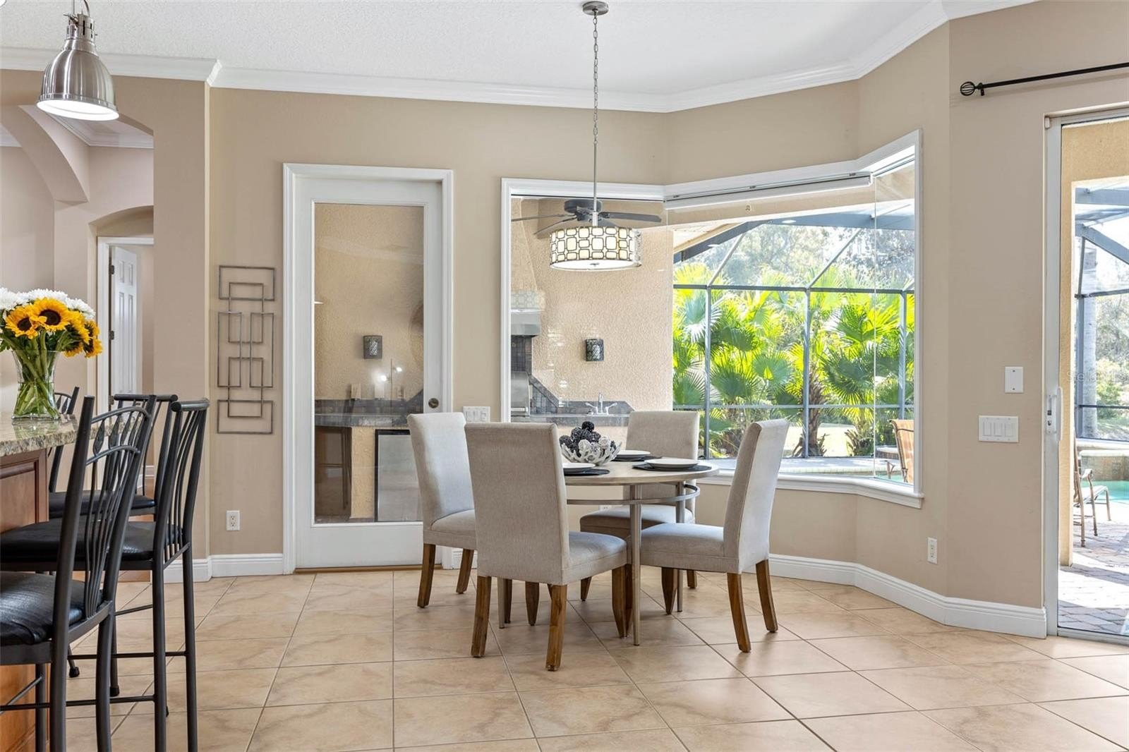 The gourmet kitchen is well-appointed with granite countertops, rich wood cabinetry with accent lighting, a center island with prep sink, breakfast bar seating, and a sunny casual dining area overlooking the lanai and water beyond. Multiple ancillary spaces — including a den and bonus sitting room or library — offer endless possibilities for work, hobbies, or quiet retreat.