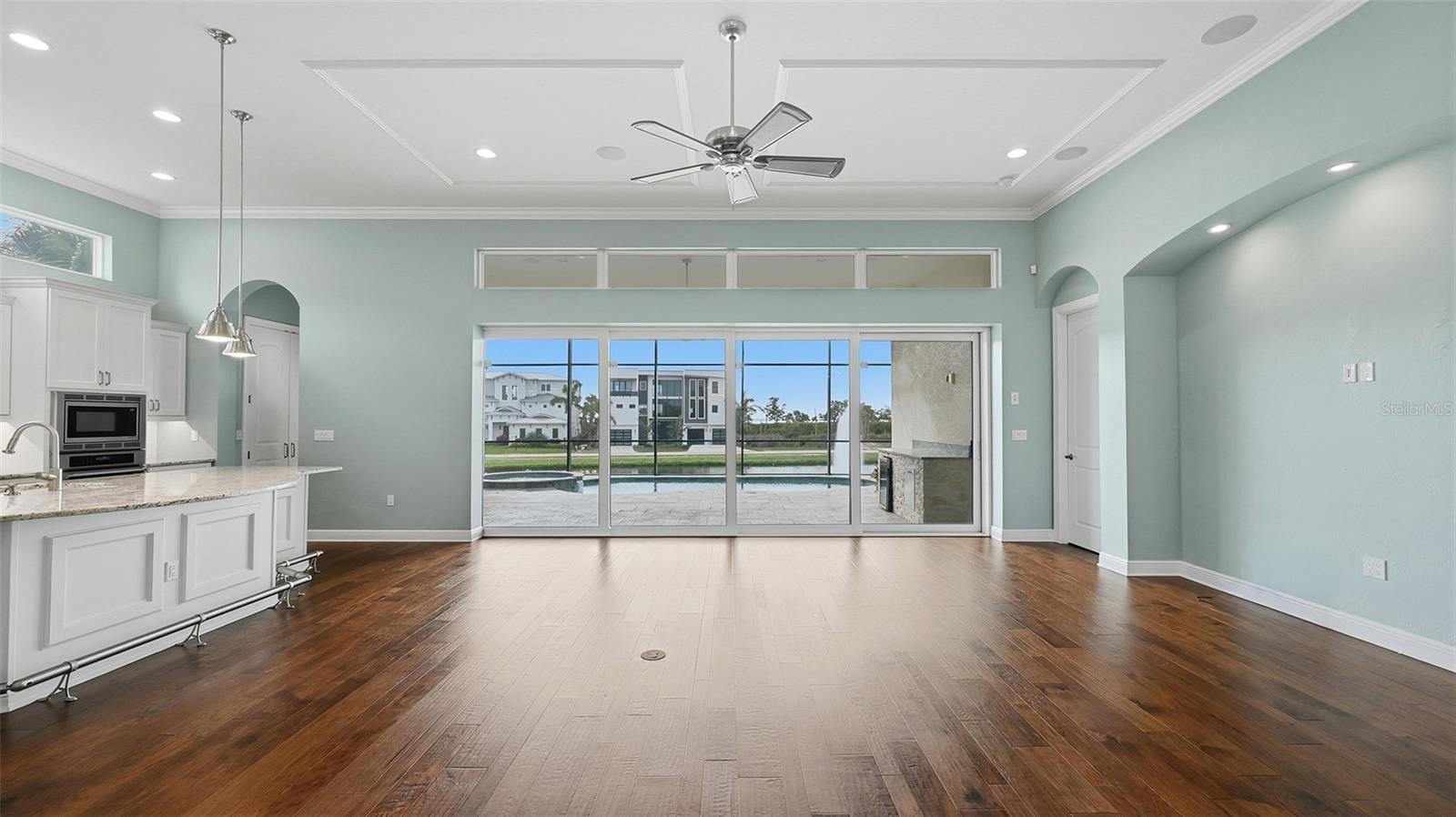 Expansive 12-foot ceilings, elegant tray accents, impact pocketing sliders, and transom windows fill the main living spaces with soft, natural light. Overlooking a peaceful lake, the home offers 3 bedrooms plus a den and a seamless blend of indoor comfort and outdoor enjoyment. Wide plank hardwood flooring, detailed millwork, crown molding, and designer LED fixtures elevate the home’s timeless style.