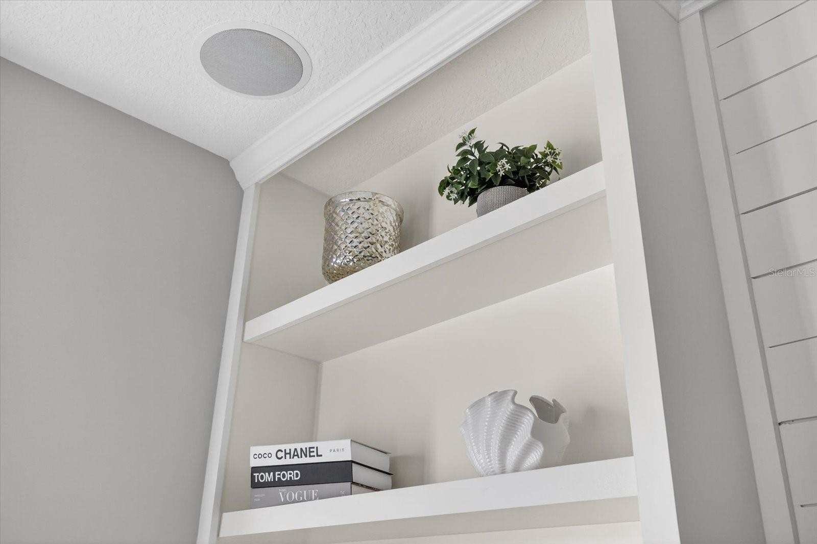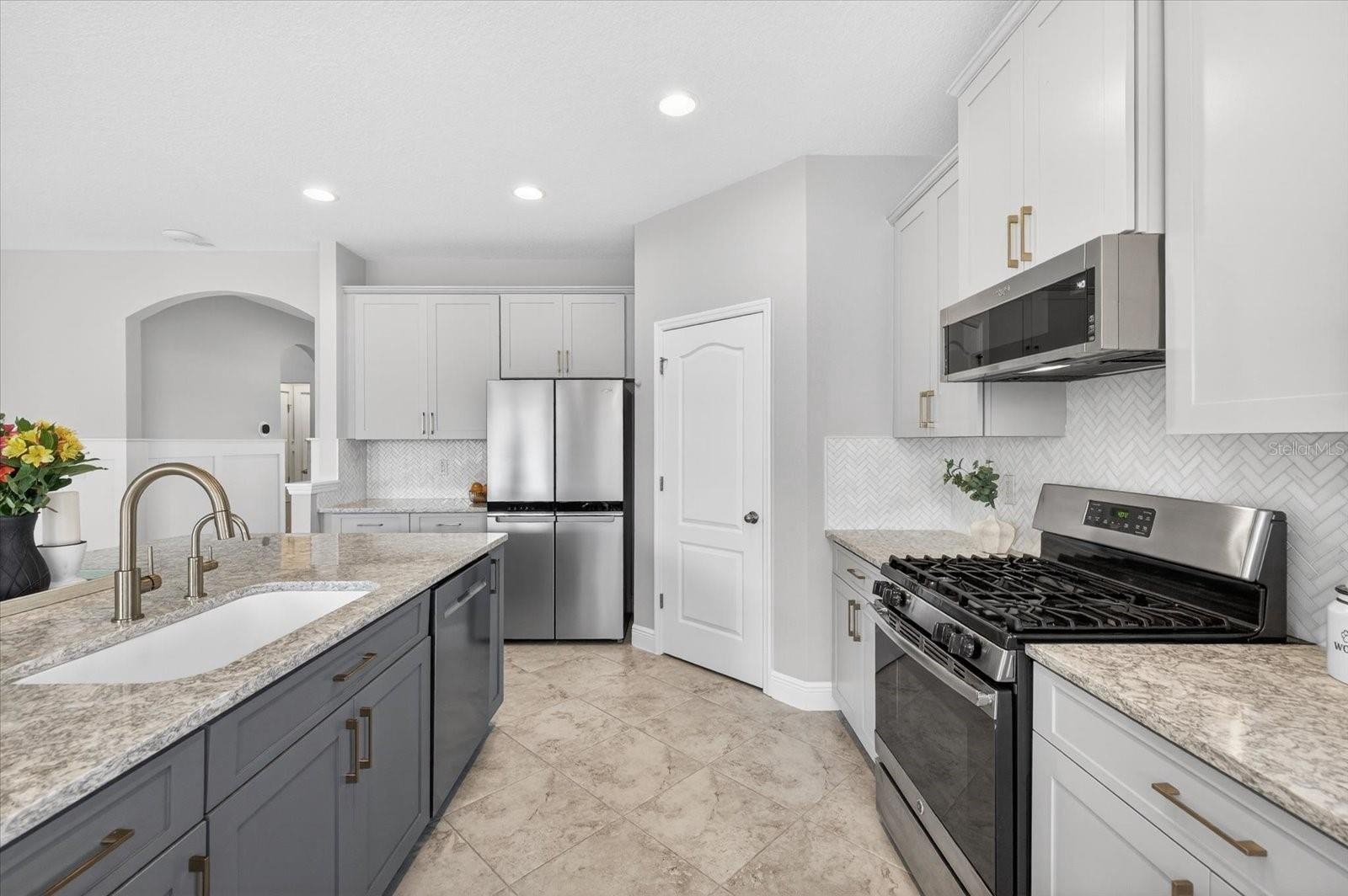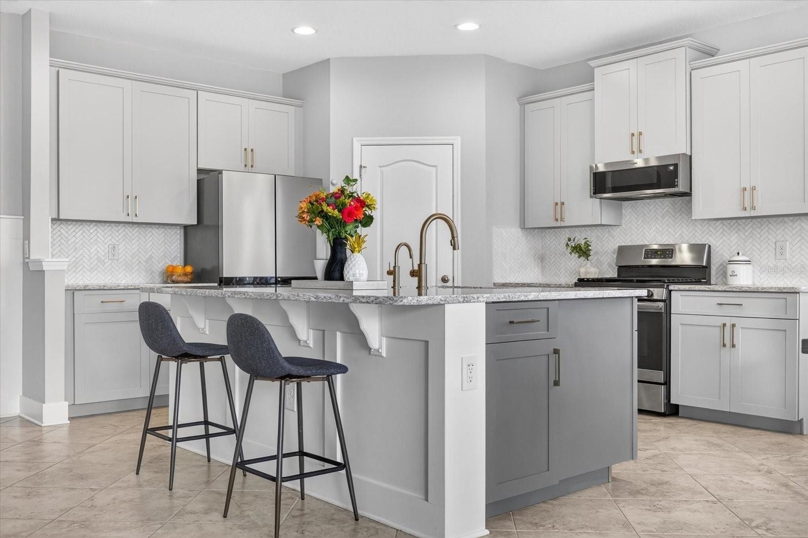 The designer interior continues with elegant wainscoting throughout the hallway (2024) and a custom-built-in entertainment center in the Great Room (2024). The gourmet kitchen boasts durable quartz countertops, marble backsplash, a large center island, and refreshed cabinetry with new faces and hardware (2023). Stainless steel appliances, (refrigerator, microwave, dishwasher) have been replaced within the last two years for total peace of mind.
