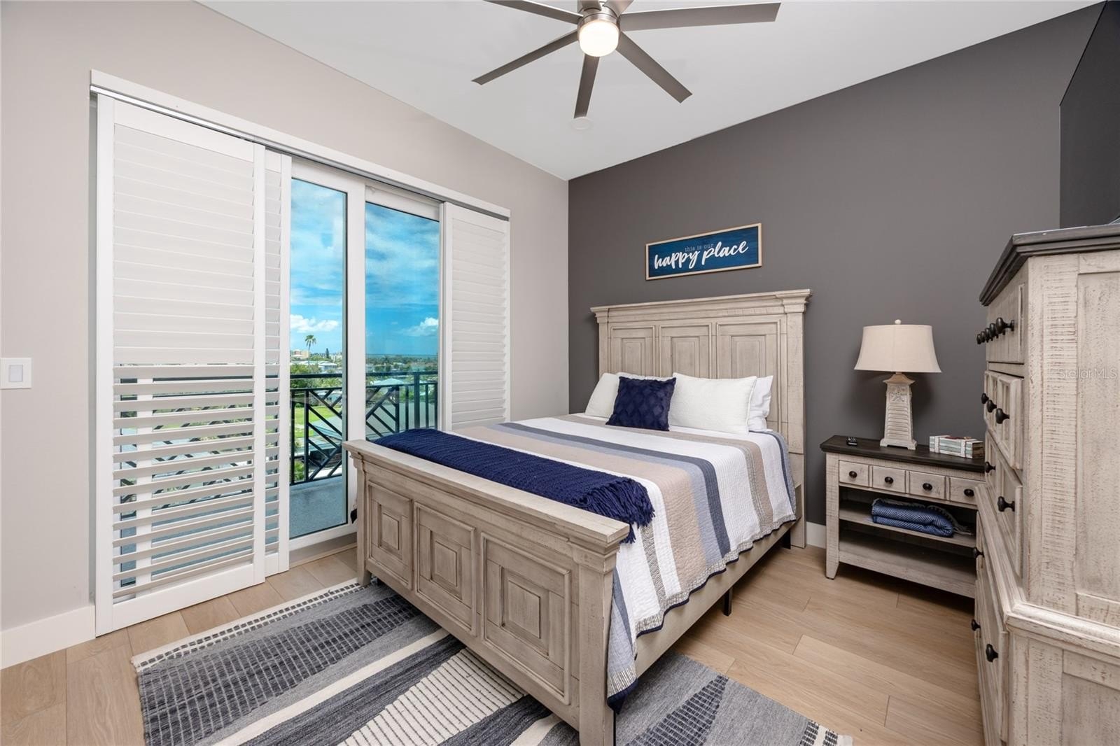 Oversized hurricane-impact sliding glass doors flood the living area with natural light and open to a private balcony with picturesque sunset and harbor views. The primary suite serves as a tranquil retreat, accessed through a modern barn door and offering oversized windows with wood shade shutters, private balcony access, and a spacious walk-in closet. The spa-inspired en suite bath features quartz countertops, dual sinks with a seated vanity, built-in shelving, a private water closet, and a seamless glass walk-in shower with multiple showerheads and an overhead rain feature. A desirable split-bedroom layout provides privacy for guests, with three additional well-appointed bedrooms and a second full bath finished with quartz counters and a tub-shower combination. An in-unit washer and dryer add everyday convenience.