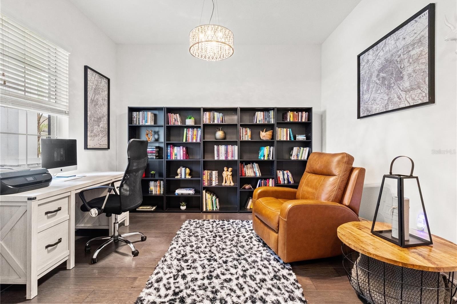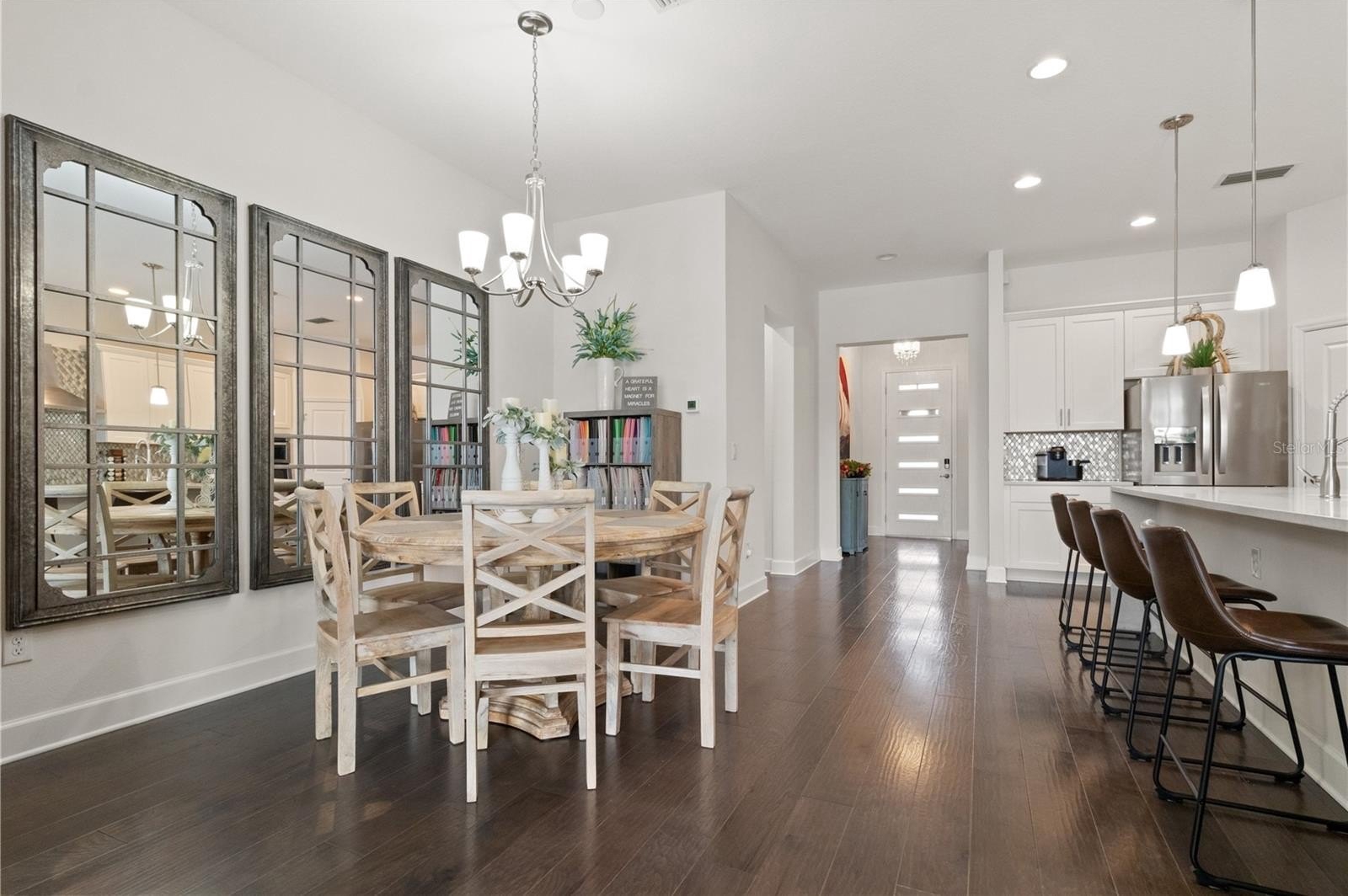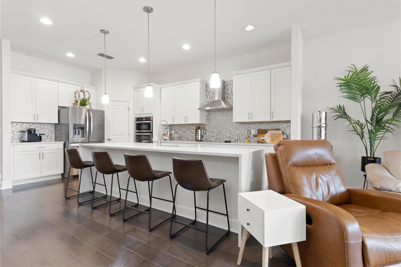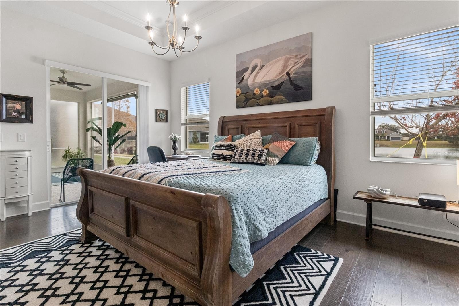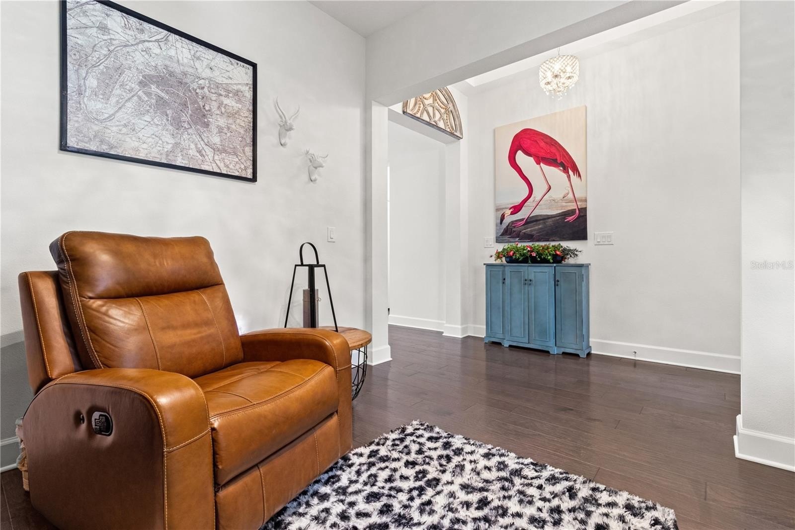Inside, you’ll be welcomed by engineered hardwood flooring throughout and soaring 10-foot ceilings that create an open, airy feel. A versatile front den or office easily doubles as a guest suite for visiting family or friends. The expansive great room opens through sliding glass doors to a shaded, screened-in lanai, the perfect place to relax while enjoying peaceful lakefront views.