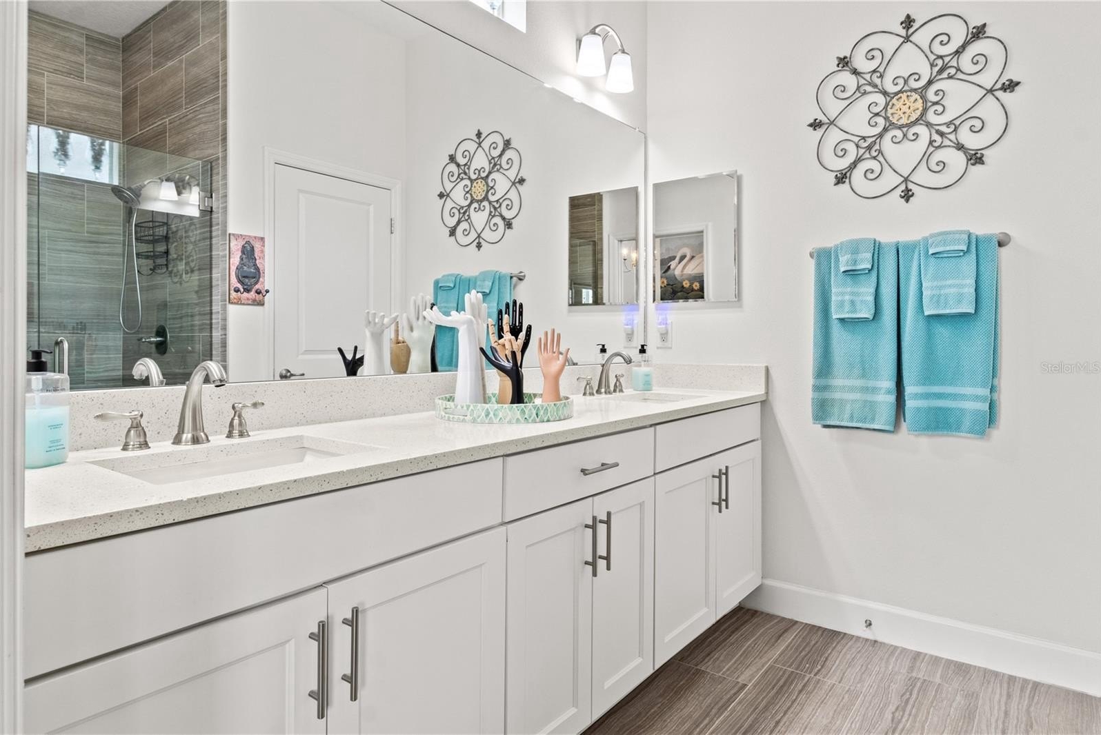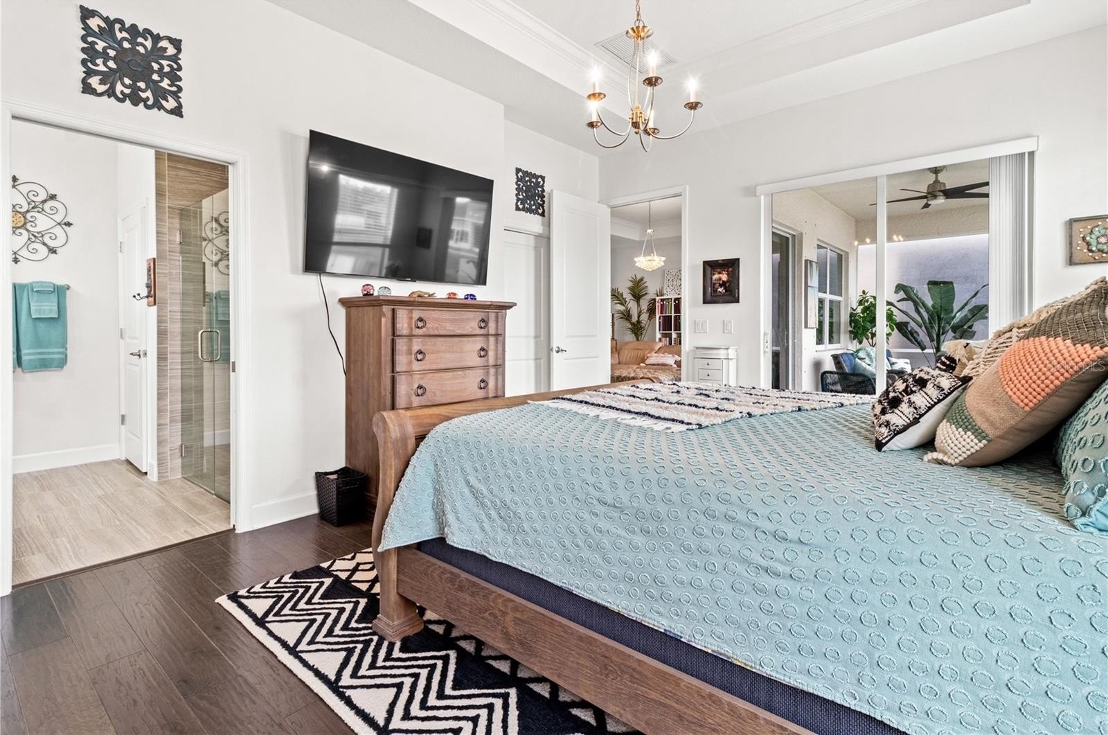 The gourmet kitchen is an HGTV dream, featuring quartz countertops with a waterfall island, built-in double ovens, a smooth cooktop, and designer lighting—ideal for both entertaining and everyday living. The luxurious primary suite offers tranquil lake views, a spacious walk-in closet, and a spa-like custom tile bath designed for total relaxation.