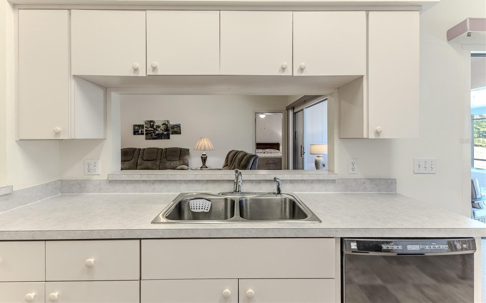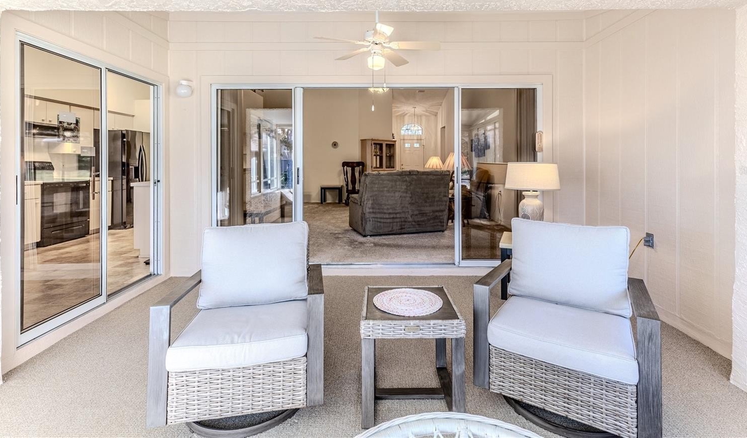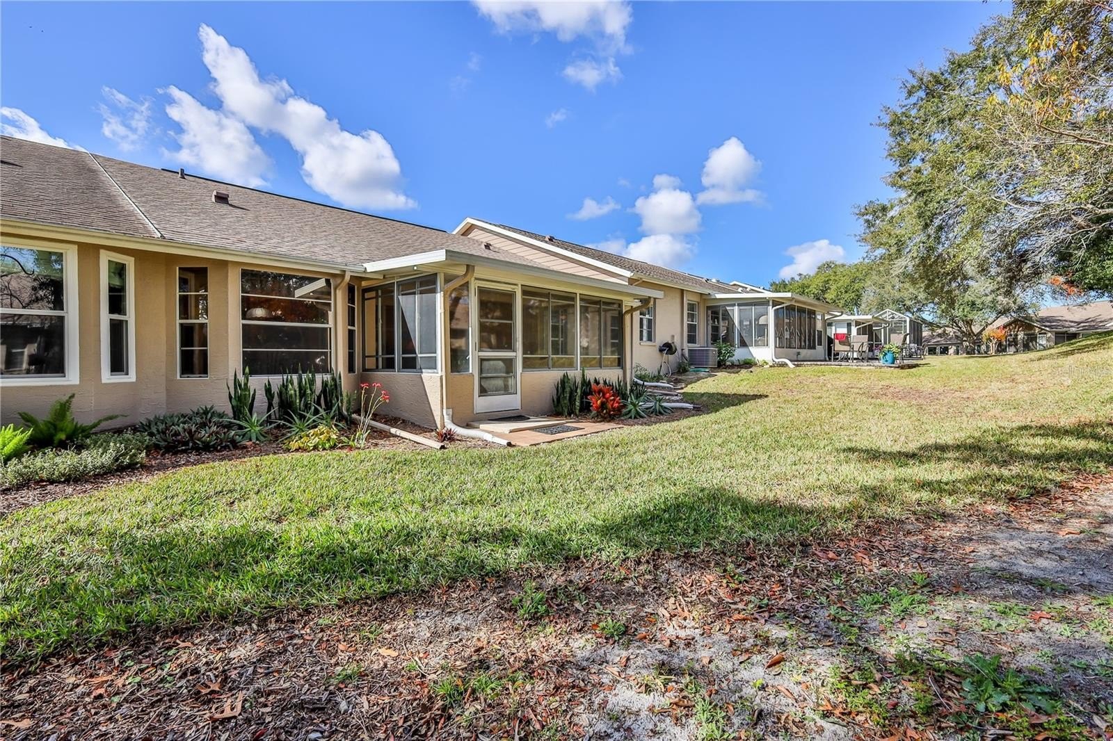 You'll love this beautifully maintained two-bedroom, two-bath villa offering comfort, privacy, and peace of mind with major updates already completed. Vaulted ceilings in the kitchen and living room create an open, airy feel, enhanced by new carpet in the living room and extended lanai (2023). The 14 x 14 enclosed lanai provides generous additional living space and overlooks a wooded common area, offering a tranquil backdrop frequently visited by birds, squirrels, and sandhill cranes. The front of the villa faces an open grassy area, creating a rare and desirable front-to-back green space view. The primary bedroom, located at the rear of the villa, offers two closets and space suitable for a desk or sitting area. The en suite bathroom includes a single sink vanity and a walk-in shower with grab bars.