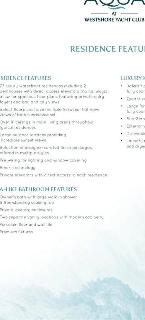 AQUA offers a stunning amenity package… Including free-flowing pools, private resident’s lounge, 3 rooftop sky pools, state of the art fitness, private screening room, pickleball in future phases and so much more! This indulgent lifestyle is all included at AQUA. Combining this with an optional membership to the Bay Club, AQUA stands out as one of the most enviable lifestyles in all of Tampa at a price point that can’t be matched by any other development in the Tampa area! For a limited time, Westshore Group is offering a 1 year membership to the Bay Club included in the price, as well as other incentives. Come and explore our sales gallery and take a tour of the last available site at Westshore Yacht Club… Discover the AQUA difference!