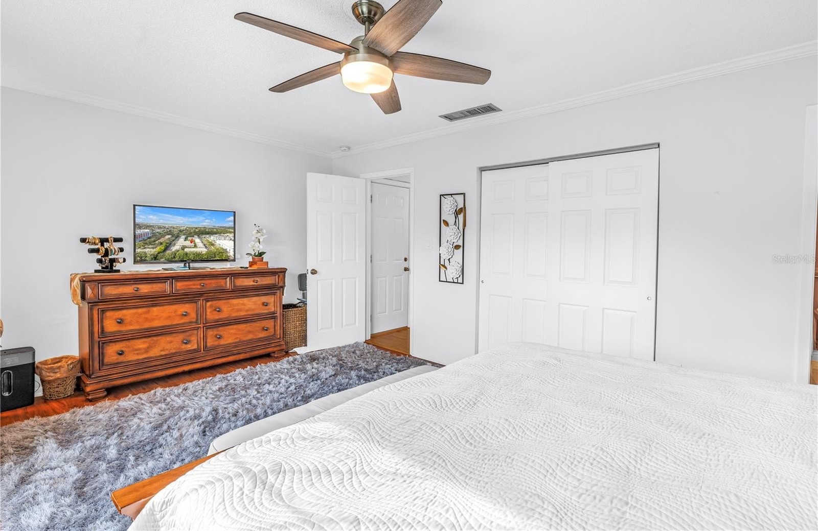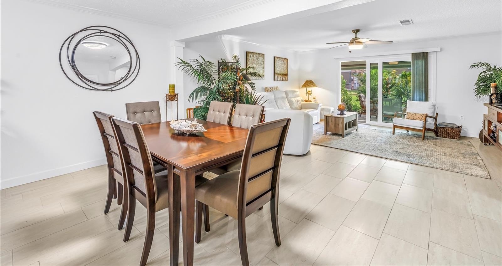 When you step inside this rarely available Patriot Square townhome, you’re immediately welcomed by an updated kitchen that opens seamlessly to the dining and living areas, creating an inviting and open floor plan ideal for both everyday living and entertaining. The remodeled kitchen features granite countertops, custom cabinetry, tiled backsplash, and stainless-steel appliances, while attractive tile flooring flows throughout the entire first level. The dining and living rooms are accented with crown molding, tall baseboards, and impact sliding glass doors that lead to a charming covered and screened lanai. This peaceful outdoor space overlooks tasteful landscaping and a quaint courtyard, the perfect spot to enjoy your morning coffee or unwind at the end of the day. A convenient half bath is located on the main floor for guests, and the washer and dryer have been thoughtfully relocated to a closet under the stairs for added functionality.