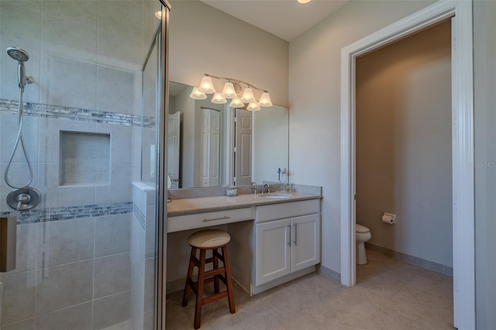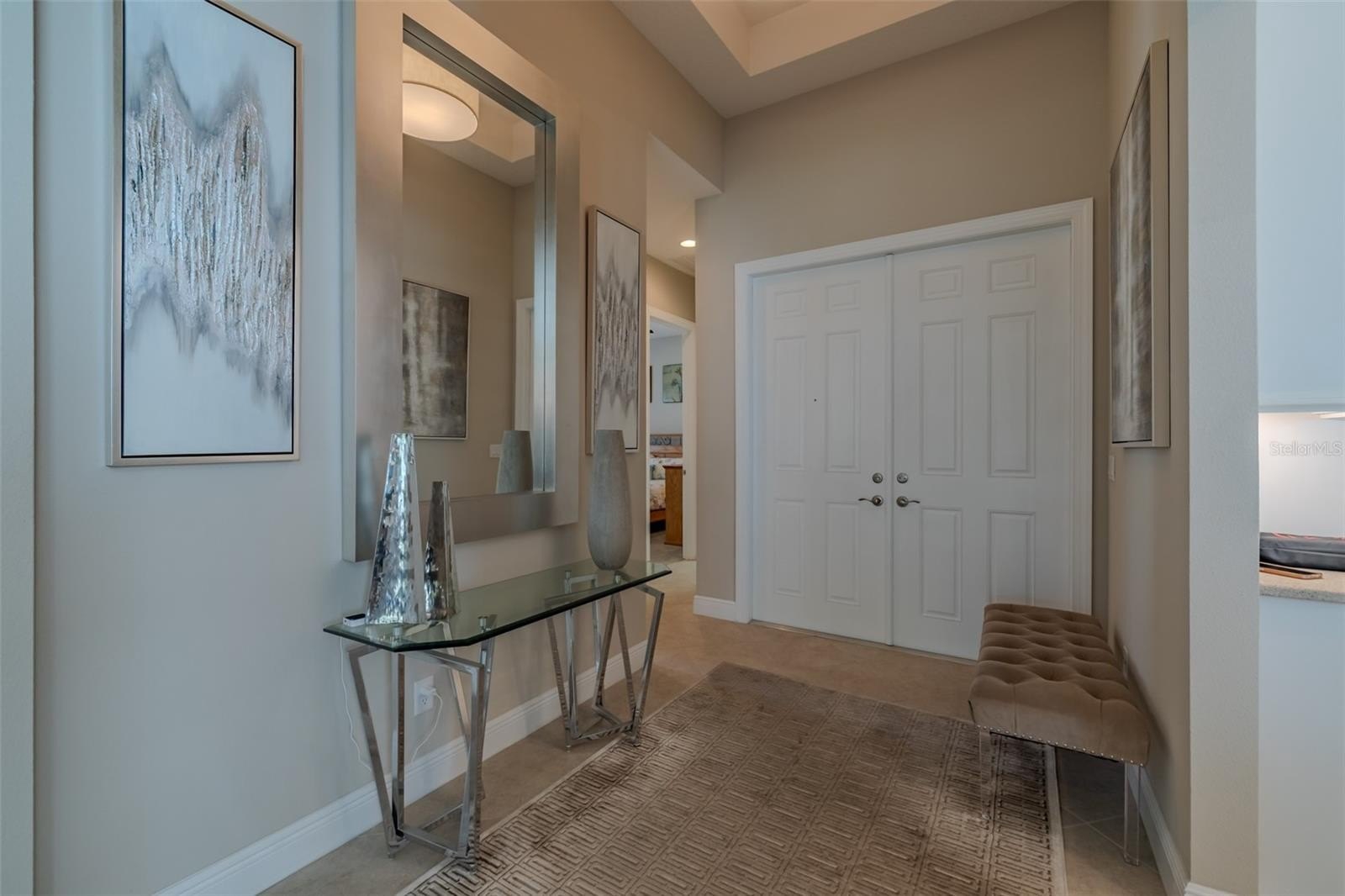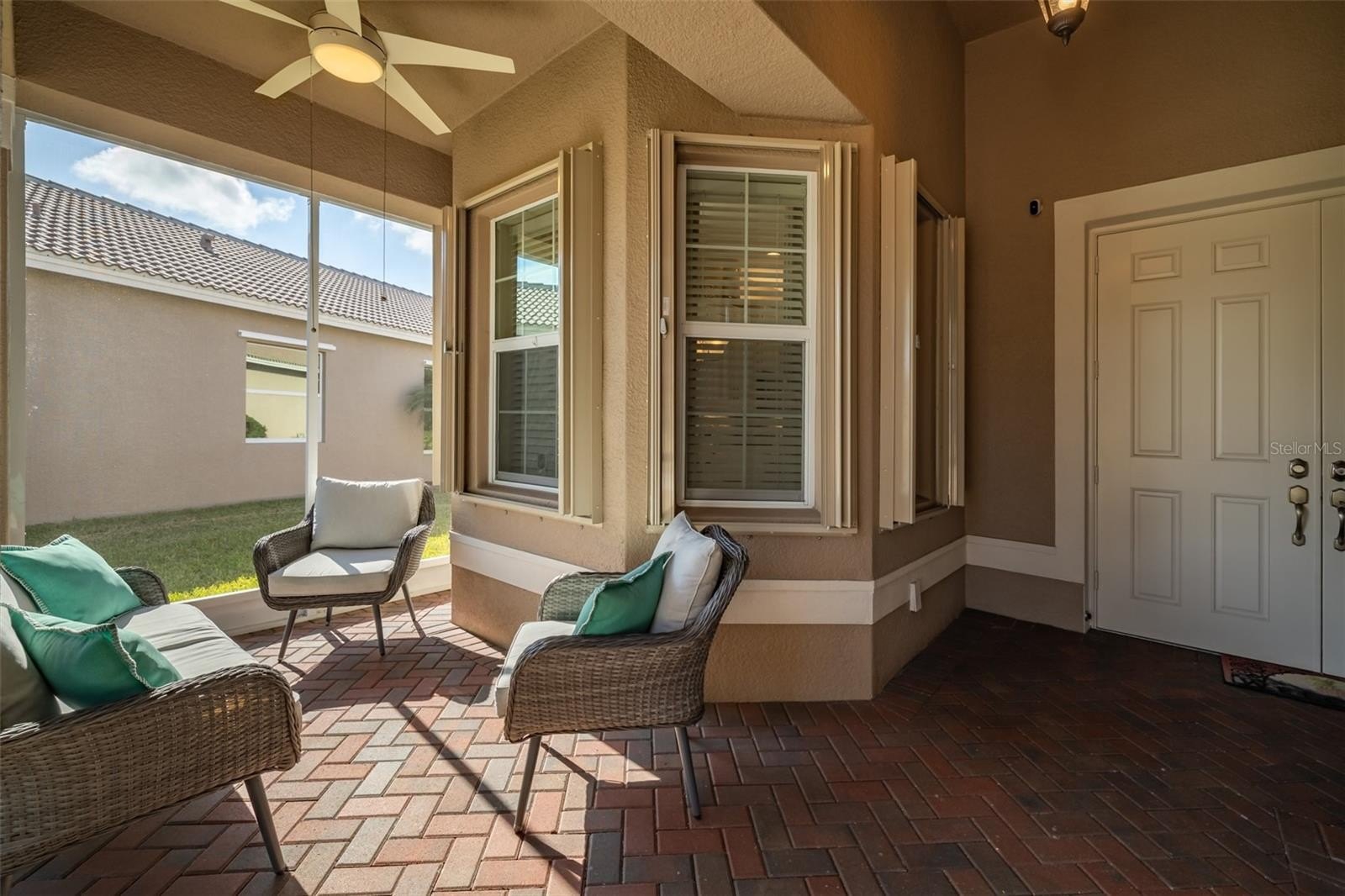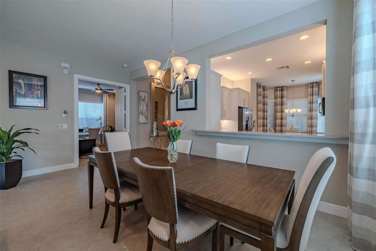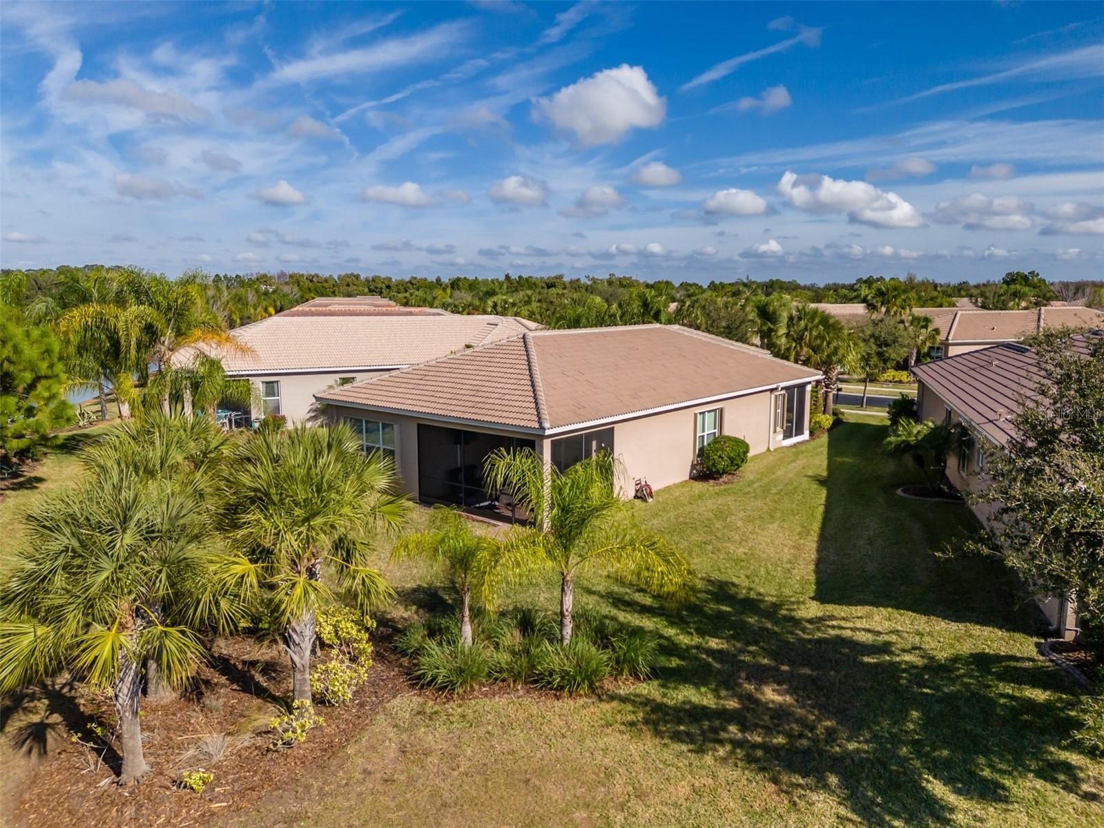 Are you ready for this? Located in Valencia Lakes, Tampa Bay’s premier 55+ Active Adult community, this beautiful CAPRI model with 1870SF, offers three bedrooms, a wonderful open floorplan with an offset water view, and it’s in pristine move-in ready condition. The screened in porch affords a great private space to relax out front and take life in stride. Solid double French doors provide wide access, when desired, to a welcoming Foyer, with its airy 13’ tray ceiling, that provides an impressive view of the open floorplan beyond. 18”x18” ceramic tile on the diagonal capped by 5 ¼” baseboards grace the floors except in two of the three bedrooms which are carpeted. Bedroom 2 is carpeted and lies at the front of the house and provides exceptional comfort and privacy and it features a Design House LEXI 52” LED ceiling fan with satin nickel finish. Bedroom 3 is centrally located in the house and has French double doors, a 6’-wide window, ceramic tile, 4 recessed lights, and a Generation Lighting DISCUS CLASSIC 52” LED ceiling fan. Bedroom 3 also has a closet, but you might decide to use this space as an Office or a Den. Having options is always good, right? The carpeted Primary Bedroom with its 10’-11’ tray ceiling is very generously sized, and its 9’-wide window provides abundant natural light and stunning sunset views. Beyond the two walk-in closets is a beautiful Ensuite Bathroom with two separated quartz vanities, a large walk-in shower with a privacy glass window, and a Water Closet for the commode. The Kitchen is well appointed with a 4’-wide cabinet Pantry with four sliding shelves, GE Profile Stainless Steel appliances, a double sink with a Reverse-Osmosis faucet, solid wood cabinetry including three pot drawers, and substantial oatmeal quartz counters capped by a gorgeous mosaic glass backsplash. And, this Kitchen is big enough for the Sous-Chef too. The adjoining Dinette will be the perfect space for daily or intimate meals. Forward of the Kitchen is a Dining Room that will comfortably accommodate 10 persons. The Great Room anchors the home, and it features a Matrix DÉCOR 72” brushed chrome ceiling fan and 12’ sliders lead to the Lanai. It’s spacious, bright and comfortable. The screened-in Lanai is a great space for outdoor living with its secluded location and beautiful offset water view. The 20’x20’ garage features luxury epoxy floors, two 4’x8’ overhead storage racks, and a Culligan Water Softener system. Accordion shutters are fitted on all windows making storm prep a breeze. Seize the day and make this CAPRI your home and begin living your idyllic life now.
