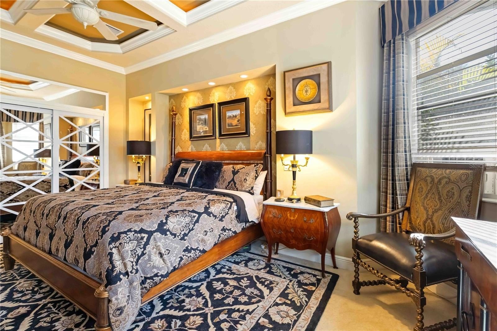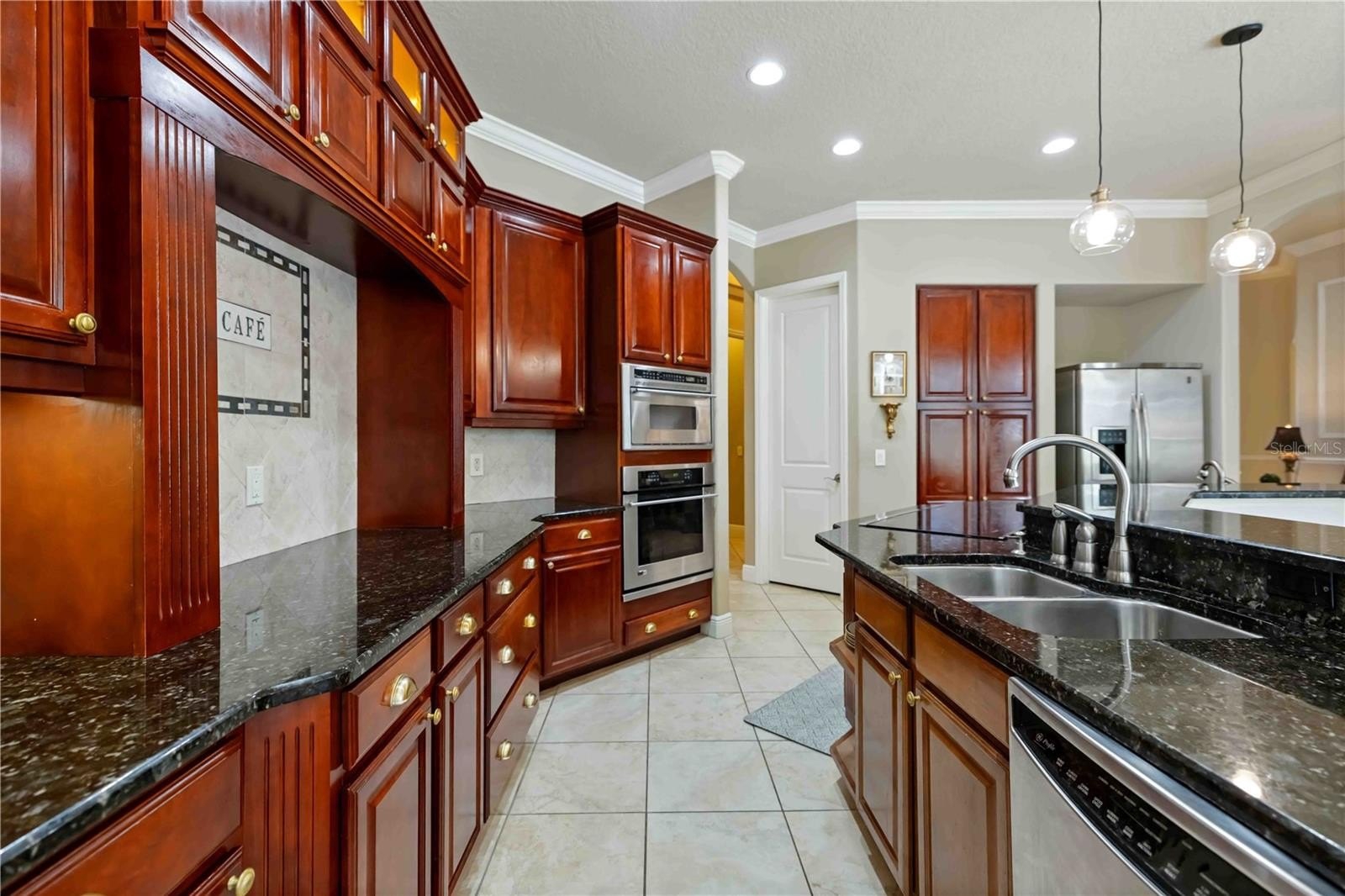 The thoughtfully designed floor plan features formal living and dining rooms, a spacious family room with a wood-burning fireplace, and a dedicated den/office with built-ins. Architectural details include tray and coffered ceilings, tile flooring throughout the main living areas, and abundant natural light. The kitchen offers wood cabinetry, granite countertops, center breakfast bar, dual sinks, walk-in pantry, and is plumbed for gas, making it ideal for everyday living and entertaining.