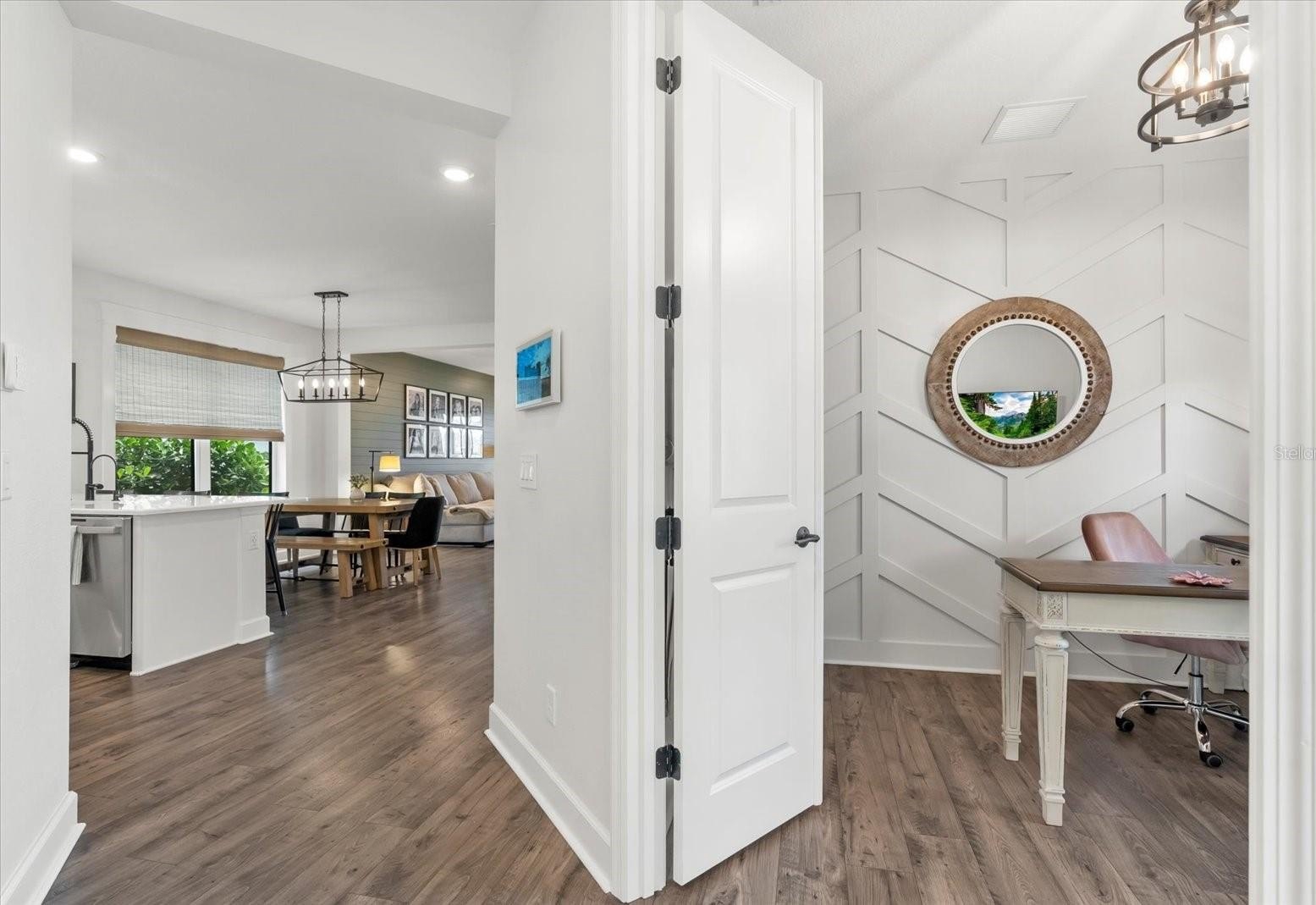 Sliding pocket doors lead to a private, fenced backyard with upgraded landscaping and room to add a pool.