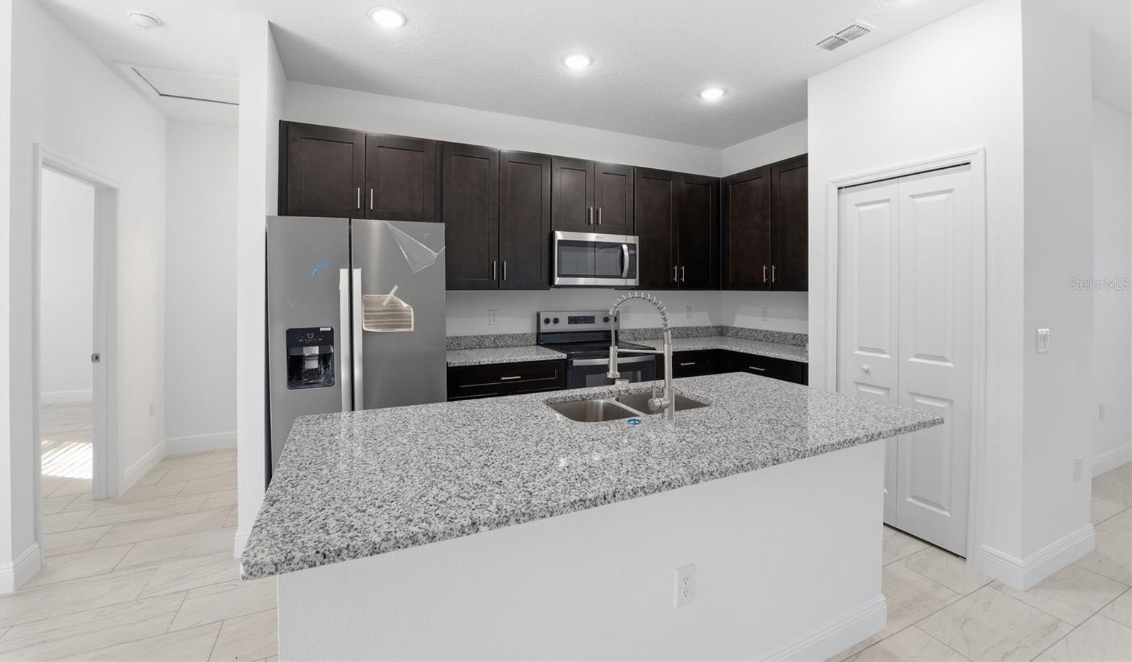 The open-concept floor plan seamlessly connects the living room, dining area, and kitchen, creating a bright, welcoming space ideal for both everyday living and entertaining. The gourmet kitchen is a true highlight, boasting a large center island, stylish cabinetry, and granite countertops, all perfectly complementing the warm and inviting living area.
