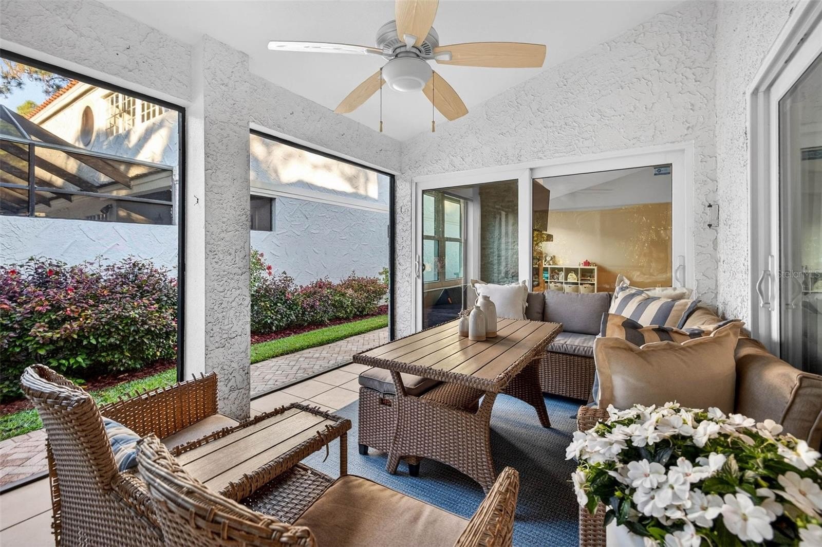 Welcome to Florida living at its best! This beautifully maintained one-level home tucked inside the sought-after Vizcaya community of Feather Sound—where comfort, convenience, and dream Florida living come together effortlessly. The perfect marriage of low maintenance, convenience and comfort, this elevated 3-bedroom, 3-bath home offers 2,094 sq ft of perfectly designed living space! Soaring vaulted ceilings, abundant natural light, and a warm, open feel --this is the one! The abundant living space centers around a stunning updated fireplace with stone, mantle, and marble hearth—perfect for cozy evenings or hosting friends. The thoughtful layout includes large bedrooms offering space to unwind , split floorplan and ample storage. The oversized primary suite is the thing dreams are made of: tall ceilings, sliding doors to the patio, soaking tub, walk in shower, double vanities and TWO separate walk in closets! The kitchen flows seamlessly into the dining and spacious living areas, ideal for holidays, game days, and casual get-togethers. The flex/bonus space can act as a breakfast room, second dining, office or play room while the two car attached garage with electric vehicle outlet is ideal for storing your hobbies. Laundry is a breeze with your indoor air conditioned laundry room. Step outside to the screened lanai, where morning coffee and cool evening breezes become part of your daily rhythm. Your private backyard is perfect for low maintenance living and your furry friends.