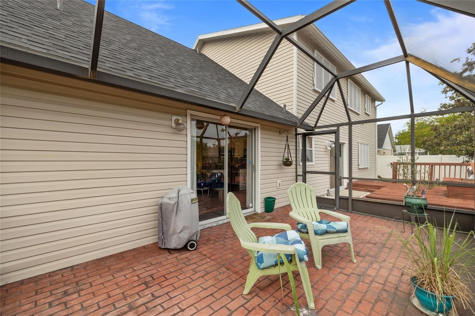 Tucked away in Hunters Grove, this beautiful traditional brick home offers the perfect blend of comfort, privacy, and convenience. Ideally located just minutes from Sarasota-Bradenton International Airport, UTC Mall, world class beaches, and with easy access to I-75, you're close to it all even though you feel miles away. One of the first things you'll notice when you drive to the property is the pride in ownership, with the well-manicured lawn, NEW ROOF, and a wonderful location on a cul-de-sac. As you step inside, you’re welcomed by soaring cathedral ceilings, BRAND NEW laminate flooring throughout, FRESH PAINT, and a thoughtfully designed layout that feels both open and cozy. The spacious living areas flow effortlessly, making the home ideal for everyday living as well as hosting family gatherings and celebrations. A charming bar area and formal dining room set the stage for memorable meals and holidays with loved ones. The bright kitchen is tastefully designed with white cabinetry, granite countertops, modern appliances, and beautiful Spanish tile floors and backsplash. An inviting eat-in breakfast area opens through sliding glass doors to a screened lanai, seamlessly connecting indoor and outdoor living. Outside, the backyard and deck provide a peaceful retreat—fully fenced with a 6-foot privacy fence, ideal for children, pets, or quiet relaxation. Additionally, there is a separate laundry room downstairs! Upstairs, the expansive primary suite serves as a serene escape, thoughtfully tucked away from the main living areas. This space is massive, and could even be divided into two bedrooms, making the home a four-bedroom house. The en-suite bath features dual sinks, a separate water closet, and a tub/shower combination, while the oversized walk-in closet offers exceptional storage—nearly large enough to be its own room. The additional spaces offer flexibility for guests, a playroom, or a home office. There is no shortage of storage space, as the entire space above the garage is open for storage, accessible through pull-down stairs in the garage! Recent updates include a new roof (2023), new laminate flooring throughout, a new AC, and a brand new dryer, adding peace of mind for years to come. The home is NOT IN A FLOOD ZONE! Located on a quiet cul-de-sac with low HOA fees and no CDD, this warm and welcoming home truly has it all. Schedule your showing today!
