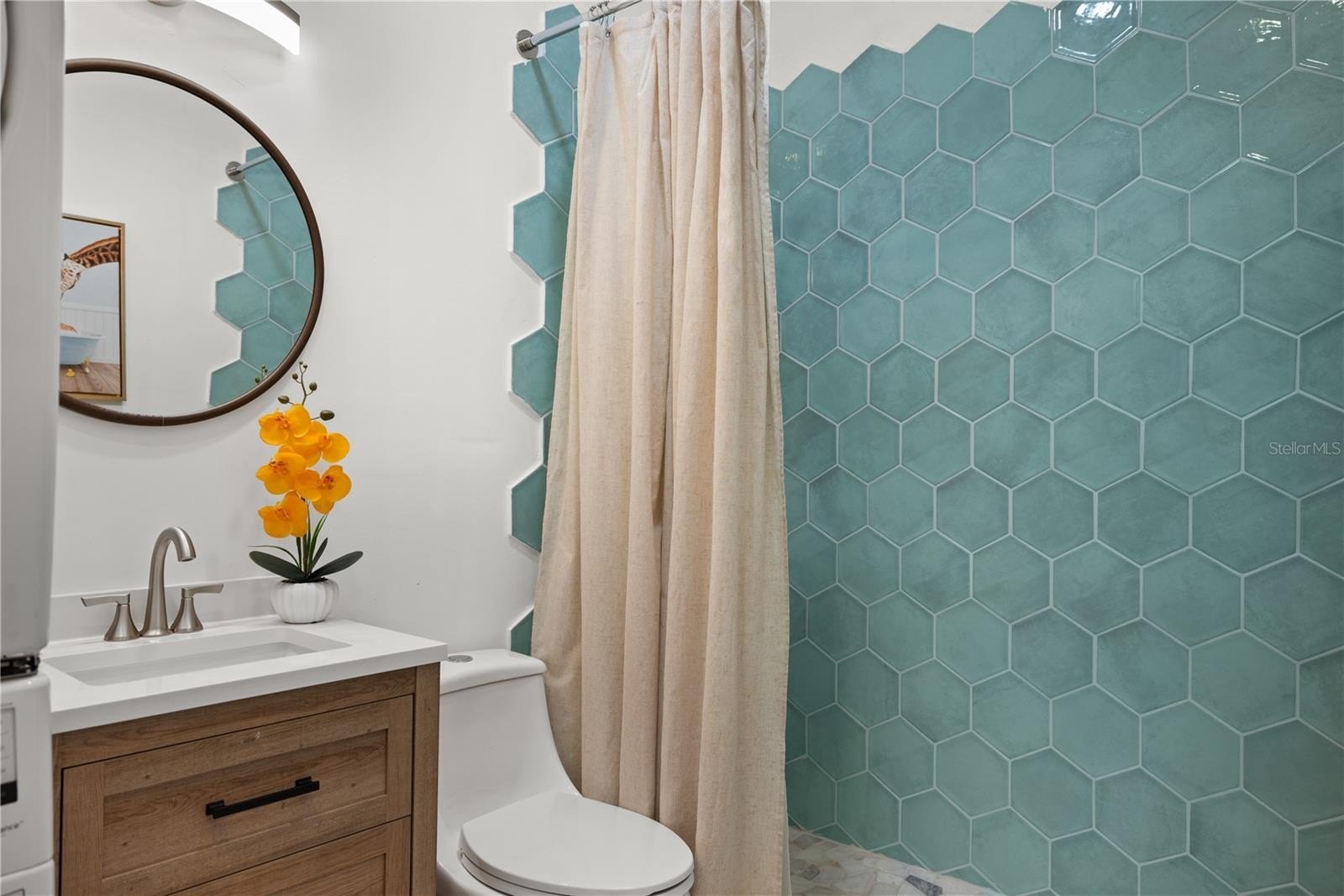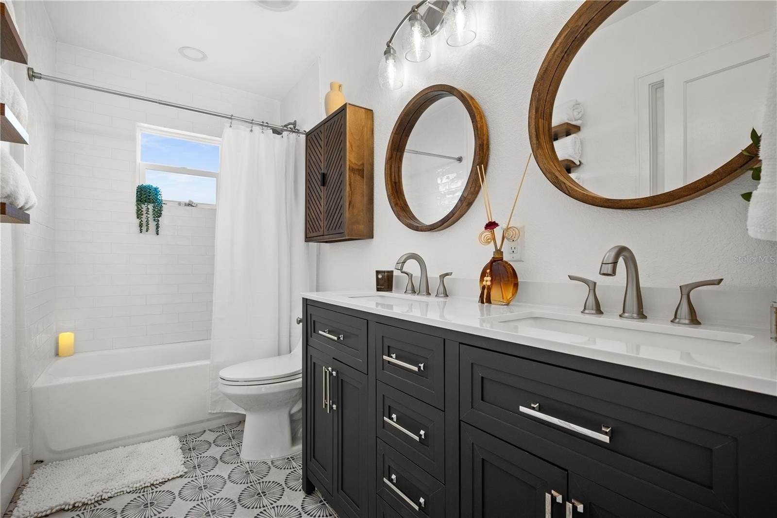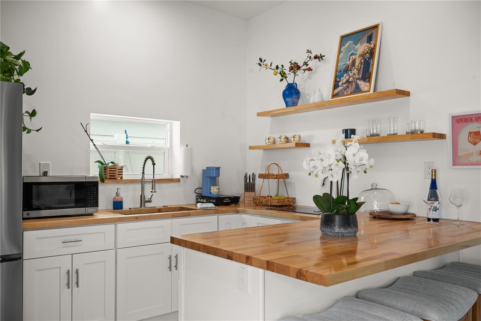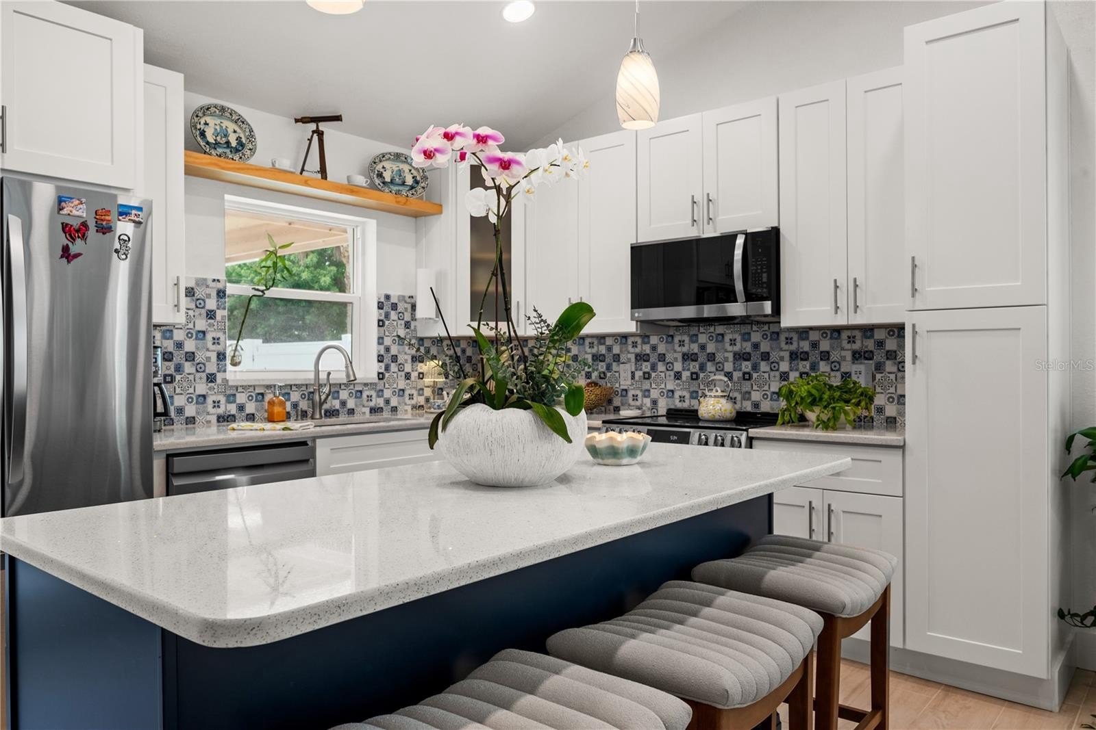 Step into this beautifully reimagined Greek Mediterranean-style home, thoughtfully and completely updated in 2024. Every detail has been elevated, featuring a brand-new roof, impact windows, updated walls, tile flooring, and a new A/C system for modern comfort and peace of mind.The light-filled interior boasts vaulted ceilings and a designer kitchen with new custom cabinetry, stainless steel appliances, and elegant quartz countertops—perfect for both everyday living and entertaining.