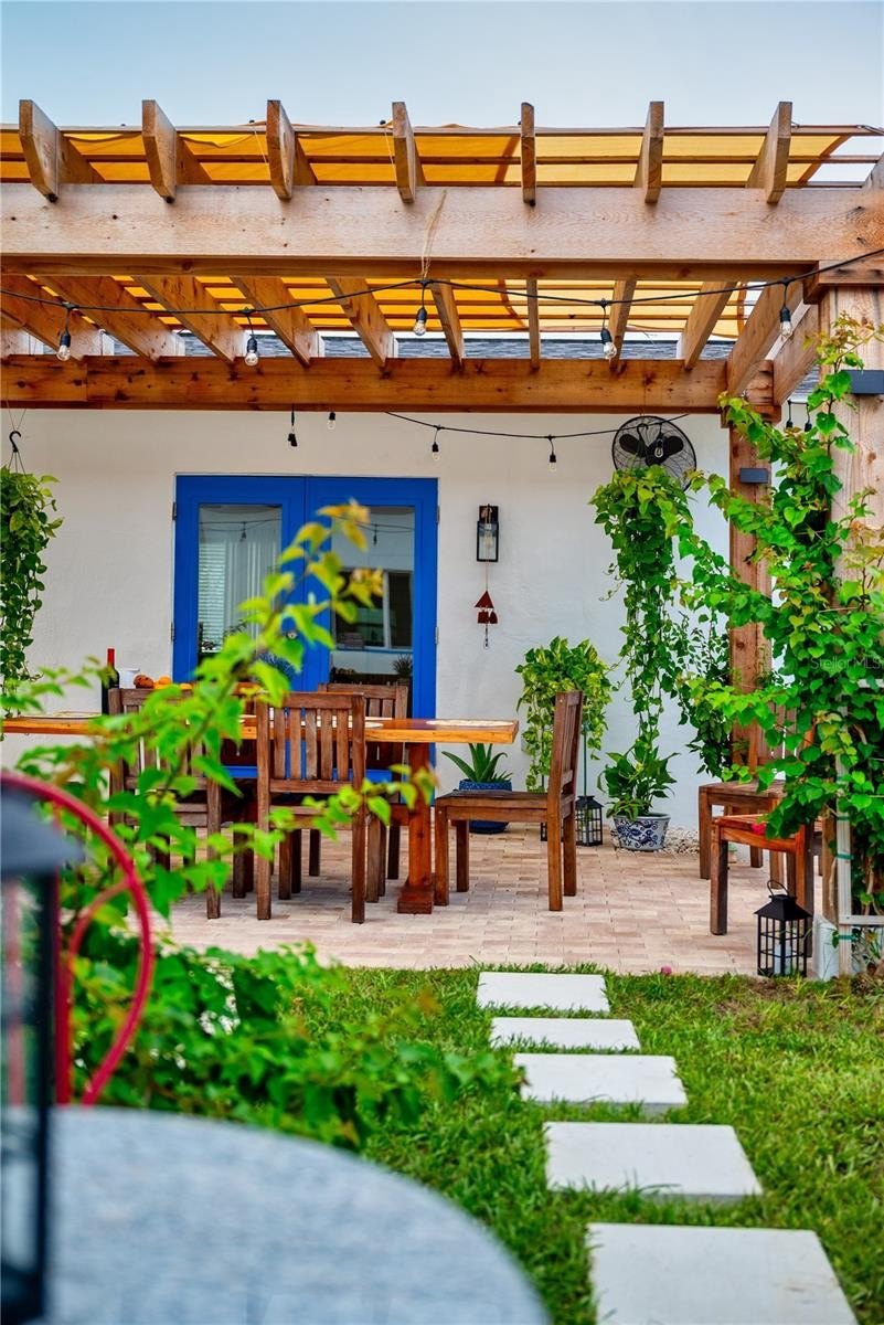 French doors open to a private backyard oasis, where a charming pergola shelters a teak dining table and chairs. Enjoy outdoor living at its finest with a built-in grill and sink, pavered porch, new fencing, additional teak outdoor furnishings, and a tranquil water feature.