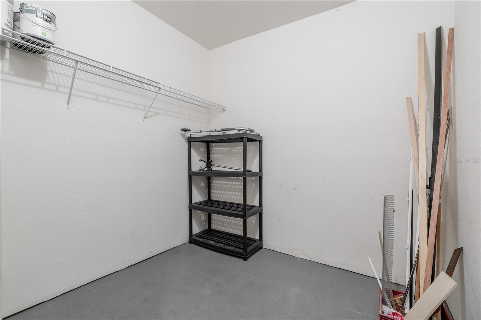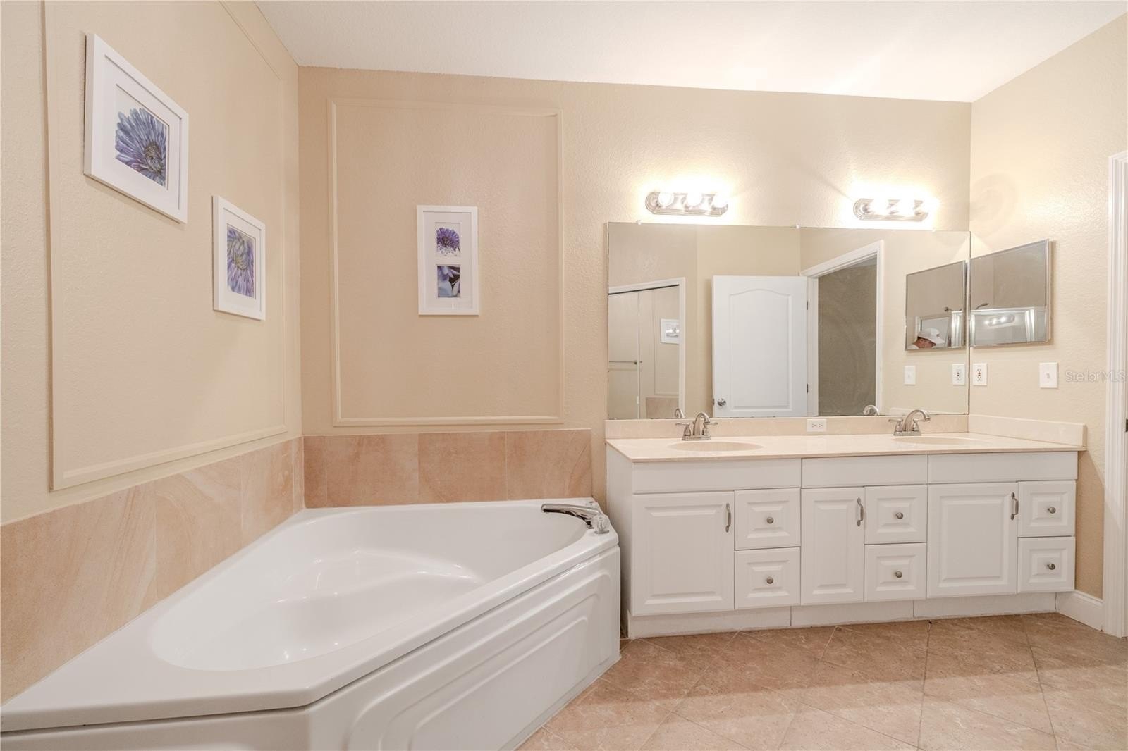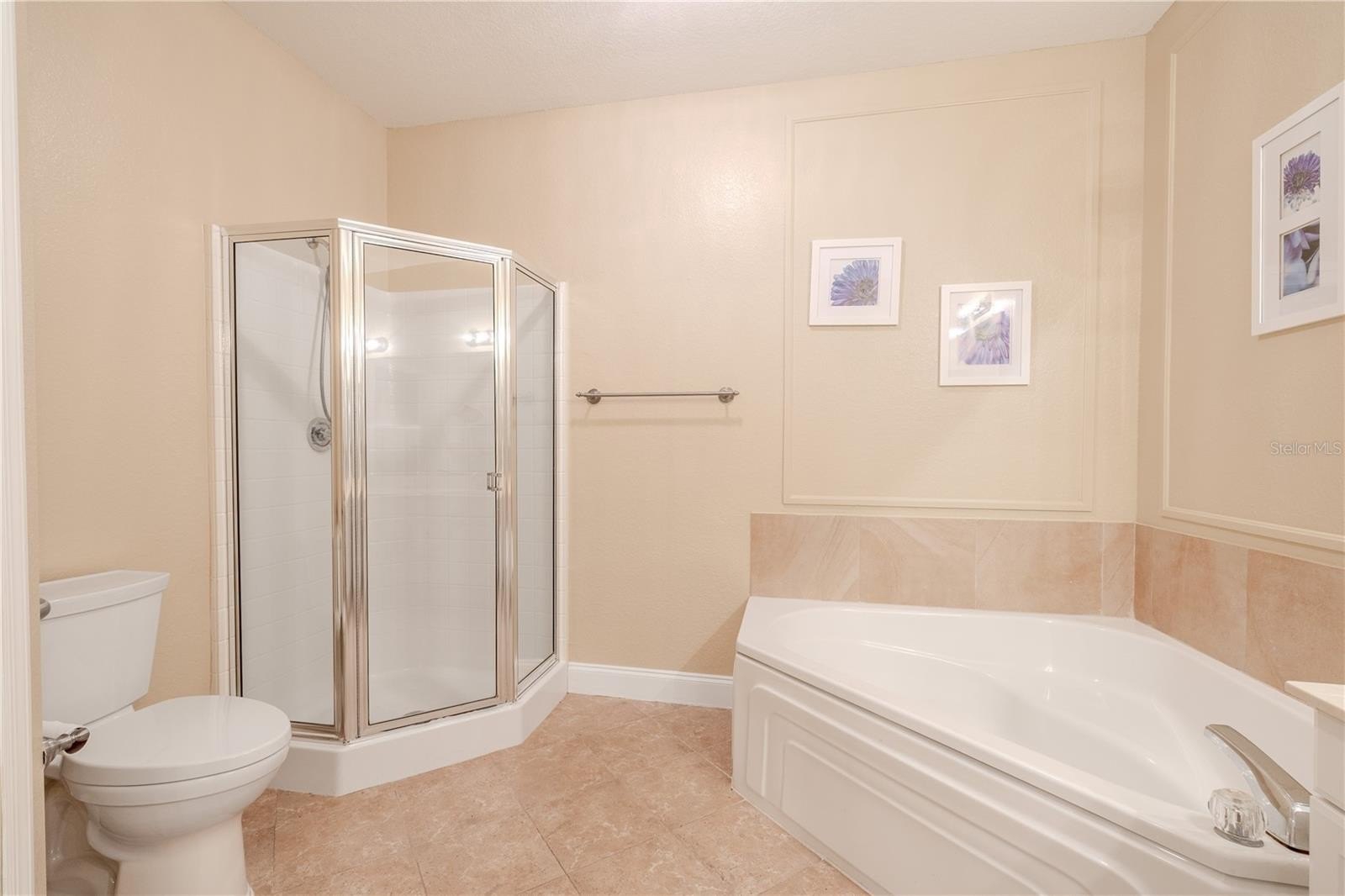 The primary suite is spacious and private, featuring tile flooring, a Harbor Breeze ceiling fan, and direct access to the screened terrace. The ensuite bath includes a long double-sink vanity with solid-surface counters, ample storage, a soaking garden tub, and a separate enclosed shower. The spacious walk-in closet offers wire shelving and a built-in Bunker Hill wall safe.