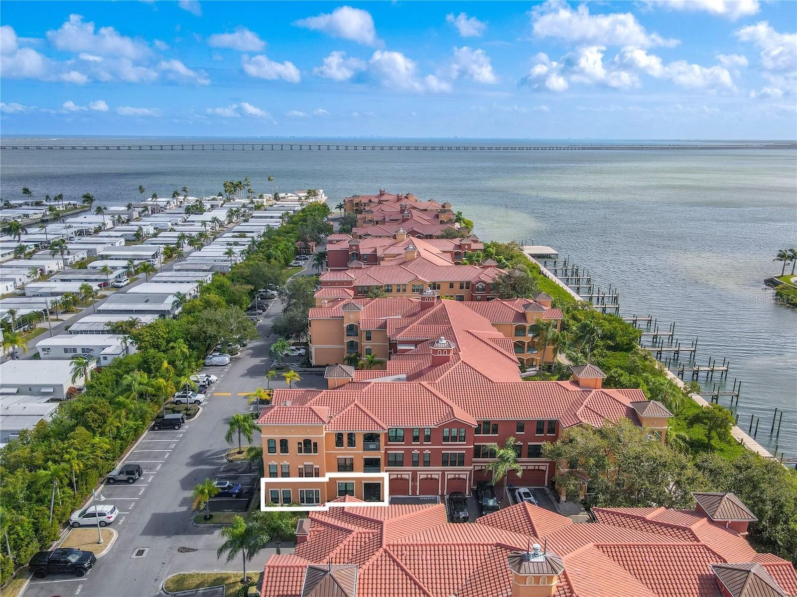 MUST SEE this condo, located within the gated, waterfront community of The Grand Bellagio at Baywatch, this meticulously maintained first-floor corner Frascati floor plan offers 2 bedrooms, 2 full baths, and a versatile bonus room. The residence includes an assigned parking space #204 and a private storage unit (S-109) conveniently located across the hall, offering approximately 52 square feet with 9’4” ceilings—ideal for organized, accessible storage. Inside, the layout is thoughtfully designed with a three-way split floor plan, positioning the primary suite, 2nd bedroom, and bonus room for privacy, while the living, dining, and kitchen areas anchor the center of the home. Large format tile flooring is laid throughout the home and crown molding runs throughout the main living spaces! The living room features a built-in gas fireplace and a built-in entertainment center, creating a comfortable focal point for everyday living and entertaining. The dining area is well defined and flows seamlessly into the kitchen, which offers warm wood cabinetry, dark granite countertops, elegant tiled backsplash, raised breakfast bar, a large closet pantry, and stainless steel appliances, including a smooth-top range, microwave, dishwasher, and refrigerator with indoor water and ice. A glass door provides easy access to the screened terrace with 4x4 pavers, shared with the primary suite.
