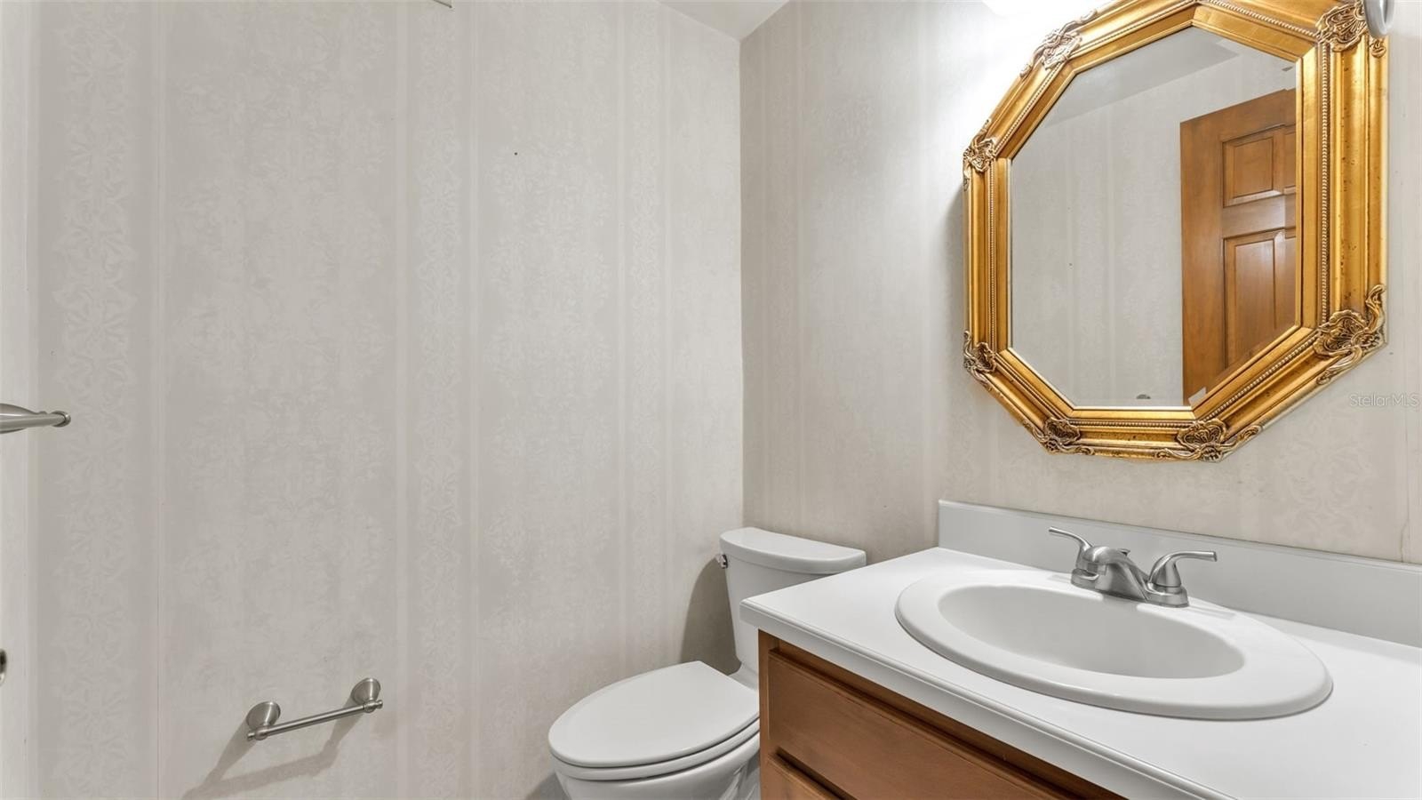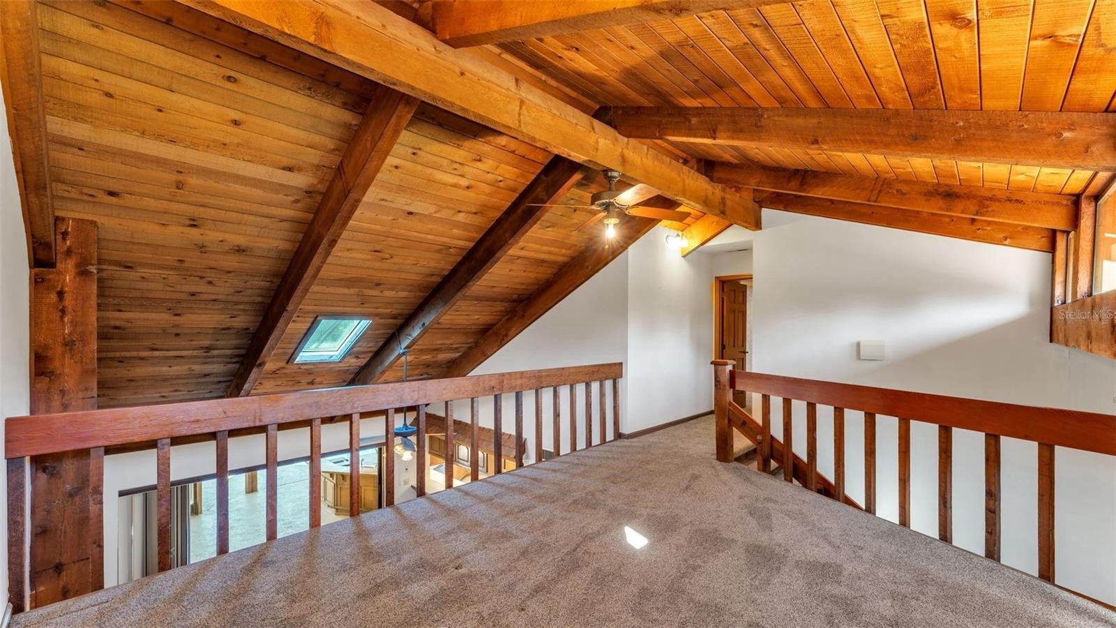 The upstairs primary suite offers a private retreat, featuring a sliding glass door that opens onto a deck overlooking the pool, creating a peaceful space to unwind while enjoying elevated views of the outdoor living area. The spacious primary bathroom is equally impressive, with an updated, oversized tile and glass shower and generous room that adds to the suite’s comfort and appeal.