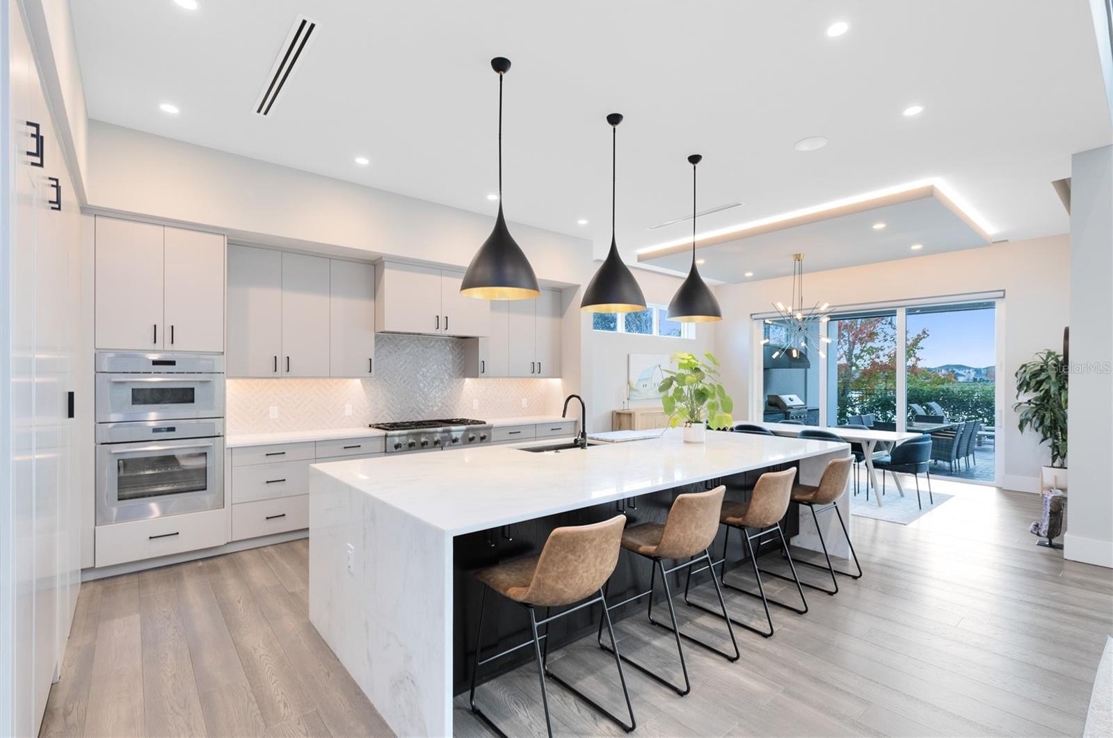 Oversized sliding doors open to an expansive covered lanai with wood paneled ceilings, recessed lighting, and ceiling fans. The private backyard is a resort style retreat with a sleek custom pool and spa, expansive paver decking, lush landscaping, and tranquil water views. A fully equipped outdoor kitchen with built in grill, vent hood, stone counters, and bar seating completes the space, enhanced by a whole yard app controlled Thermacell system.