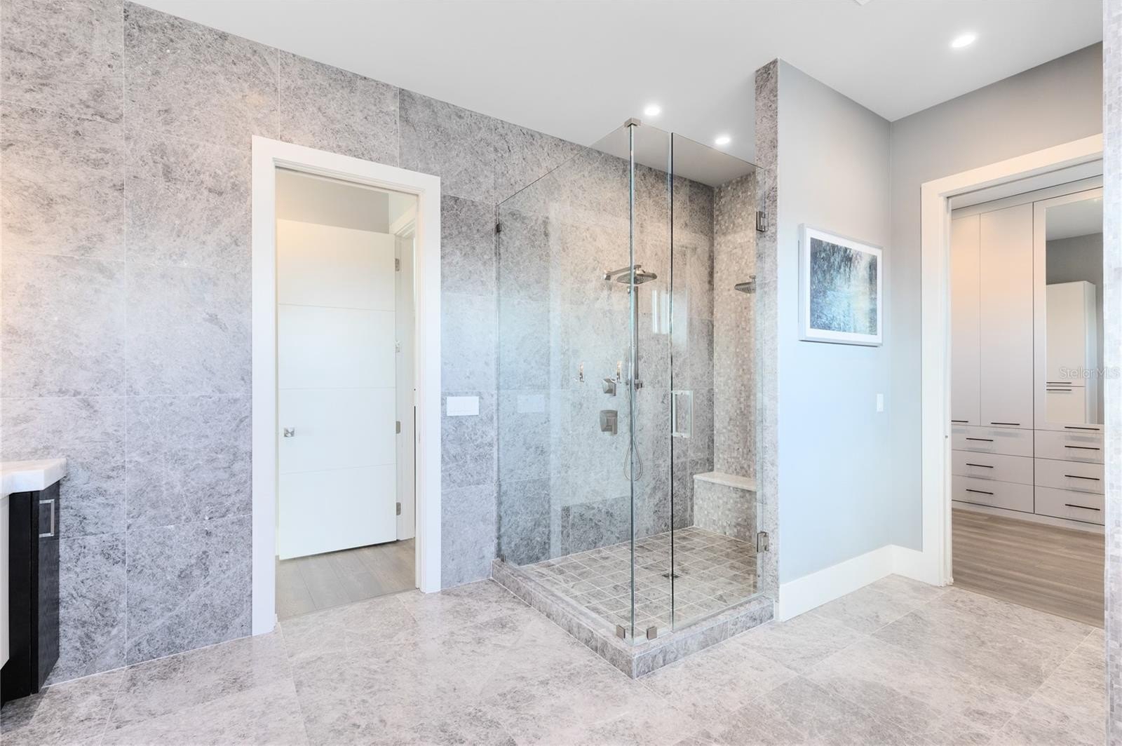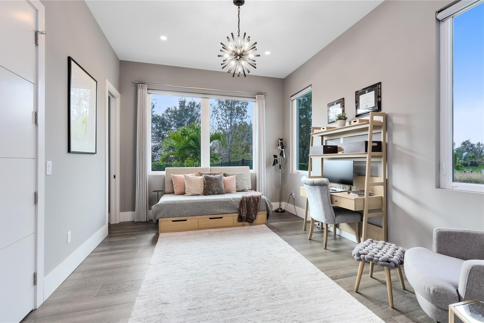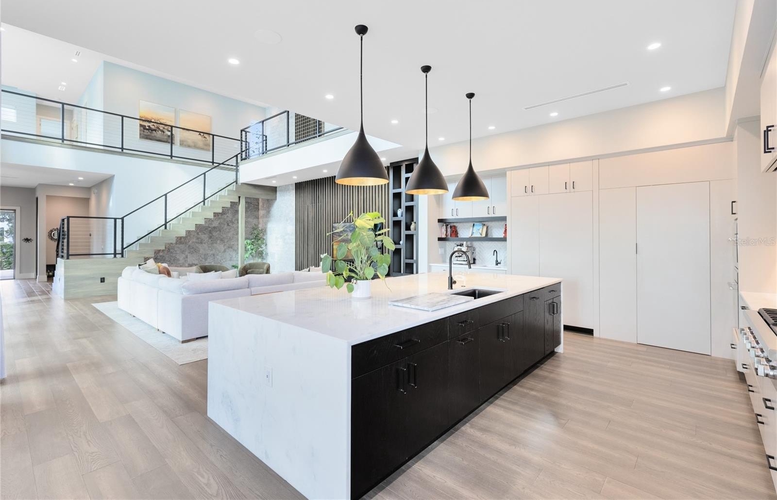 The open concept main living areas are filled with natural light and anchored by a chef’s kitchen featuring solid wood cabinetry, stone countertops, built in appliances, an oversized island, and a walk in pantry; ideal for everyday living and entertaining. The first floor also features a private office, a guest en suite bedroom with full bath, and a dedicated pool bath, offering exceptional flexibility and convenience.