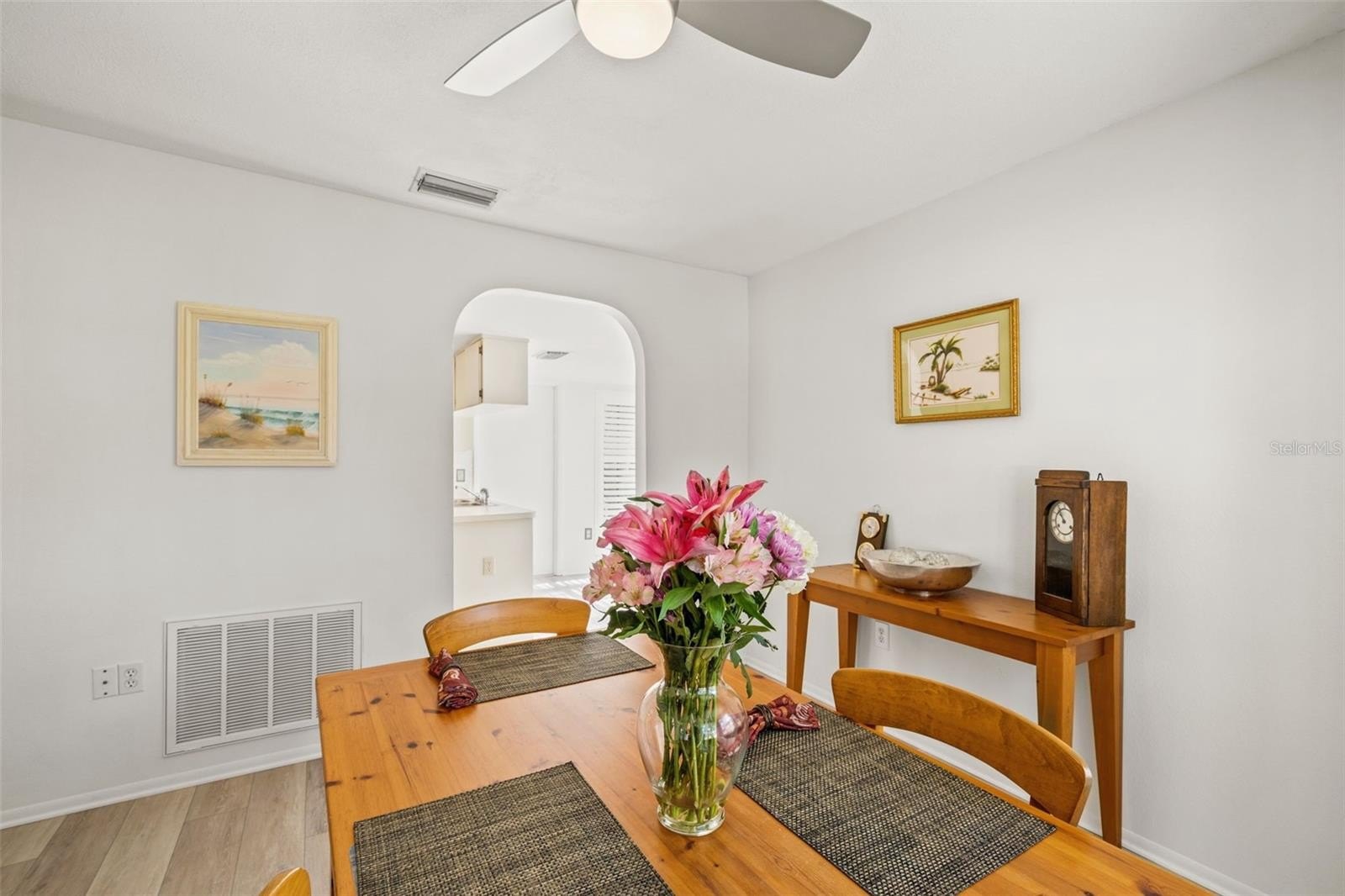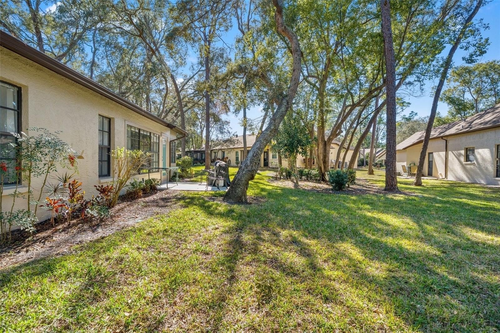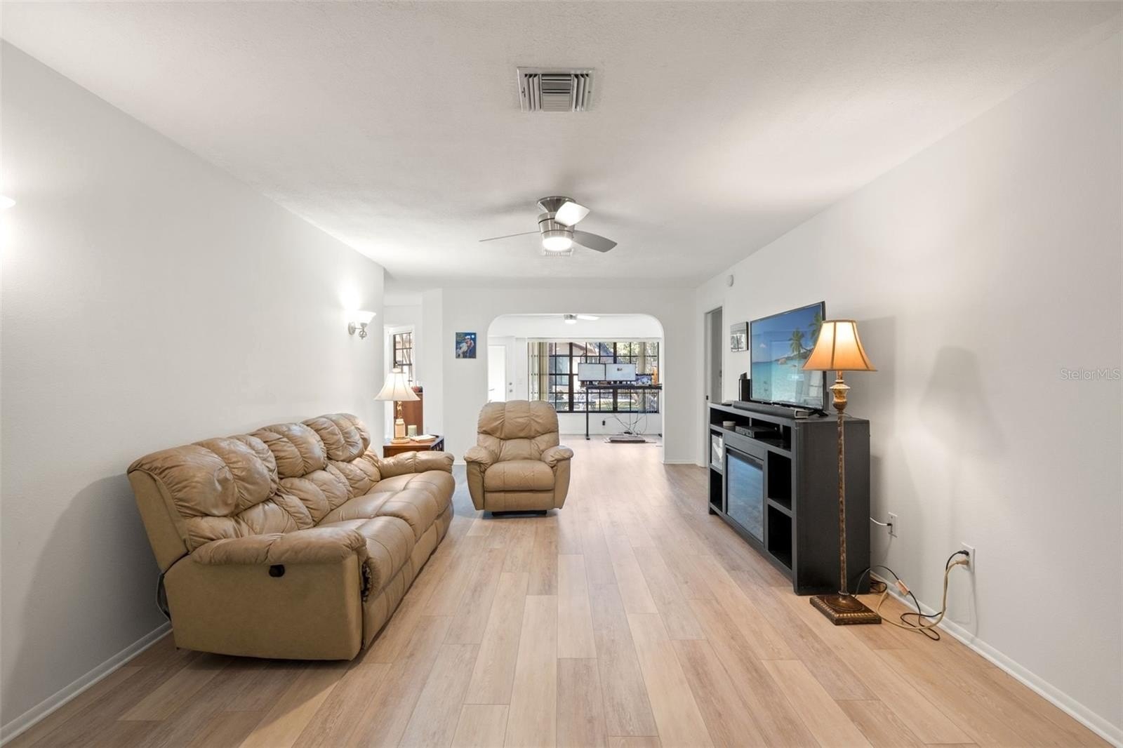 Desirable stand-alone maintained villa located in a private cul-de-sac within award-winning Timber Pines. A welcoming screened front porch and double-door entry lead into a light and bright living room and dining room combination featuring an open-concept design with vinyl flooring throughout. Popcorn ceilings have been removed, enhancing the home's clean, updated feel. The kitchen offers newer appliances, plantation shutters, a pantry, and a dine-in kitchen nook—perfect for enjoying views of the outdoors. The spacious guest bedroom is adjacent to a full bath with tub/shower combination, while the primary suite includes a private bath with walk-in shower. An extended driveway provides ample guest parking. Outdoor living is easy with a rear concrete slab, ideal for grilling. This well-maintained village features its own geothermal pool and pavilion and is one of the few villages in Timber Pines that allows two dogs. Reside in one of Florida's premier active adult communities with access to four golf courses, tennis and pickleball courts, clubhouse, fitness center, pools, full-service restaurant, Dog park, 24 hour security, gated and guarded, Performing Arts Center, Resident Activity Center, 2 Geothermal Pools, Billiards Center, Wood Shop, Arts and Crafts room, and over 100 social clubs,so many Activities!! Spectrum Cable TV, 2 Boxes, and highest speed internet included in HOA. ?? Don't miss your chance to make this home your own in Timber Pines—where comfort meets community. Schedule your private tour today!