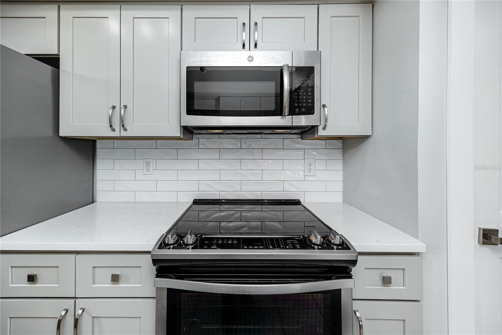 The kitchen has been completely upgraded with quartz countertops, shaker-style cabinetry, a tiled backsplash, new stainless steel appliances, a deep 18-gauge stainless steel sink with modern faucet, additional pantry storage, and a flexible breakfast or workspace area, making it both functional and stylish. The spacious primary suite features a walk-in closet with built-ins, a dressing area with abundant storage, and a beautifully updated en suite bath. The guest bedroom is generously sized, while the second full bath offers a spa-like feel with ceramic tile and modern fixtures, providing comfort for visitors or flexible use as a home office or den.