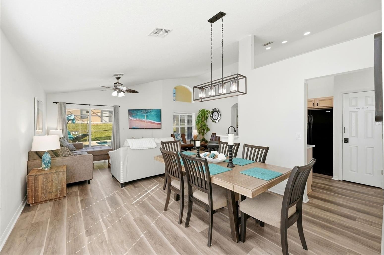 Step into resort-style living at Solana, a sought-after guard-gated community in Davenport just minutes from Central Florida’s top attractions. Fully furnished and move-in ready, this 4-bedroom, 3-bath pool home is ideal whether you’re looking for a vacation retreat, a short-term rental investment, or a primary residence. Recent upgrades include new luxury vinyl plank flooring throughout the home, an updated kitchen with new quartz countertops and sink, a new A/C and water heater (2023), and a resurfaced and freshly painted pool area. The open living and dining spaces feature high ceilings and sliding glass doors that lead to a screened lanai and private pool—perfect for indoor-outdoor living and entertaining.