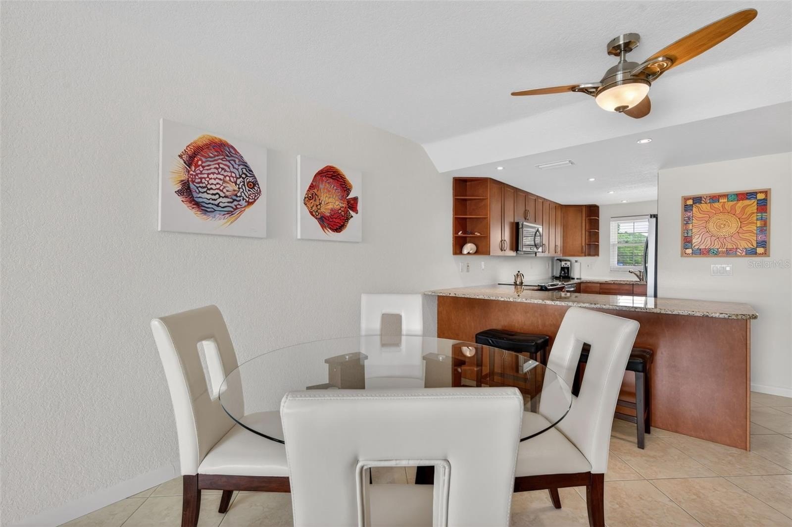 The upgraded kitchen anchors the space, featuring warm wood cabinetry, granite countertops, stainless steel appliances, and abundant storage. Living and dining areas open effortlessly to a private balcony through impact-rated sliding glass doors, offering an ideal spot to unwind while enjoying the waterfront setting. An exterior storage closet adds valuable space for beach essentials, fishing equipment, and outdoor gear.