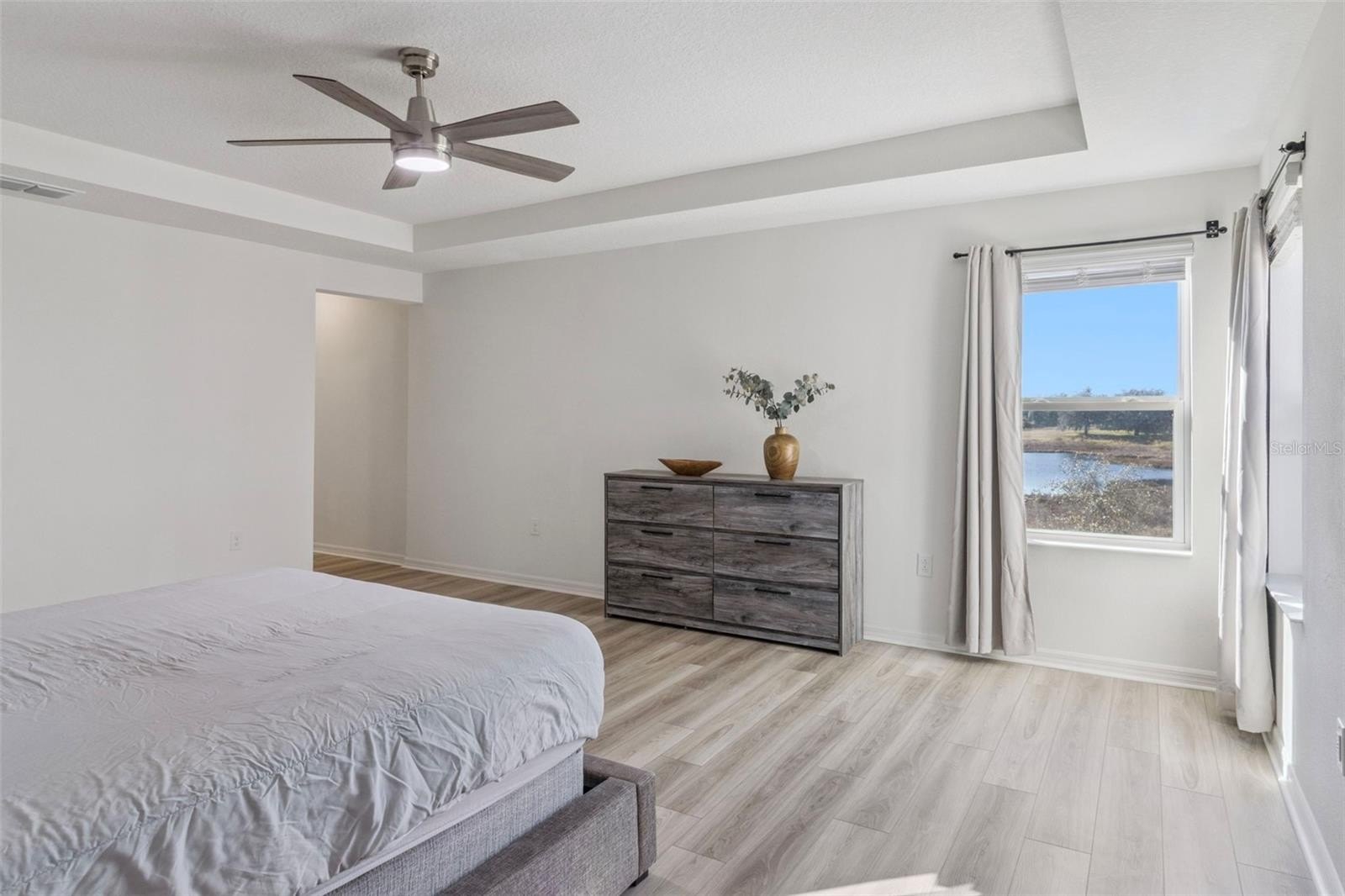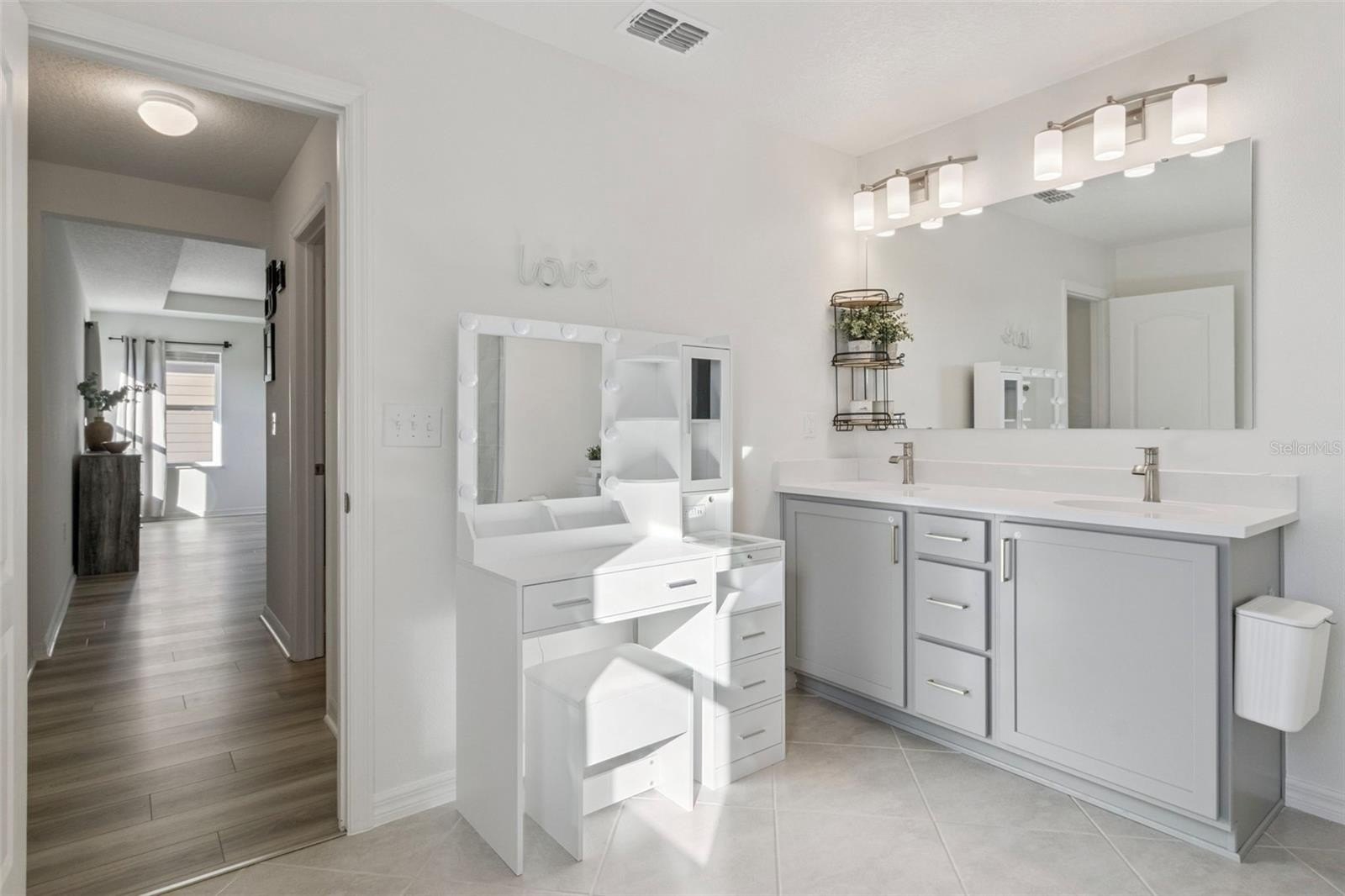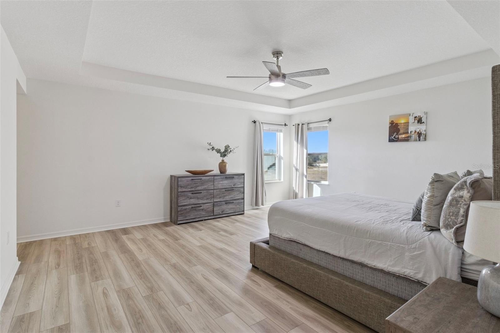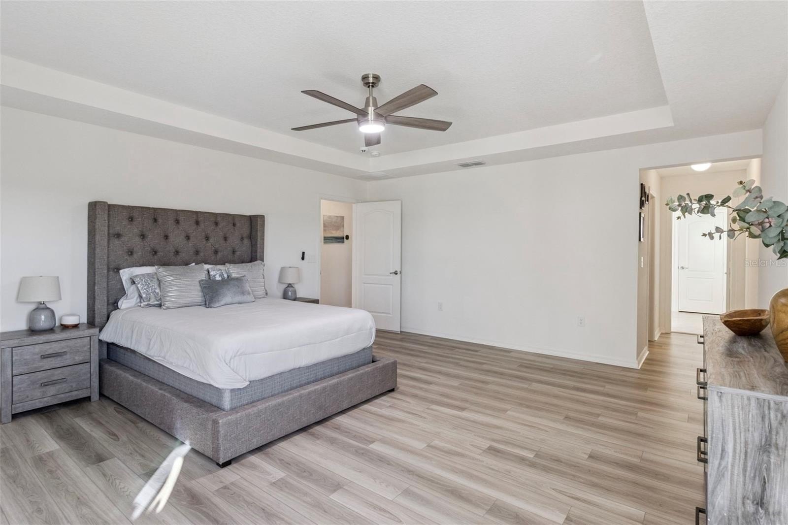 The primary suite is a true retreat, featuring tray ceilings, generous space for a king-sized bed, and an upgraded California Closet–designed walk-in closet offering exceptional storage and organization. The primary bath includes dual sinks and a walk-in shower. Two additional bedrooms, a full bath, and a well-appointed laundry room with sink complete the upper level.