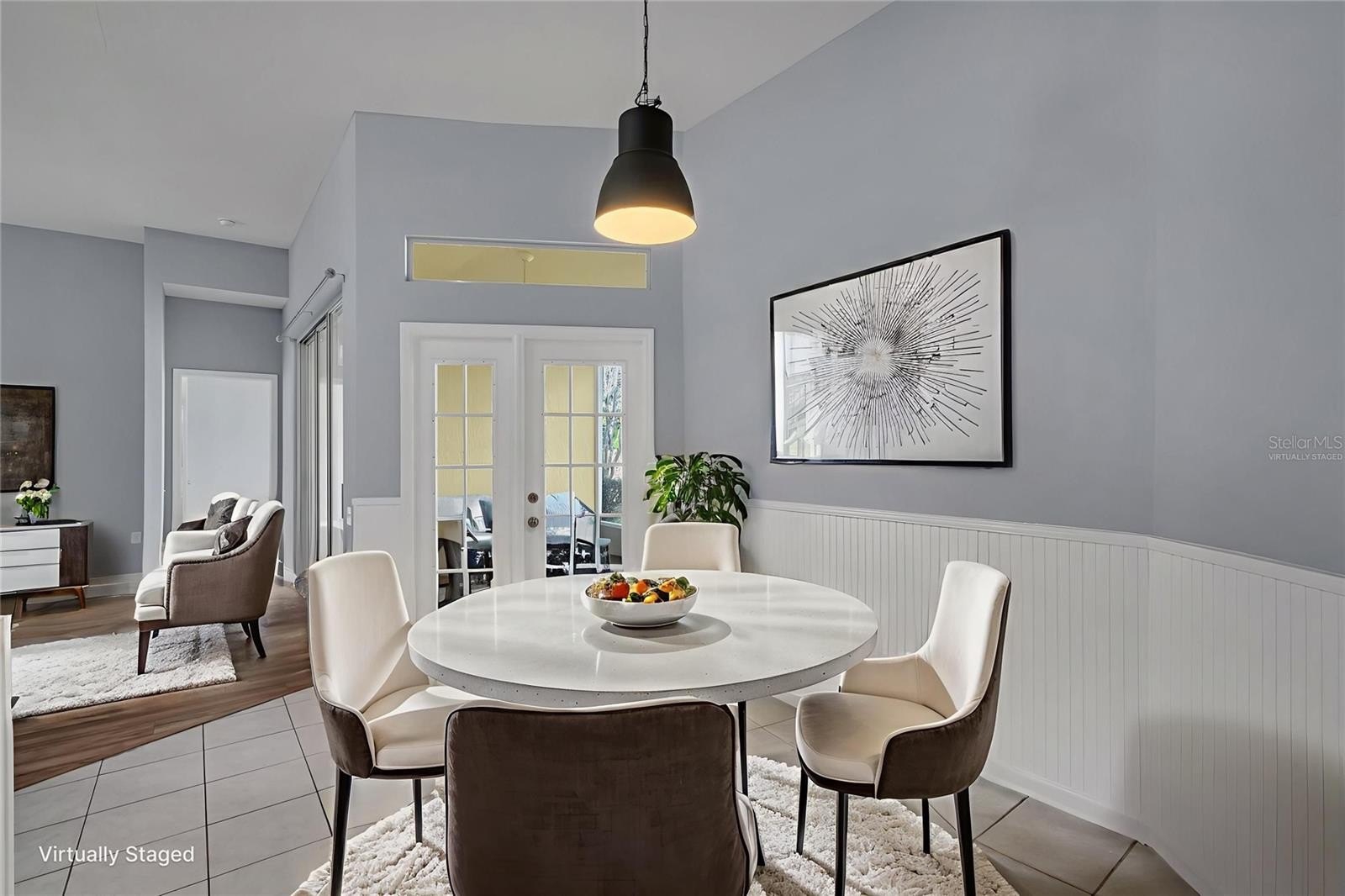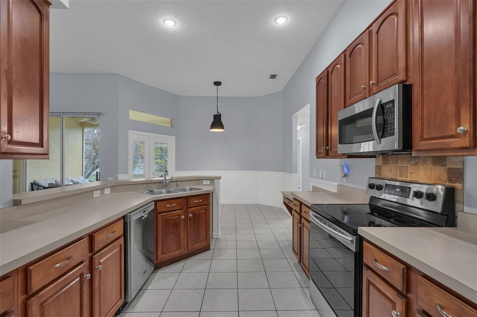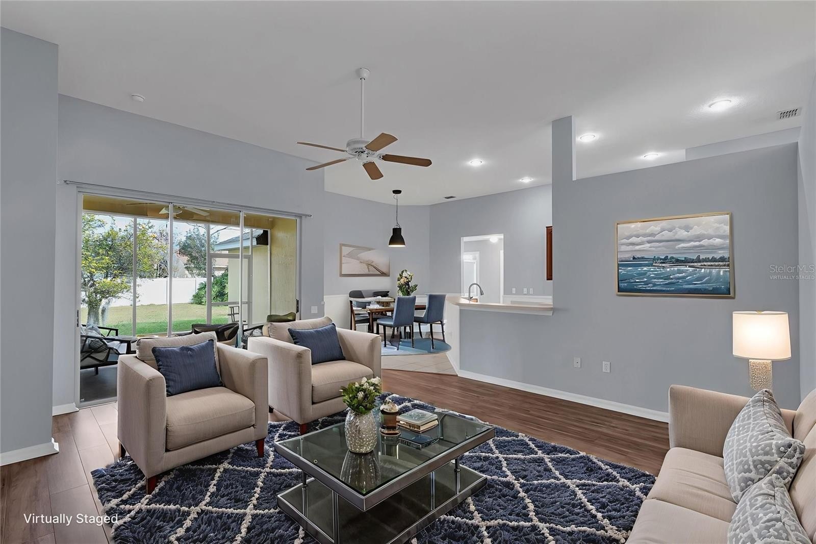 A formal living and dining area welcomes you at the foyer. The updated kitchen is ideal for cooking and entertaining, featuring ample counter space and newer appliances. The kitchen and breakfast nook open to a spacious family room with high ceilings, creating an inviting setting for gatherings. Both the sliding glass doors and breakfast nook french doors extend your living space to a gorgeous screened-in lanai, perfect for relaxing or entertaining.