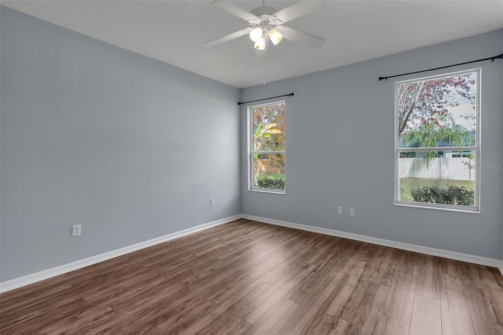 The primary suite overlooks a large backyard with lush fruit trees and features private lanai access. The en-suite bathroom offers a garden tub, separate shower, dual-sink vanity, and an oversized walk-in closet. Three additional bedrooms provide generous closet space, excellent natural light, and share a full bathroom.