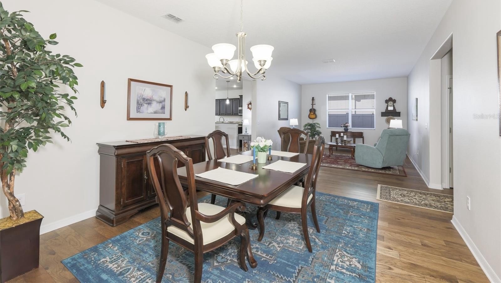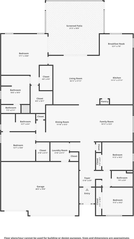 The open floor plan features multiple living areas, including a family room, formal living room, en suite with its own full bath, TRUE FORMAL dining room, and breakfast nook, providing flexibility for entertaining and everyday living. The primary suite is generously sized and includes sliding glass doors leading to the screened lanai, creating a seamless indoor-outdoor experience.