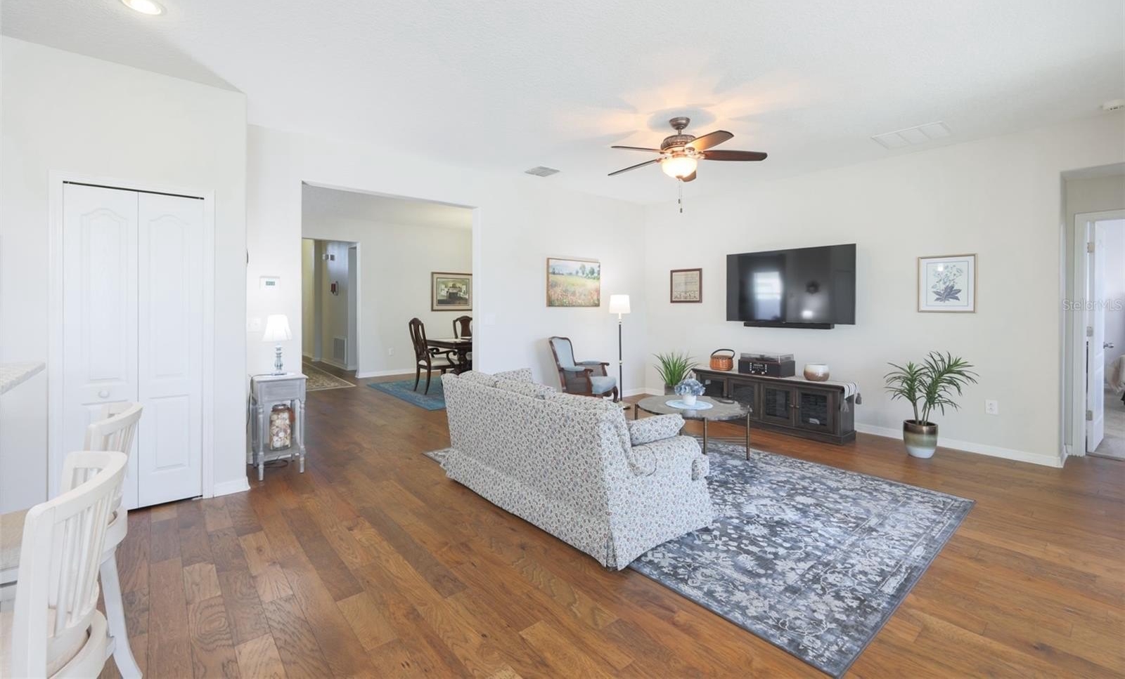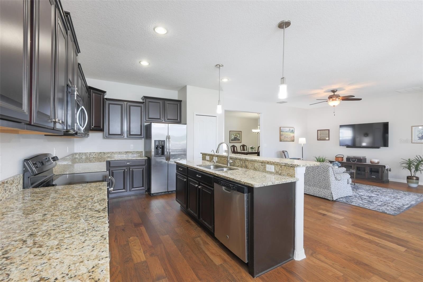 The kitchen offers ample cabinet and counter space, perfect for gatherings and meal prep. Recent upgrades include a new roof (2024), Wood flooring installed in (2018), Interior and exterior paint (2024), epoxy-coated garage floor (2025), and a custom pavered, screened-in patio with epoxy flooring (2020), an ideal outdoor retreat.