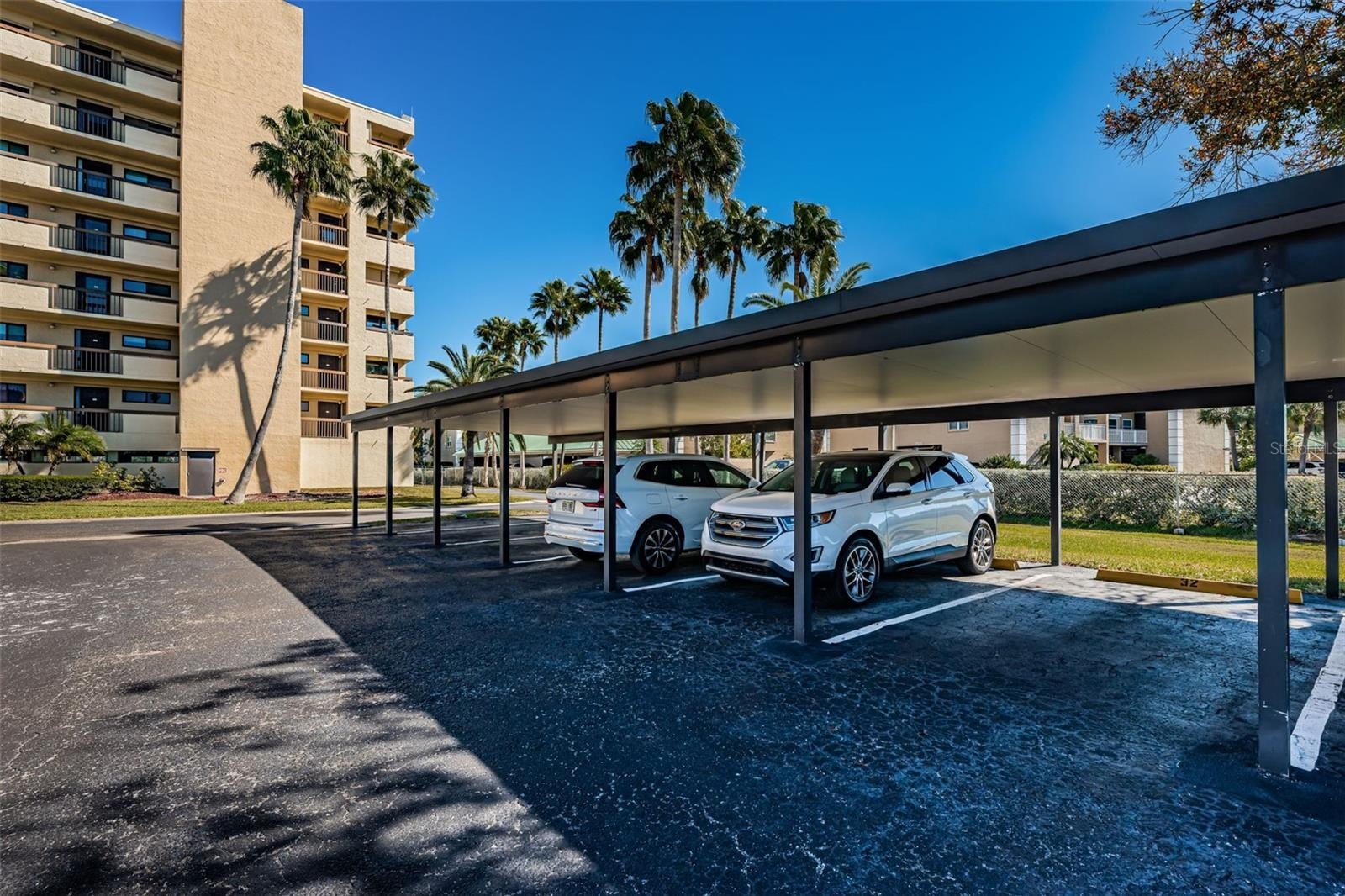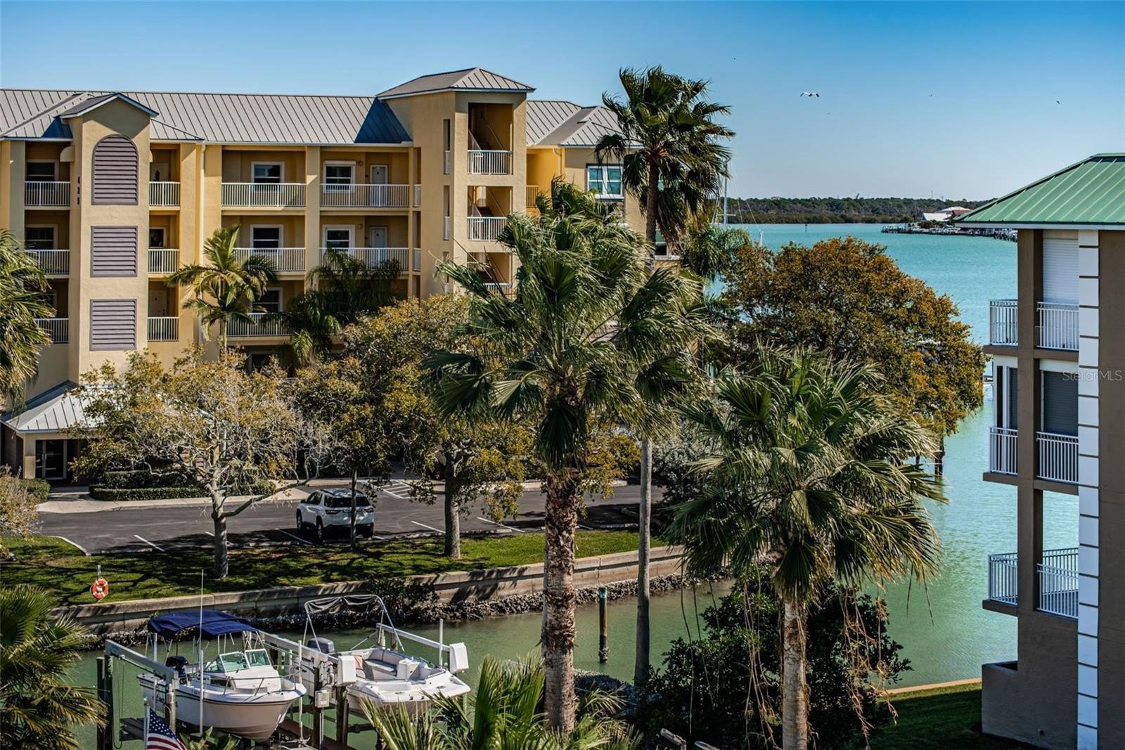 The unit was completely updated in 2019. The large eat in kitchen has new cabinets, stainless appliances , granite countertops and stackable washer and dryer The primary bedroom provides a comfortable and private retreat, offering a spacious and serene space , ensuite features newly tiled shower.The additional bedroom allows for flexibility, whether used as a guest room or a home office. New water heater in 2019, new HVAC in July 2022, new windows March of 2025. All interior doors are new. New recessed lighting and ceiling fans.New carpet in the bedrooms and laminate in living areas. Bathrooms are tiled. There are 2 parking spaces, one under the building and one in the carport. There is a 25' boat slip with 10,000 lb lift