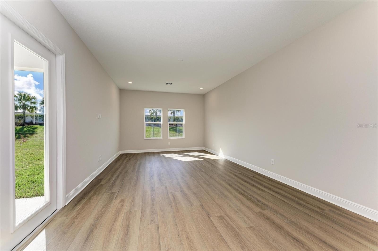 The architecture focuses on an airy, open concept that bridges the gap between relaxation and hosting. Massive 24 foot sliding glass doors dissolve the boundary between the interior and the outdoor lanai, offering a panoramic view of the expansive backyard. This seamless transition fills the home with natural light and fresh air.