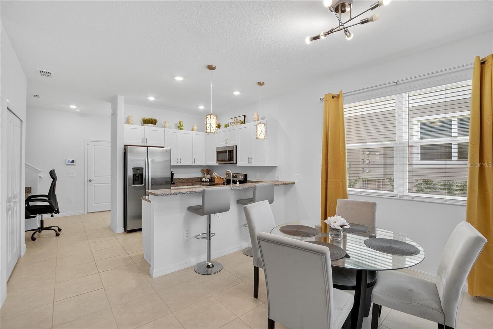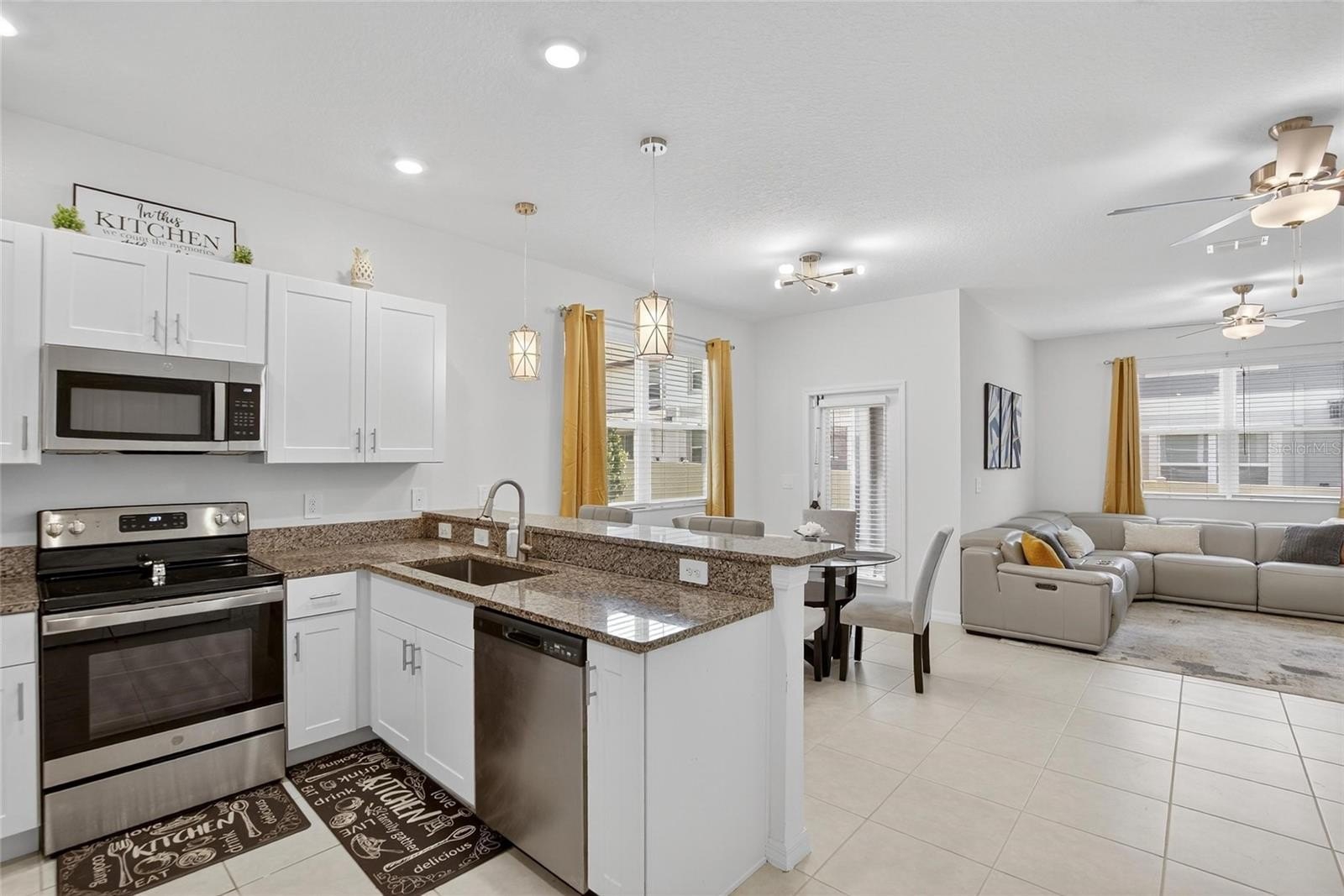 The kitchen is a true highlight, featuring granite countertops, stainless steel appliances, and generous cabinet space, making it ideal for everyday living and entertaining. Sleek tile flooring throughout the main level adds both style and easy maintenance.
