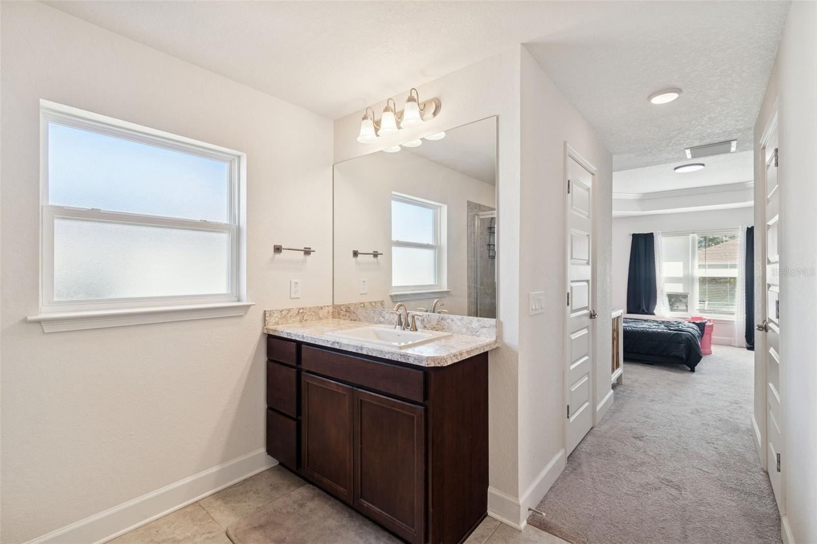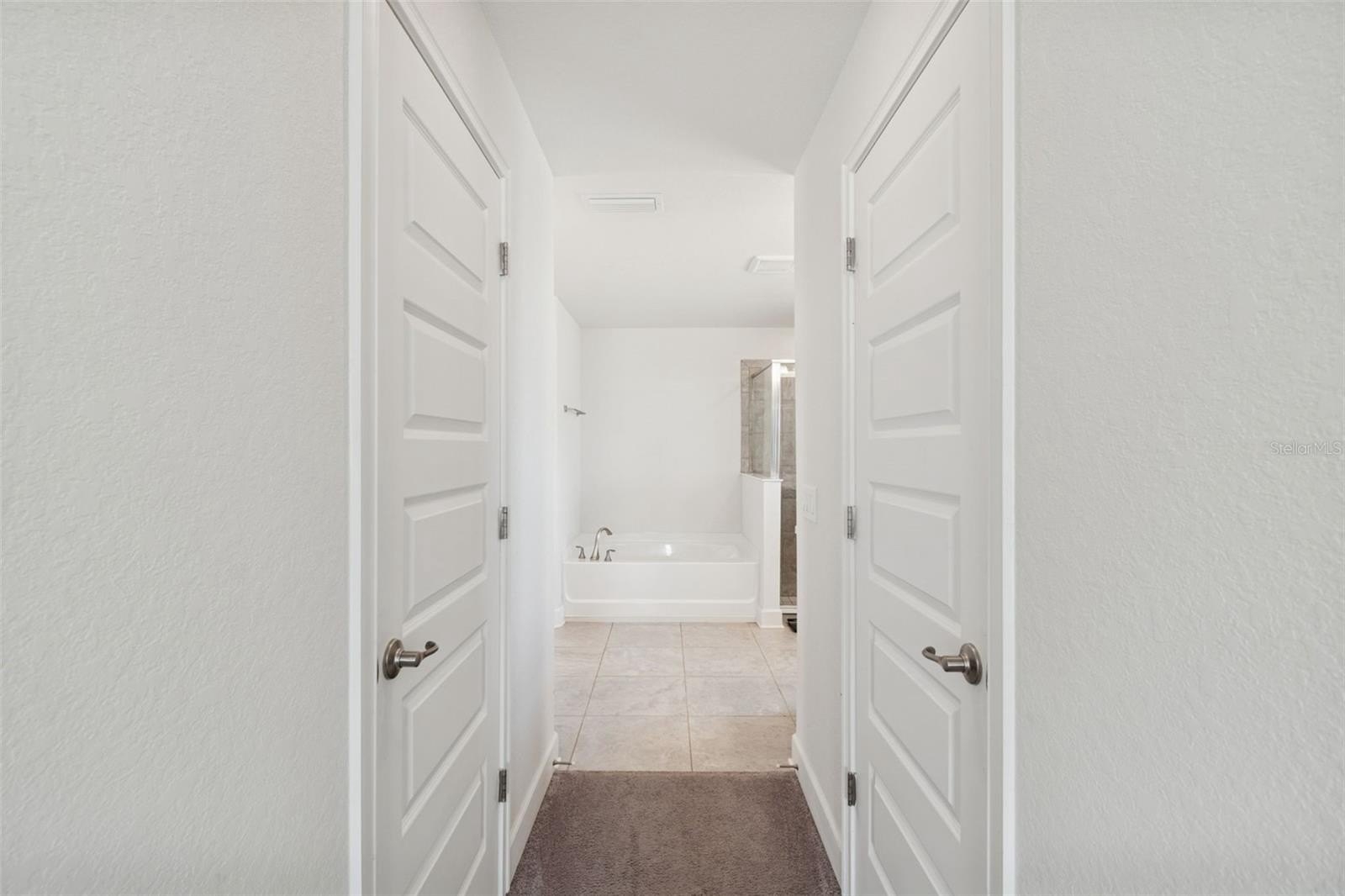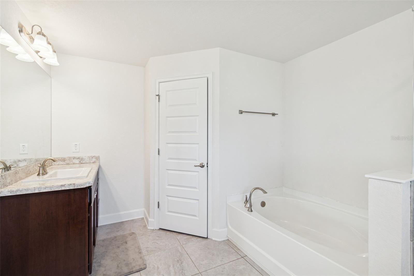 The primary suite is privately located on the rear left side of the home and offers excellent space and comfort, featuring his and hers walk-in closets and a well-appointed en-suite bath. The primary bathroom includes separate vanities, a large soaking tub, and a separate tiled shower with lighting. The home also offers three full bathrooms, each equipped with a tub/shower combination, providing convenience and flexibility for family or guests.