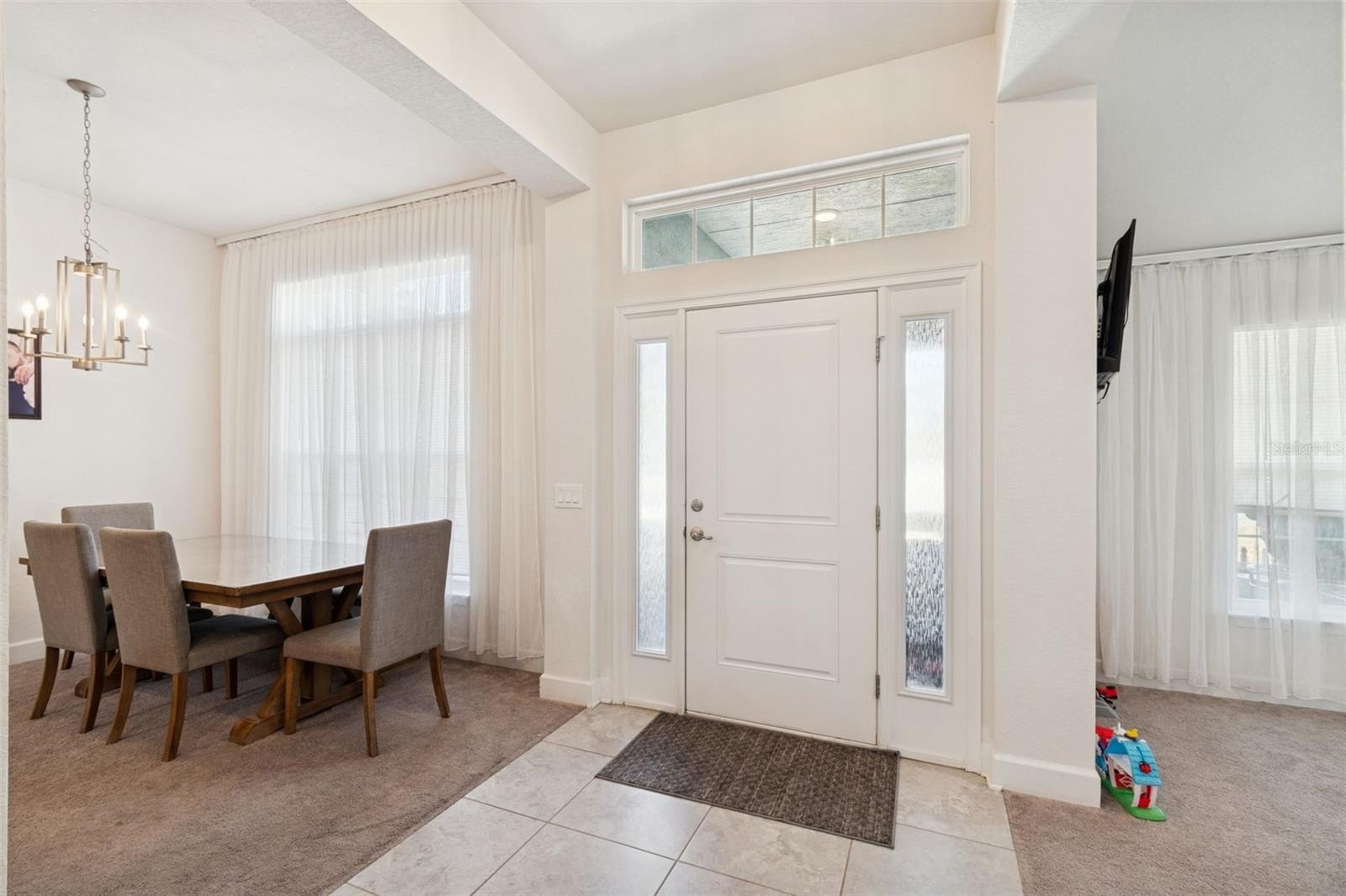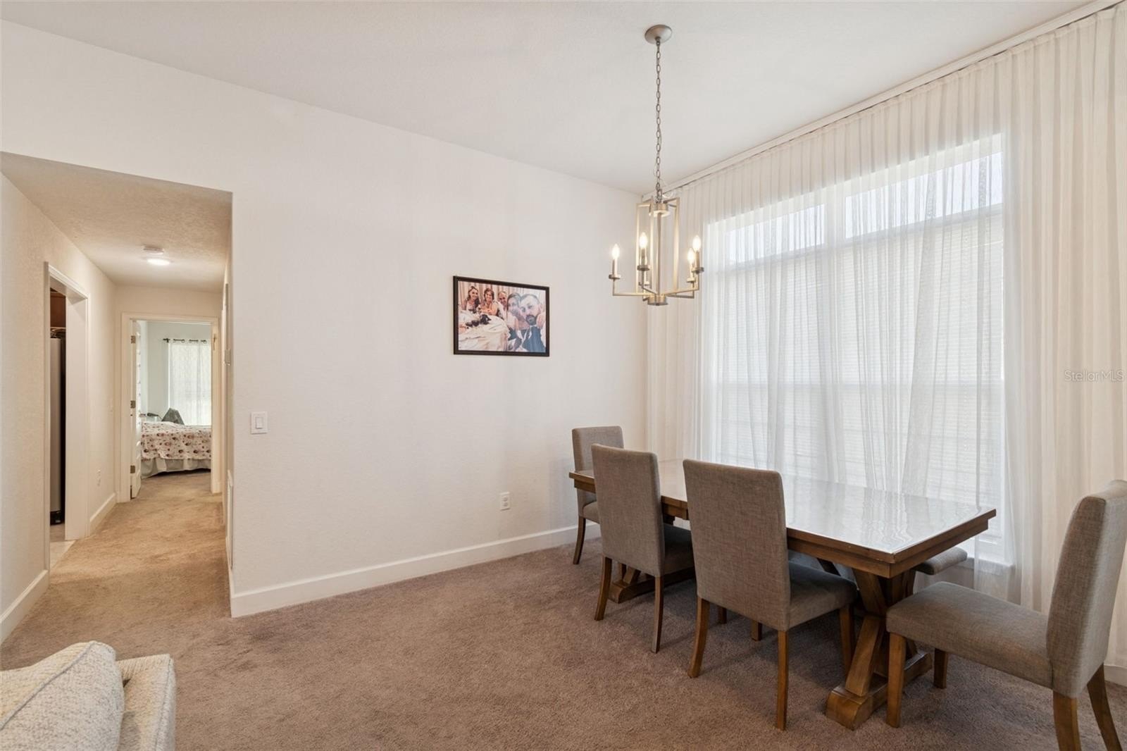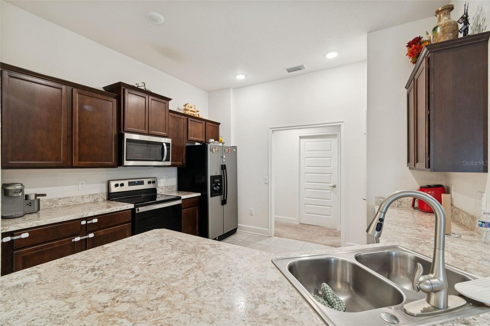 Inside, the spacious family room opens seamlessly to the kitchen, creating an ideal layout for everyday living and entertaining. The kitchen features attractive cabinetry, stainless steel appliances, a large countertop with an eat-in bar area for stools, and a generous breakfast nook. Additional interior features include HD countertops with a beveled edge, rear door mini blinds, and a tray ceiling with crown molding in the primary bedroom.