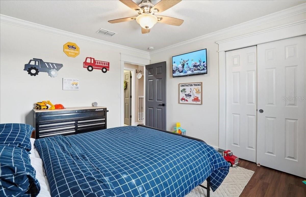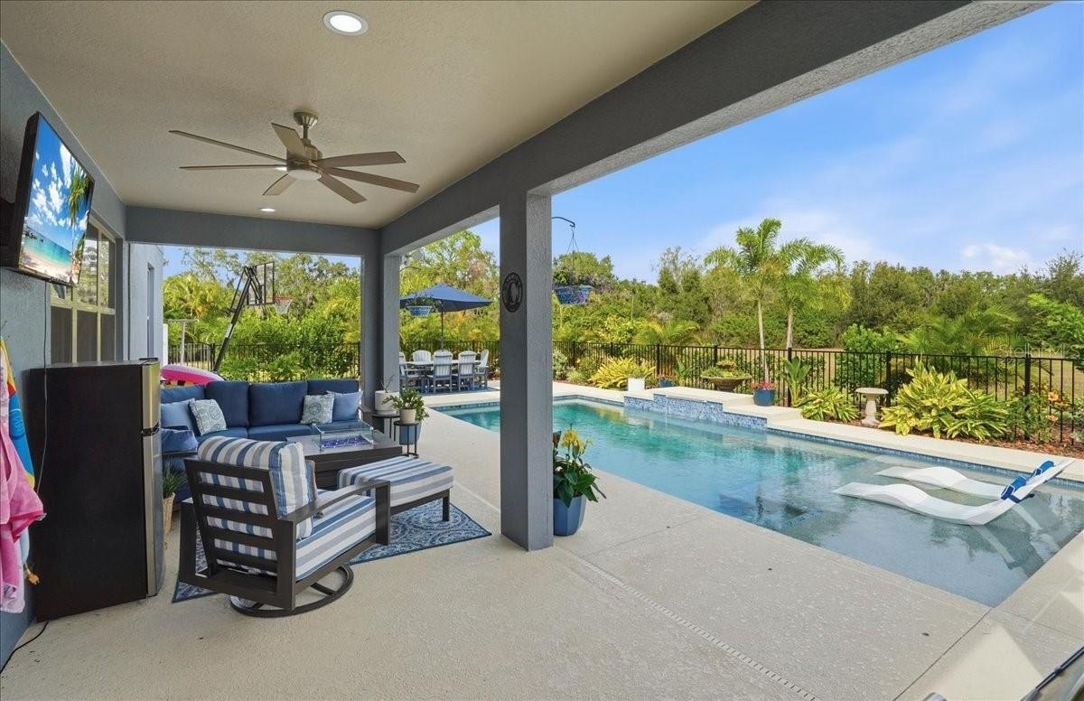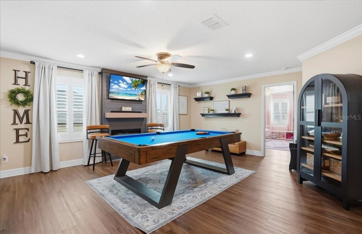 Are you looking for a home that has it ALL? All the bedrooms? All the Baths? All the upgrades, updates, little details? Well, you can stop looking at ALL the others because this is THE ONE. Five Bedrooms, 3 Bathrooms, 3 Car Garage, New Saltwater Heated Pool with fountain, LED lights, ledge loungers, and sun shelf, great lot, beautifully landscaped with decorative curbing, the list goes on and on. Downstairs features a formal living/dining room, kitchen with island and cabinet pantry, living room with electric fireplace and stone accents. A bedroom and bath complete the downstairs. Upstairs you will find 4 bedrooms including the HUGE Primary Suite with an awe-inspiring walk-in closet. Three more bedrooms, a third bathroom, laundry room, and a bonus space that can be a game room or upstairs living area with fireplace wall. The entire upstairs is Luxury vinyl flooring and downstairs is tile... no carpet in this one. You may never go back inside once you see the lanai and the pool that is less than a year old. The area is fenced and landscaped for maximum privacy. The lot is pie shaped with green space behind. Harrison Ranch has a large amenity center with sports courts, pool, gym, clubhouse, and playground. Don't let this one slip away.