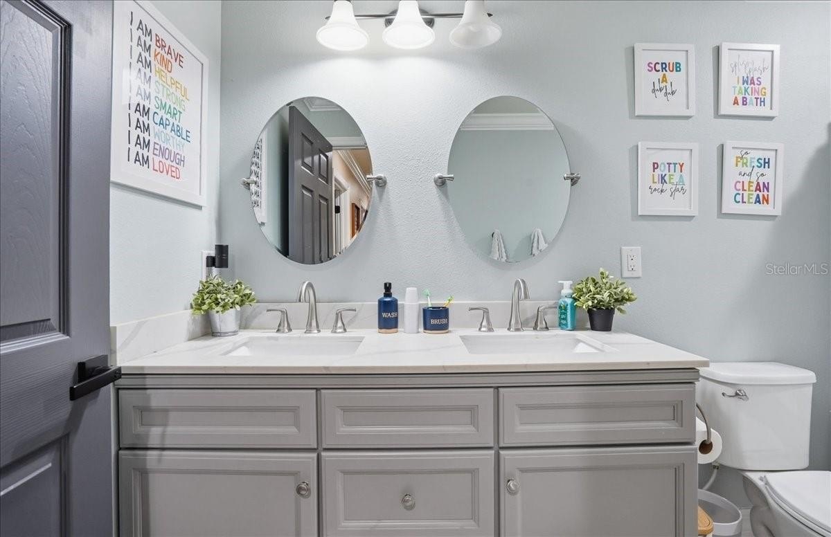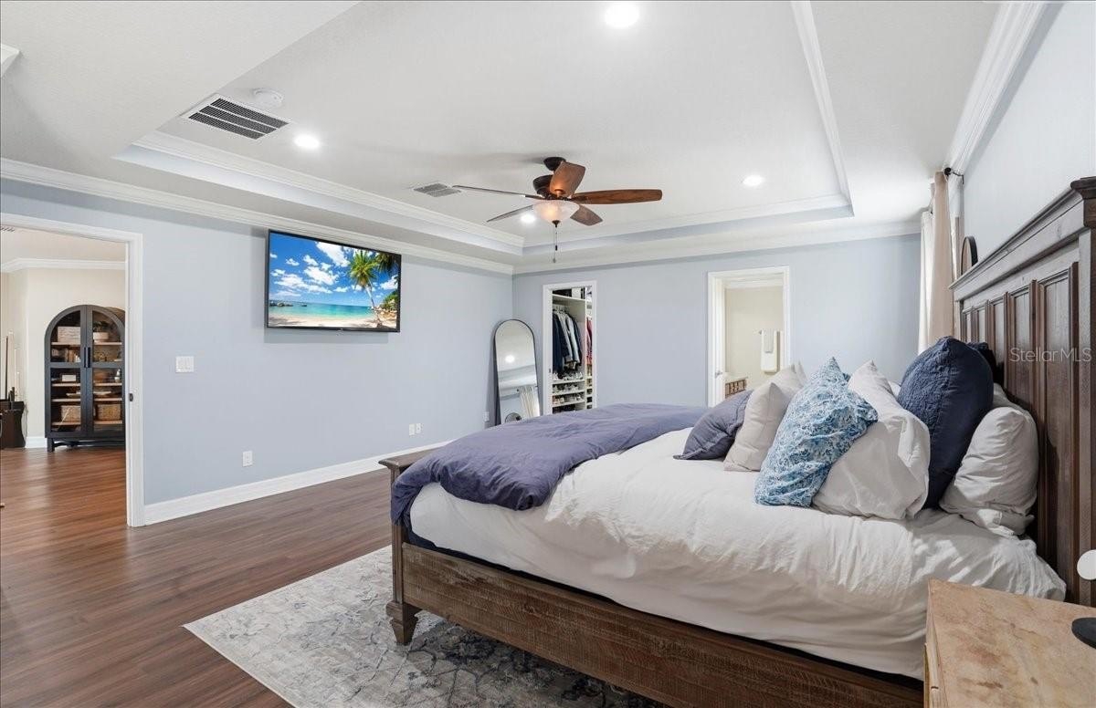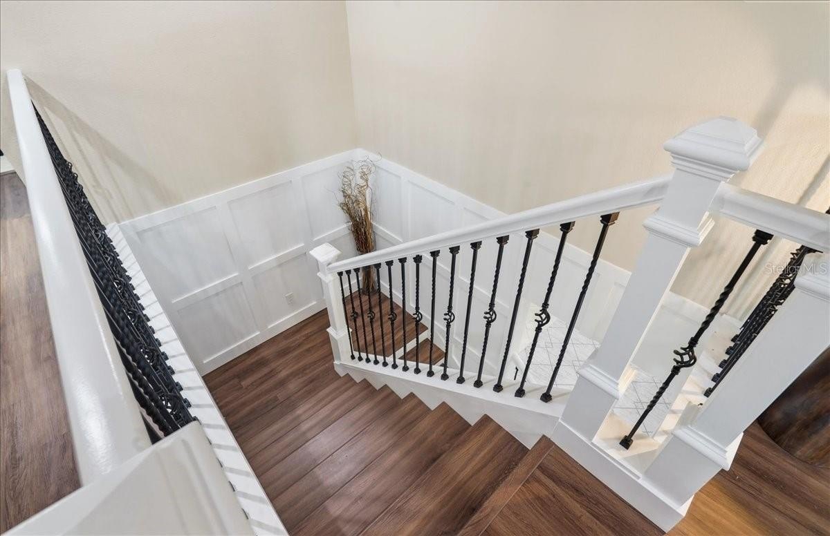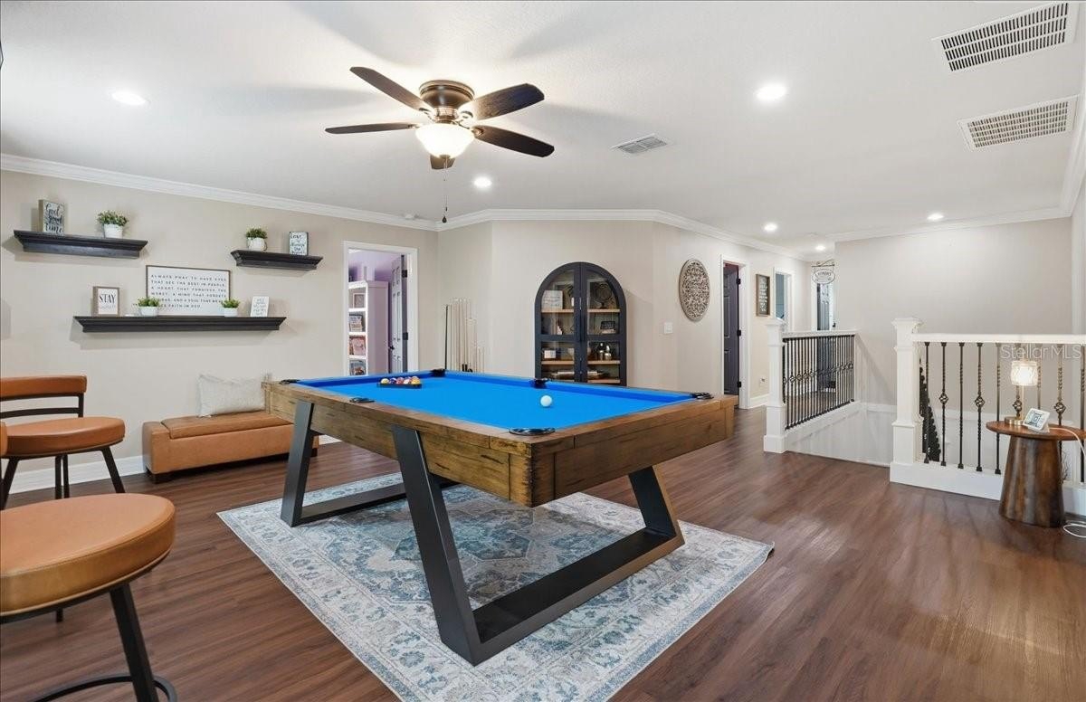 Are you looking for a home that has it ALL? All the bedrooms? All the Baths? All the upgrades, updates, little details? Well, you can stop looking at ALL the others because this is THE ONE. Five Bedrooms, 3 Bathrooms, 3 Car Garage, New Saltwater Heated Pool with fountain, LED lights, ledge loungers, and sun shelf, great lot, beautifully landscaped with decorative curbing, the list goes on and on. Downstairs features a formal living/dining room, kitchen with island and cabinet pantry, living room with electric fireplace and stone accents. A bedroom and bath complete the downstairs. Upstairs you will find 4 bedrooms including the HUGE Primary Suite with an awe-inspiring walk-in closet. Three more bedrooms, a third bathroom, laundry room, and a bonus space that can be a game room or upstairs living area with fireplace wall. The entire upstairs is Luxury vinyl flooring and downstairs is tile... no carpet in this one. You may never go back inside once you see the lanai and the pool that is less than a year old. The area is fenced and landscaped for maximum privacy. The lot is pie shaped with green space behind. Harrison Ranch has a large amenity center with sports courts, pool, gym, clubhouse, and playground. Don't let this one slip away.