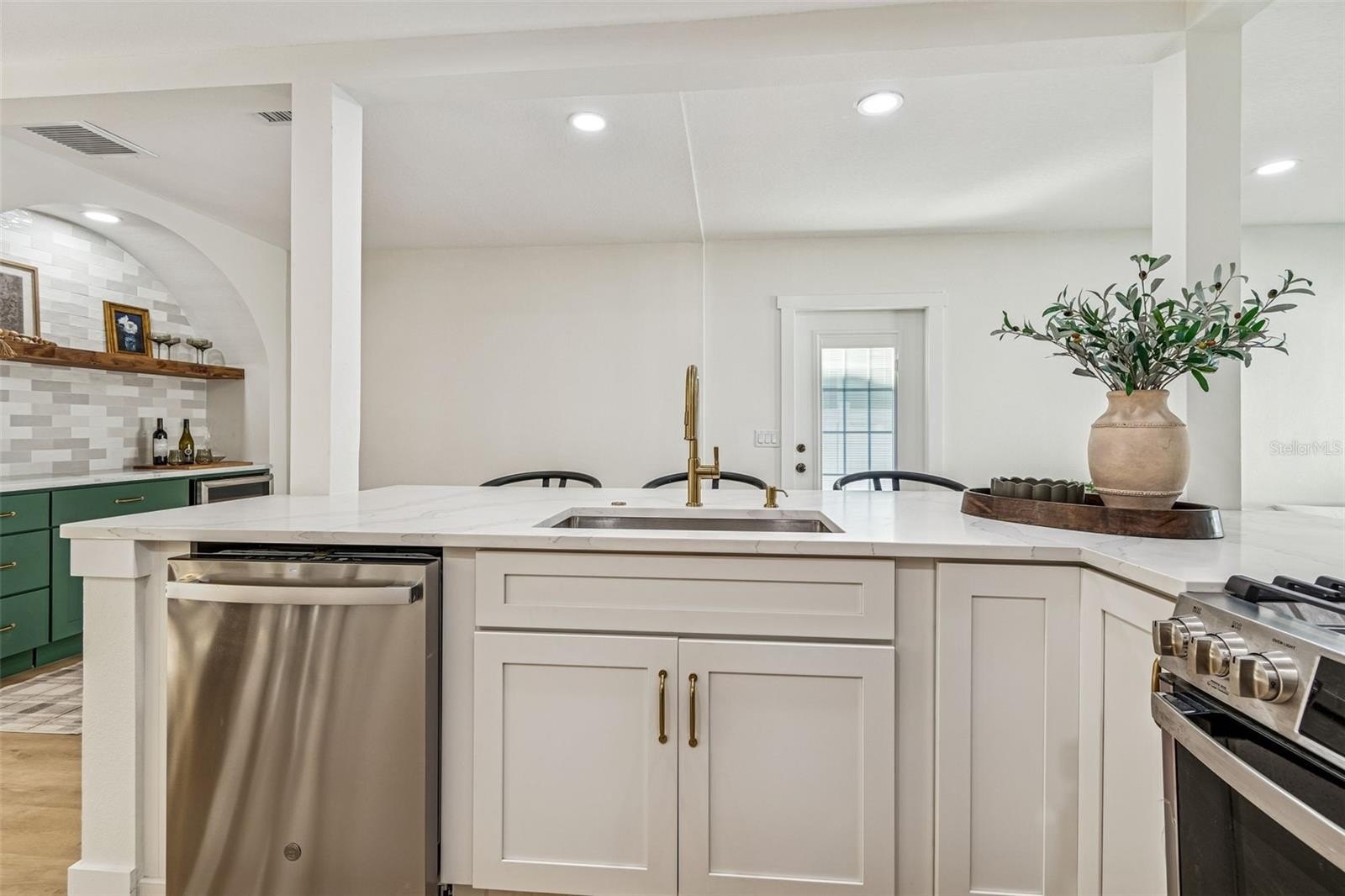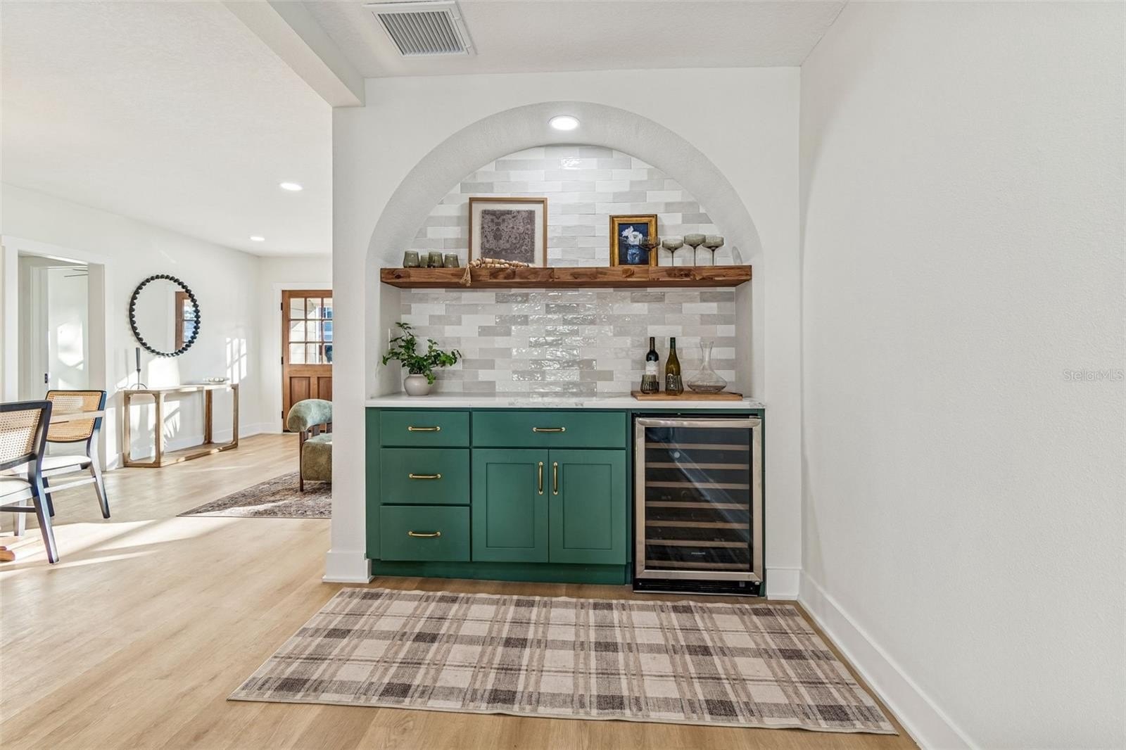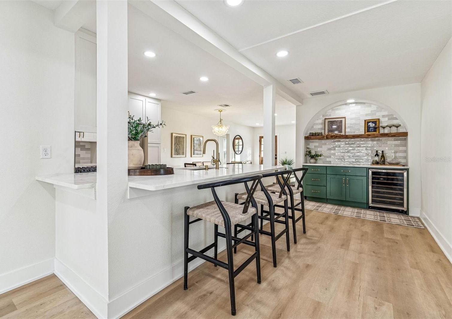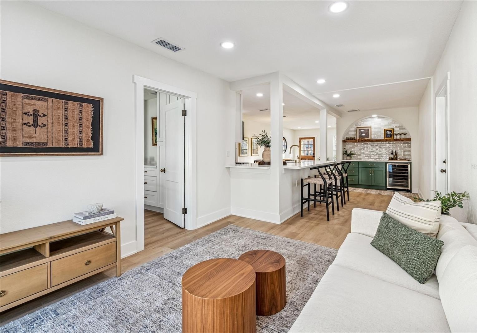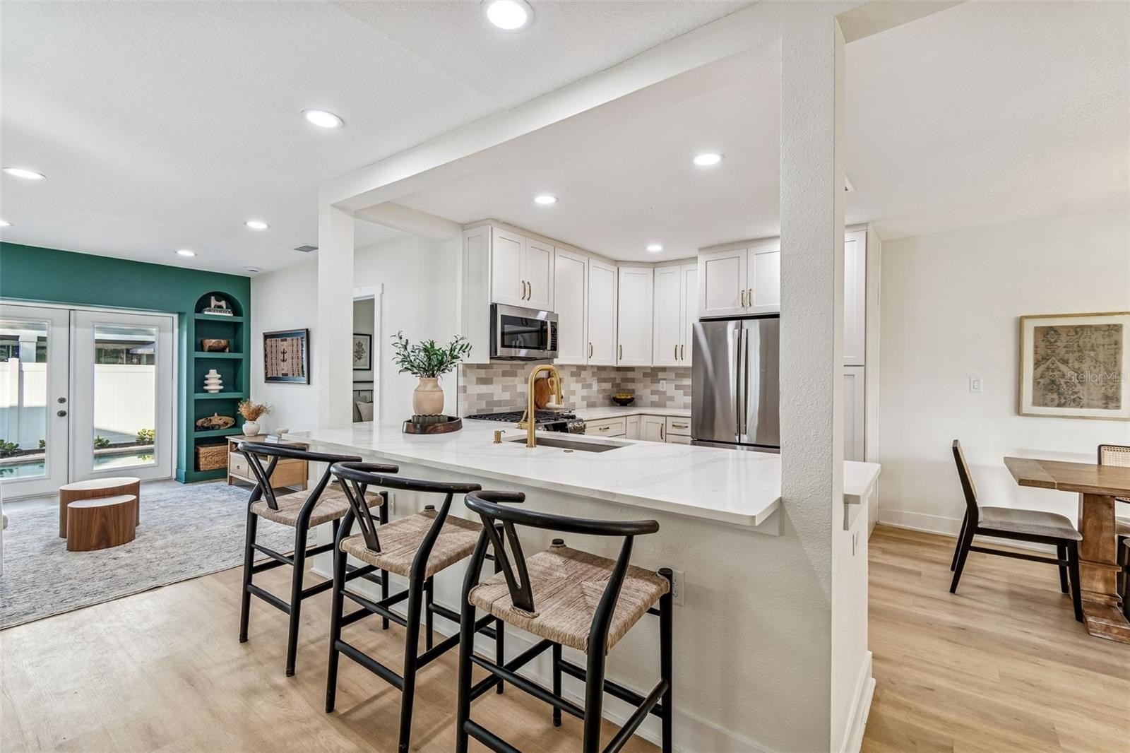 A custom built in bar and kitchen niche anchors the main living space and serves as a natural gathering point for everyday living and entertaining. Finished with custom green cabinetry, a built in wine fridge, a bold archway, and a carefully selected backsplash, the level of craftsmanship is immediately apparent. This same design language carries into the living area, where arched built in bookshelves frame French doors that open to the pool patio, creating an effortless indoor outdoor connection.
