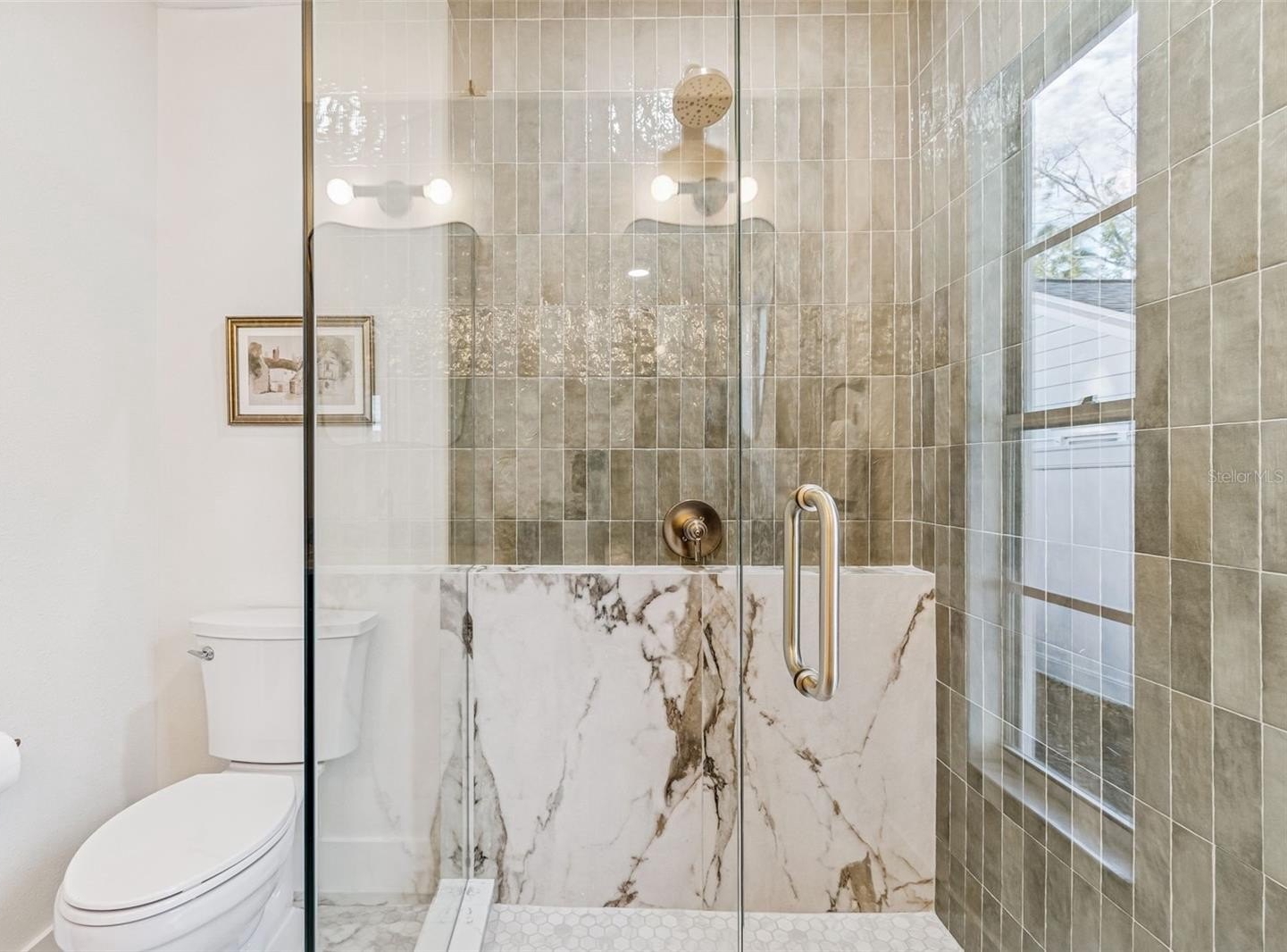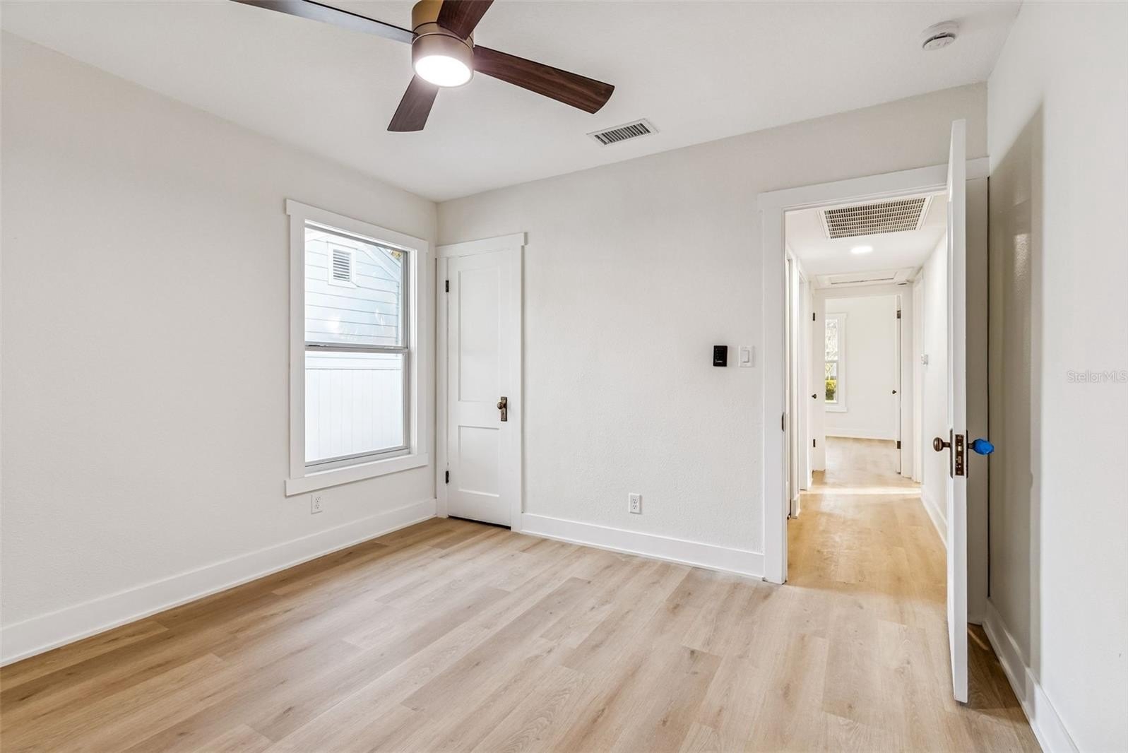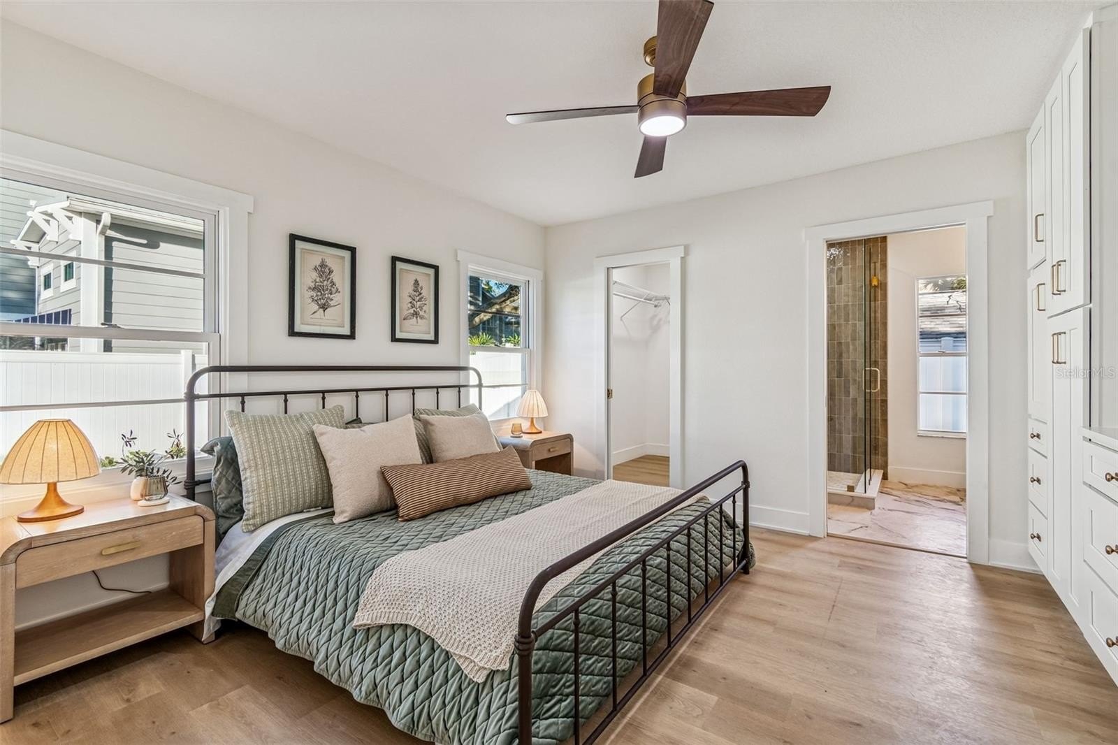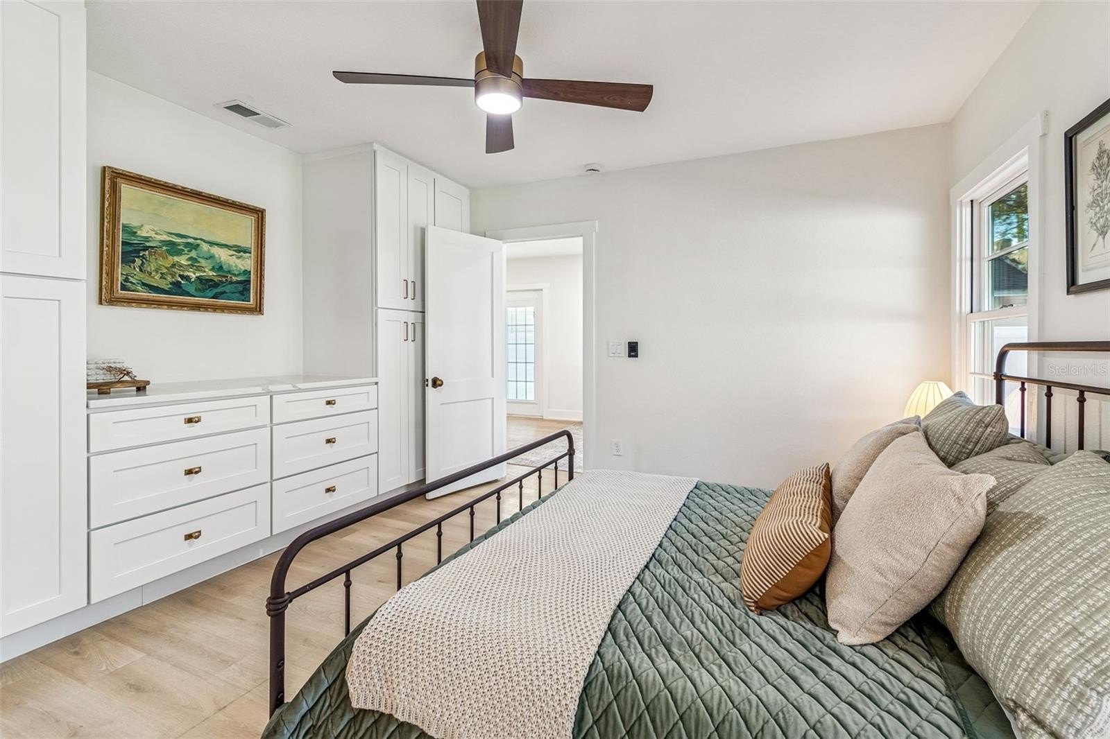 The primary suite is privately positioned and thoughtfully designed to maximize both storage and comfort. Custom built in cabinetry complements the closet storage, providing ample space while maintaining a clean and intentional aesthetic. The primary bath, though efficient in size, feels elevated and luxurious with a seven foot vanity, designer finishes, and a custom frameless glass shower wrapped in carefully selected tile.