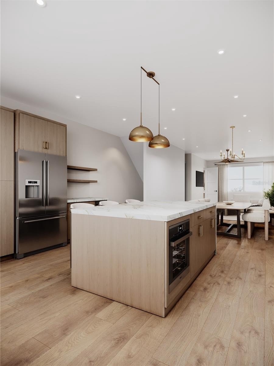 At the heart of the home is a show-stopping designer kitchen crafted for both everyday living and upscale entertaining, showcasing custom flat-panel wood cabinetry extending floor to ceiling, premium stone countertops, and a dramatic oversized waterfall-edge island with generous seating. The kitchen is equipped with built-in appliances, including a wall oven, sleek cooktop with custom vent hood, panel-ready refrigerator, and built-in wine refrigerator, delivering a seamless, high-end aesthetic. Thoughtfully integrated open wood shelving, designer brass pendant lighting, and layered recessed lighting elevate the space, while wide-plank flooring and large windows flood the home with natural light and create an effortless flow into the open living and dining areas.
