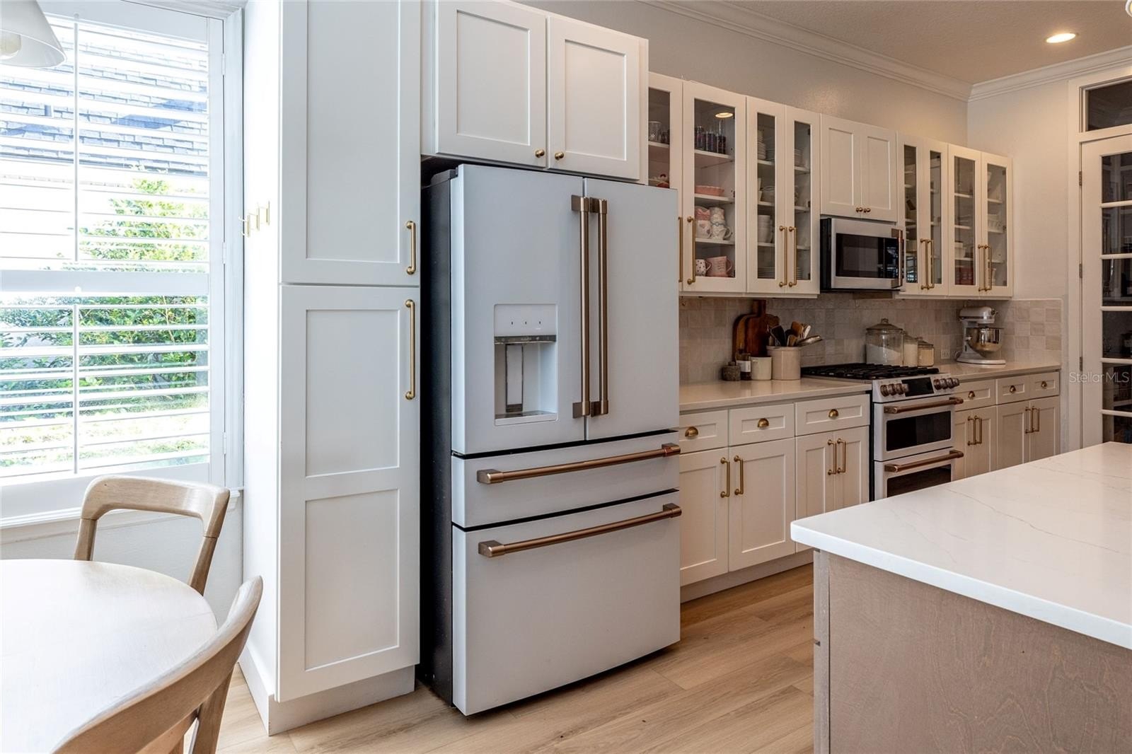 The GORGEOUS, newly upgraded kitchen is a true showstopper, featuring premium cabinetry with soft-close drawers, GE Café appliances, an expansive island with abundant storage on both sides and tons of countertop space, a large eat-in nook, a striking cast-iron farmhouse sink, and a DREAM walk-in pantry with exceptional storage space. The primary suite is conveniently located downstairs and offers a large walk-in closet with shelving and soft-close drawers.