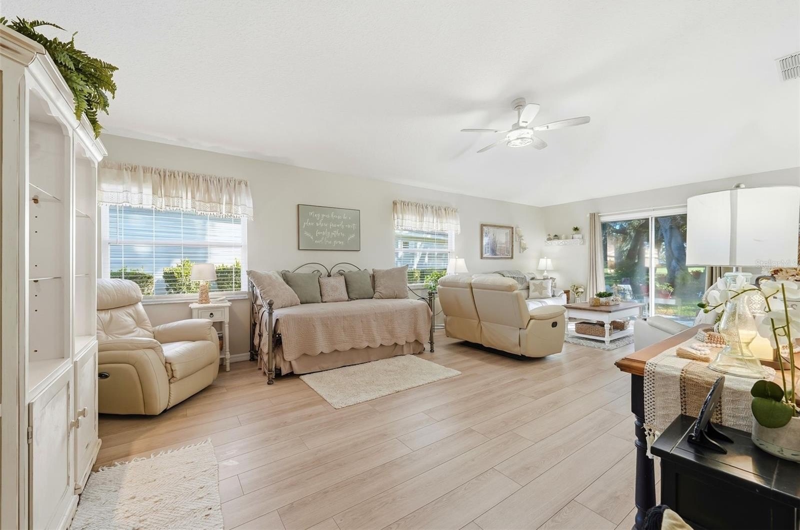 Welcome to your well-maintained villa with a beautiful golf course view in the back yard. Home is located in the friendly, gated 55+ community of Spruce Creek South. This charming 2-bedroom, 2-bath home comes with an attached garage and has had a NEW ROOF and WATER HEATER installed in 2024. This home is move-in ready and waiting to welcome you home. In 2025, this villa got a fresh makeover: new interior paint, stylish luxury vinyl plank floors, modern 2" window blinds, ceiling fans and updated fixtures throughout--plus many more thoughtful touches. Located conveniently near the center of the community, with easy access to the community center and all its activities. Spruce creek South is all about active living! Enjoy pickleball and tennis courts, shuffleboard, pool, and fitness center. For an additional fee there is an 18 hole golf course available. Plus, golf carts are welcome, making it easy to get to nearby shopping, medical offices, and dining. This a deed restricted community, monthly maintenance/amenities fee is required, no HOA. Agent-owned. THE ADDITIONAL MAINTENANCE FEE IS FOR OUTSIDE LAWN, IRRIGATION, HEDGE TRIMING, PEST SPRAYING. Making this very attractive not having to do yard work!!!