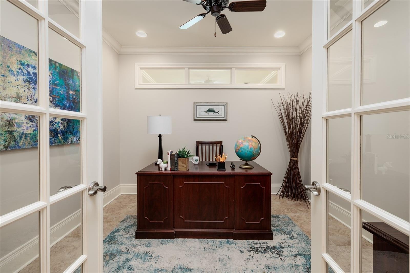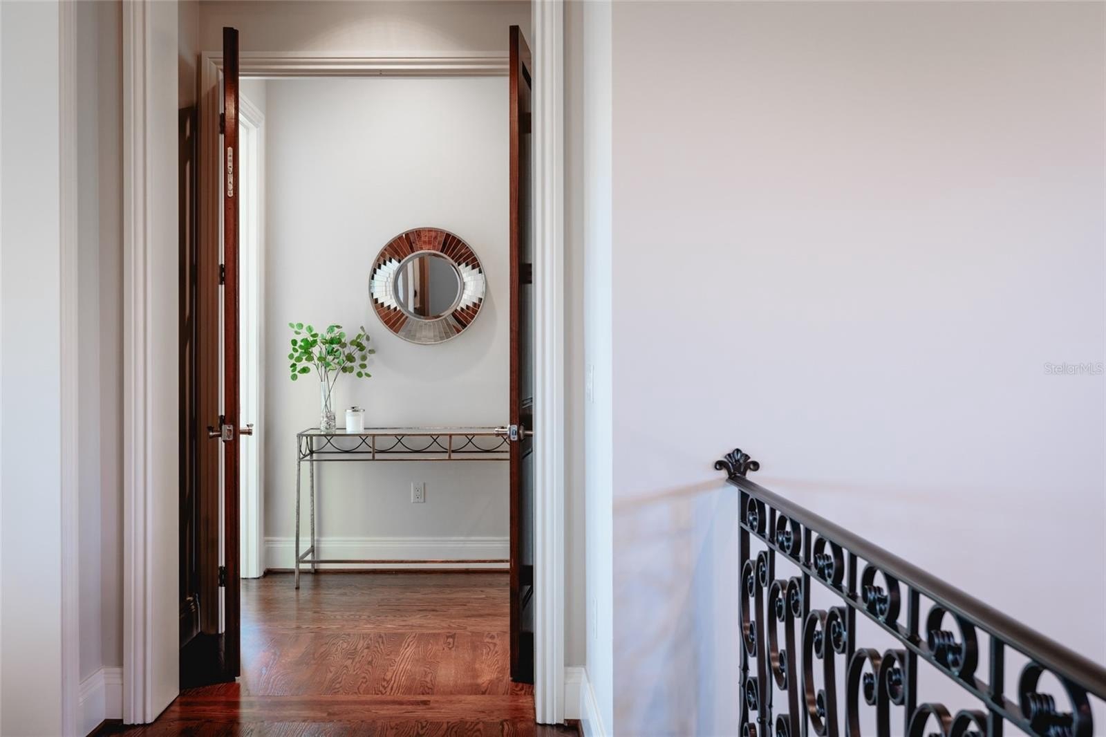 A grand two-story entry with coffered ceilings, transom windows, wrought iron staircase and rich custom millwork sets the tone. Solid core doors, crown molding, and built-ins throughout reflect true quality craftsmanship.