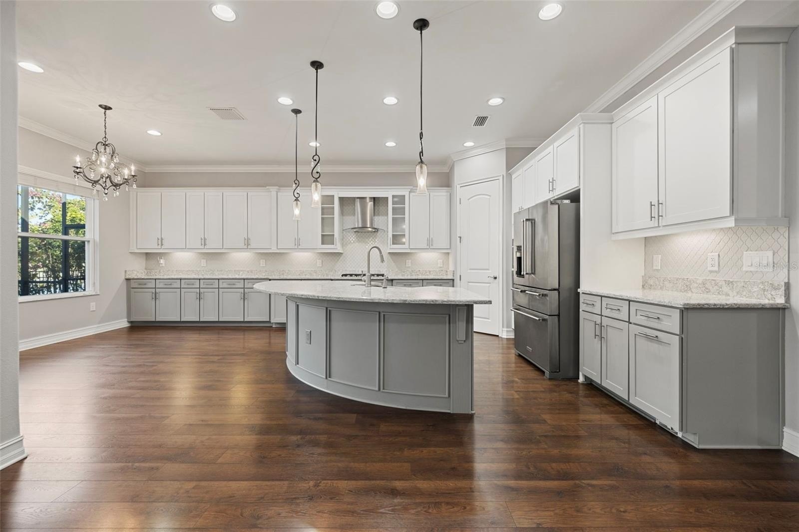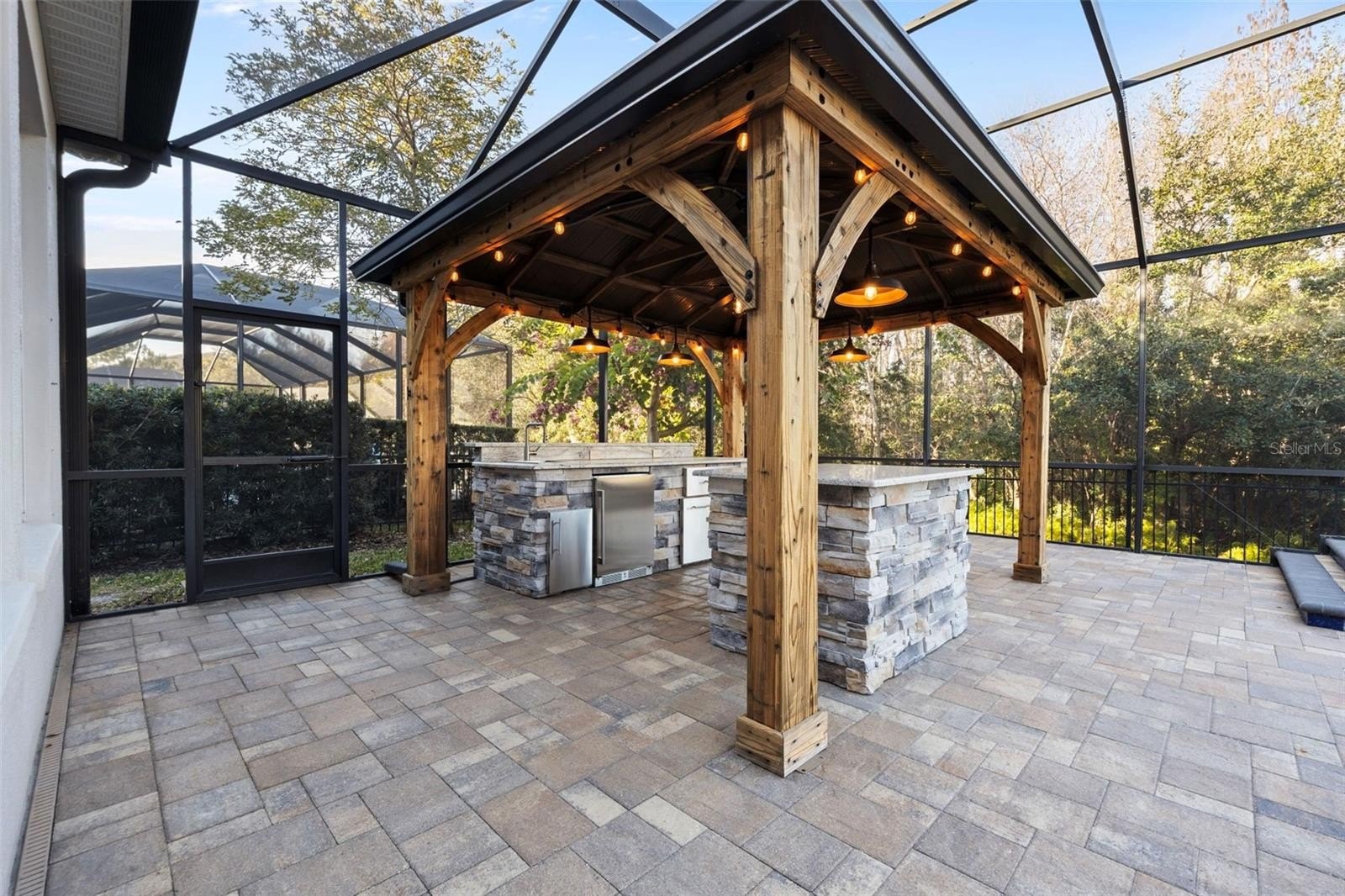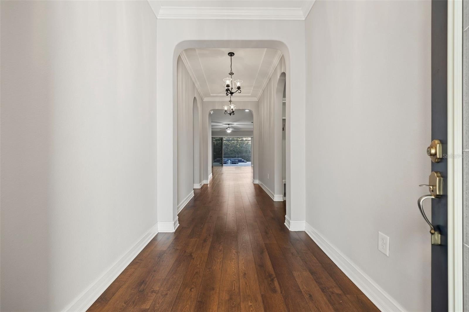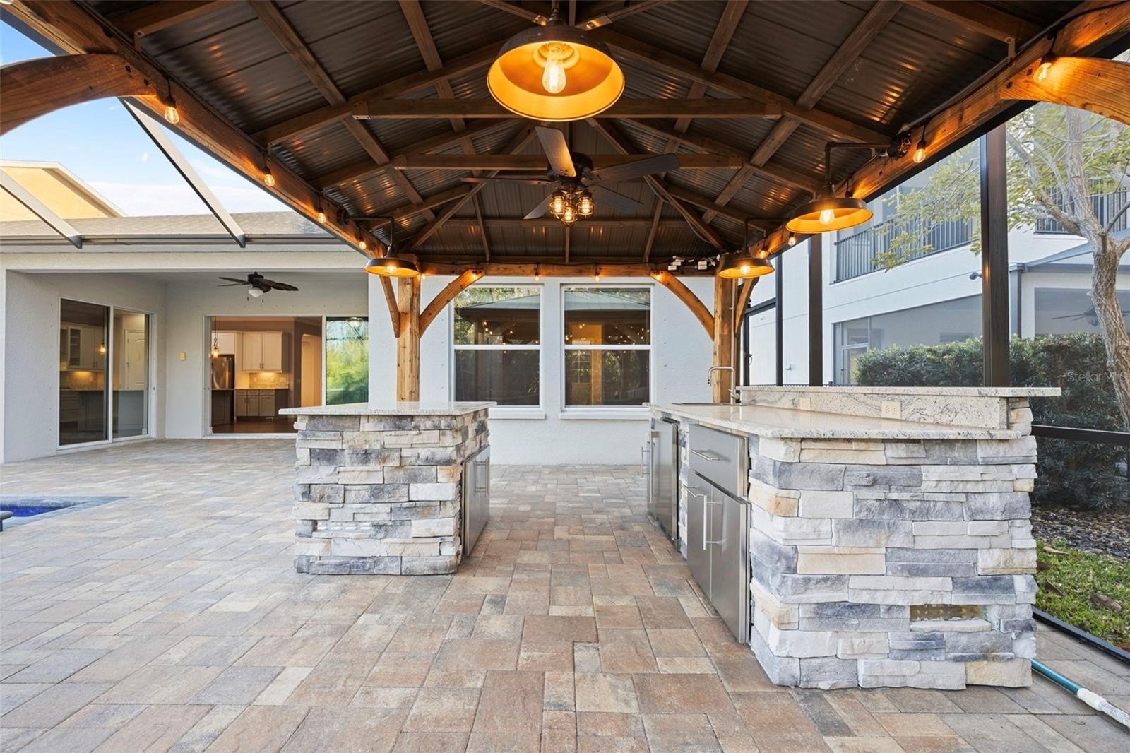 Luxury living in Promenade at Lake Park – Hamilton Model by Standard Pacific. Welcome to this exceptional 4-bedroom, 3-bath residence located in the gated community of Promenade at Lake Park. Perfectly situated on a premium waterfront and conservation lot, this home offers rare privacy, tranquil views, and true resort-style living. Inside, the thoughtfully designed split-bedroom floor plan includes a private guest suite with en-suite bath; ideal for in-laws or extended guests. The home features engineered hardwood flooring, soaring 10-foot ceilings, 8-foot doors, elegant tray ceilings, crown molding, and designer finishes throughout. The chef’s kitchen is a showstopper, showcasing upgraded platinum cabinetry, Cambria quartz countertops, under-cabinet lighting, a Kohler apron-front farmhouse sink, luxury faucet collection, and gourmet stainless steel Whirlpool and KitchenAid appliances. The kitchen flows seamlessly into the great room and casual dining area, highlighted by oversized sliding glass doors that open to the outdoor living space. The primary suite is a private retreat featuring a custom built-in walk-in closet and a spa-inspired bath with quartz and marble finishes, ceiling-height mirrors, soaking tub, and a tiled walk-in shower with frameless glass, bench, and rainfall shower head. A rare and versatile feature is the fully enclosed, climate-controlled third garage (228 sq ft); perfect for a home office, gym, playroom, or meditation space! The two-car garage offers epoxy flooring, overhead storage, insulated impact doors, and an EV charging outlet. Step outside to your private resort oasis featuring an expansive screened lanai, outdoor kitchen with stone and granite countertops, sink, refrigerator, and cabinetry, heated pool and spa, custom multi-level water feature with LED lighting, natural gas fire pit, and brick pavers throughout; all overlooking peaceful water and conservation views. This outdoor living space is ideal for both entertaining and everyday relaxation. Additional premium upgrades include: whole-house generator (including pool), whole-house surge protector, central vacuum, surround sound & lanai ceiling speakers, natural gas throughout, security cameras, water softener, tankless water heater, insulated impact garage doors, gutters and upgraded screen enclosure (2023).
