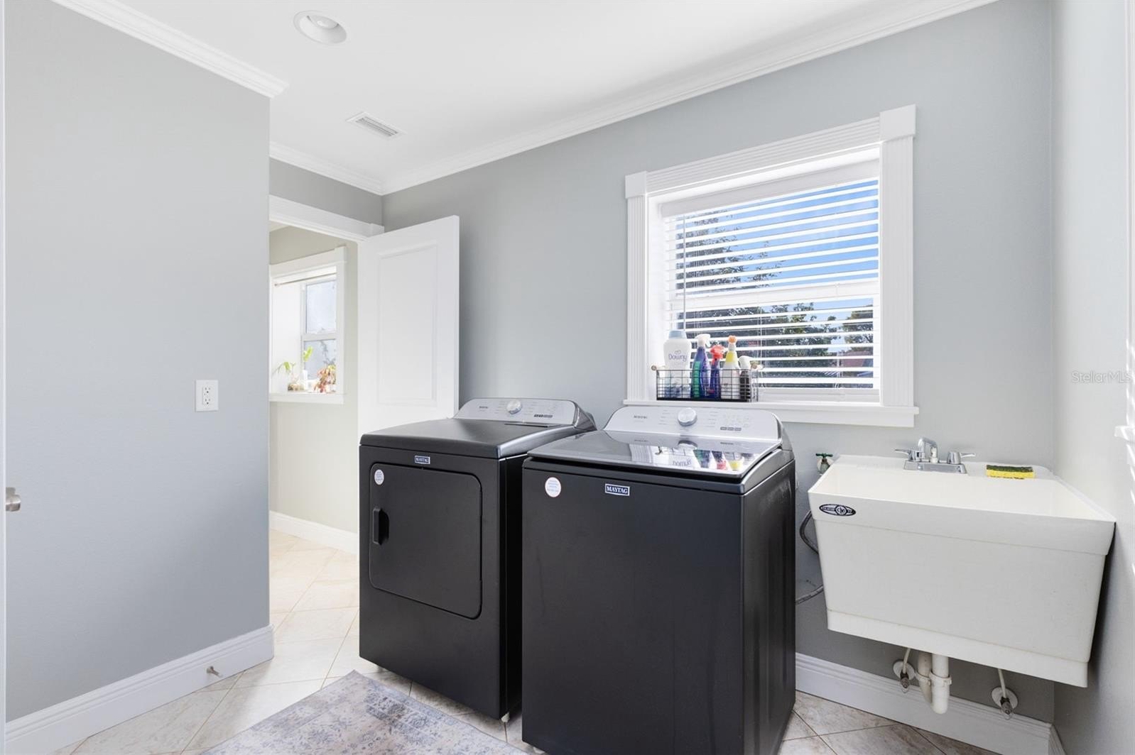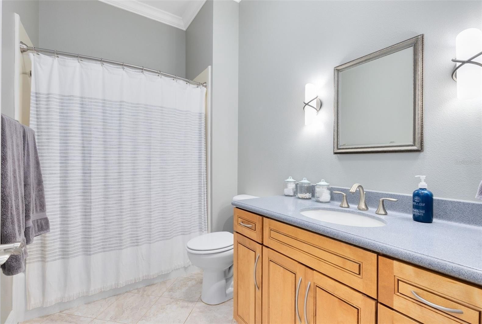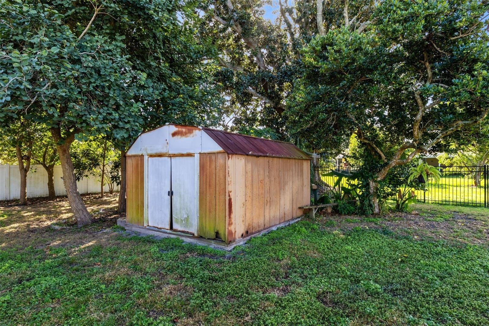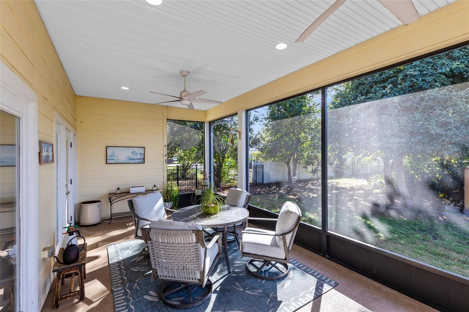 The oversized primary suite provides privacy and comfort with a large closet, spacious bath, and convenient access to the indoor laundry room. Step outside to a large screened-in back porch with ceiling fans, overlooking a fenced backyard with irrigation, brick pavers, a garden area, and a shed on a slab—ideal for outdoor living and storage.