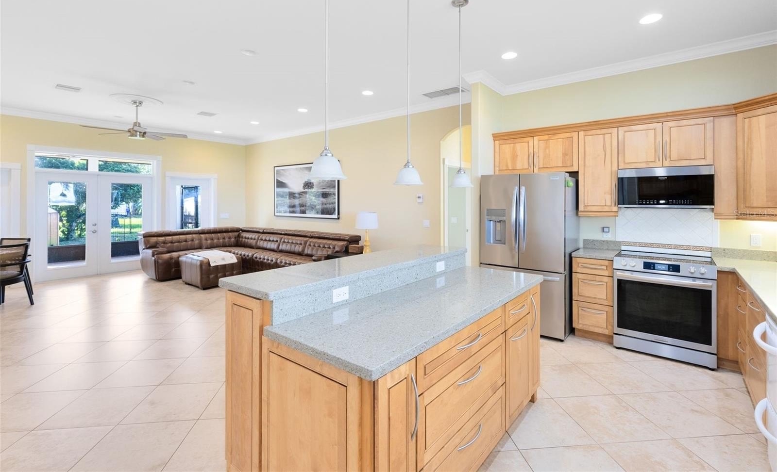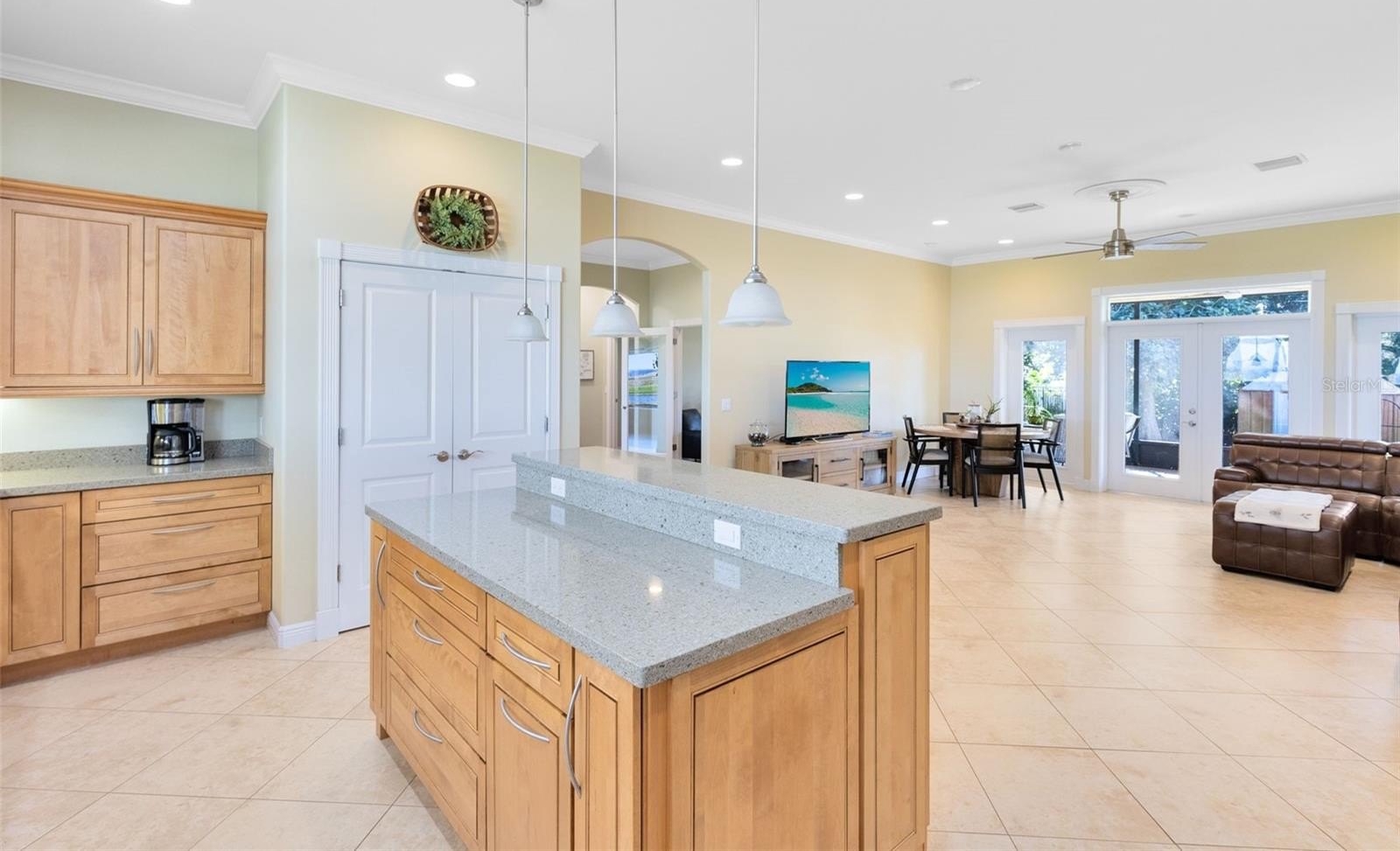 The kitchen offers KraftMaid cabinetry, soft-close drawers, under-cabinet lighting, Silestone countertops, a large pantry with custom shelving, and plenty of functional storage.