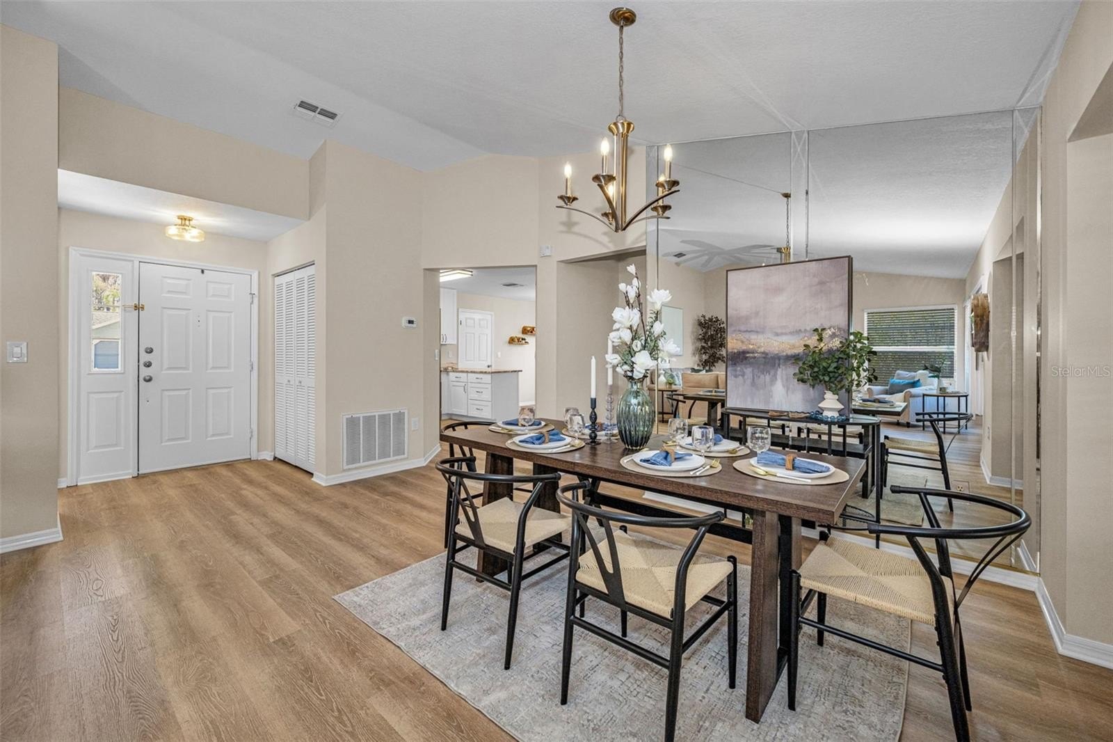 This beautifully updated 2-bedroom, 2-bath home with a 2-car garage is nestled in the desirable Millpond Estates community and offers exceptional curb appeal with fresh interior and exterior paint and a charming pavered walkway. Inside, new luxury vinyl plank flooring, modern lighting, vaulted ceilings, and an open, airy floor plan create a bright and welcoming atmosphere. The living room features sliding glass doors that open to the Florida room with vinyl panel windows, providing effortless indoor-outdoor living, while a separate dining area is perfect for hosting gatherings. The brand-new kitchen is a standout, showcasing white shaker cabinetry, new stainless steel appliances, granite countertops, and a cozy eat-in space for casual dining. The spacious primary suite offers a walk-in closet, and sliding glass doors leading to the Florida room. The ensuite bath features dual sinks and a walk-in tiled shower. A generously sized guest bedroom is complemented by a beautifully updated guest bathroom, offering comfort and privacy for visitors. Outdoor living is enhanced with the paver brick patio ideal for relaxing or entertaining. Brand NEW A/C & WATER HEATER, Roof 2012, two car garage, and more...Residents of Millpond Estates enjoy access to outstanding amenities including a clubhouse, pool, spa, game room, library, horseshoe courts, and scenic walking trails. Conveniently located near top-rated schools, shopping, dining, medical facilities, beaches, airports, golf courses, and all the best of the Florida lifestyle, this move-in-ready home delivers comfort, style, and a great location!