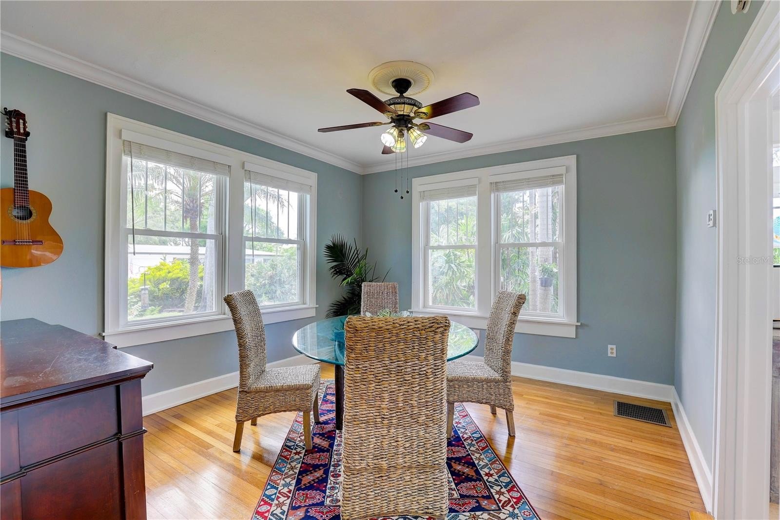 1920's Craftsman style UPDATED HOME with detached apartment (ADU). WIRING AND ELECTRIC updated by previous owners in 2005 and HVACs added in 2017. Current owners added tankless water heaters and new roofs (2023 ADU and 2025 house). PROPERTY: High elevation (55+ ft), non-evac, X-zone, 1.5 lots measuring 9,525 sq ft with privacy walls and gates. LANDSCAPE: Mature plantings and 4,000 sq ft of pavers, multiple entertaining areas, open deck, covered patio, pond and waterfall create a peaceful and private backyard retreat. Irrigation system with new well pump. 1ST STORY: Brick paths lead to the classic FRONT PORCH and into the LIVING ROOM with original hardwood floors and a wood burning FIREPLACE surrounded by 4 built-in bookcases. The DINING ROOM or den is adjacent to the living room. Classic touches include wide window casings, crown moldings and 6” baseboards, KITCHEN: The 20' farmhouse style kitchen with bead board and exposed beams features a custom-built breakfast booth overlooking your tropical oasis, with deep storage in booth benches. Downstairs BATHROOM has a very large handicap-accessible shower. UPSTAIRS has 3 bedrooms and 1 bath with tub/shower. The traditional glass doorknobs and the mullions on the front windows fit right in with ST PETERSBURG'S CLASSIC HOMES. Freshly painted exterior. Each floor of the main home has its own AC unit. PERMITTED ADU guest quarters with kitchen and bathroom, artfully finished with vaulted ceilings, and exposed beams with its own mini-split AC and separate laundry. PARKING: Private gated driveway off the alley for the ADU, 3-car brick driveway off 13th Ave for the house. LOCATION: 15 minutes to downtown St Pete, 15 minutes to the beaches, 7 minutes to Tyrone Square mall and restaurants.