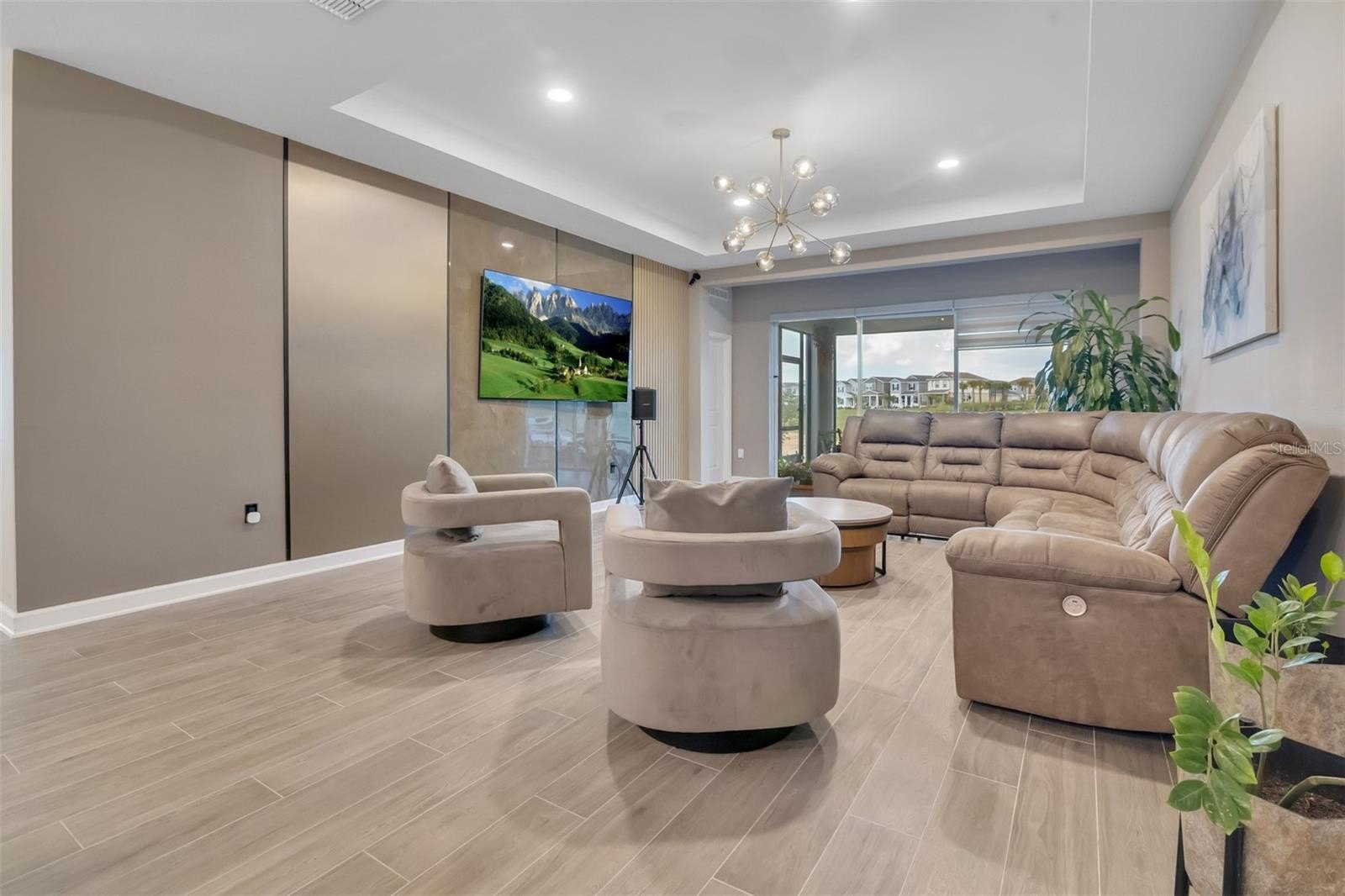 Additional upgrades include a custom-designed laundry room and pantry with cabinetry, smart washer and dryer, modern light fixtures, electric blinds, a decorative TV accent wall, interior and exterior security cameras, integrated exterior LED roofline lighting, epoxy garage flooring, and River Rock flooring at the front entry and lanai.